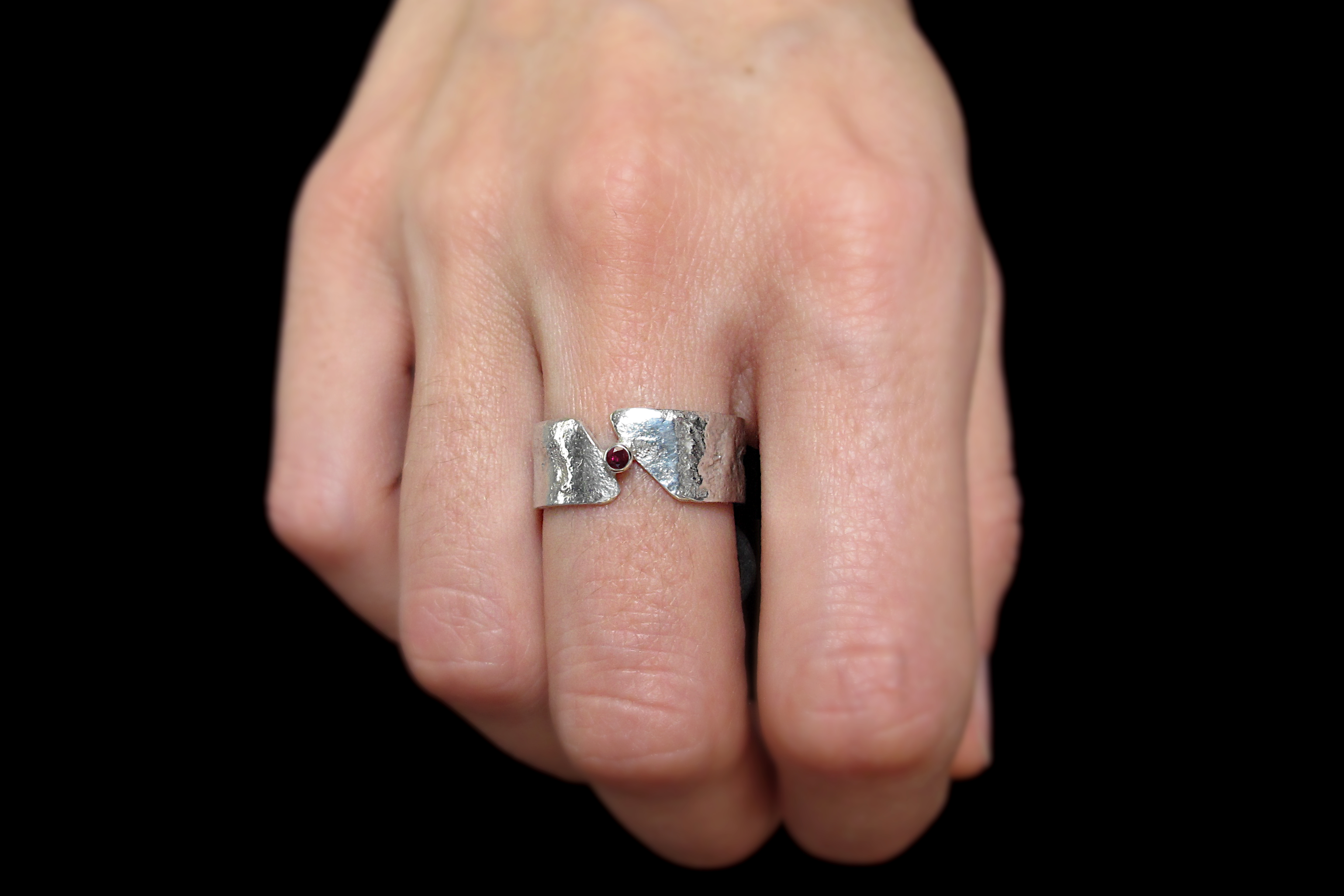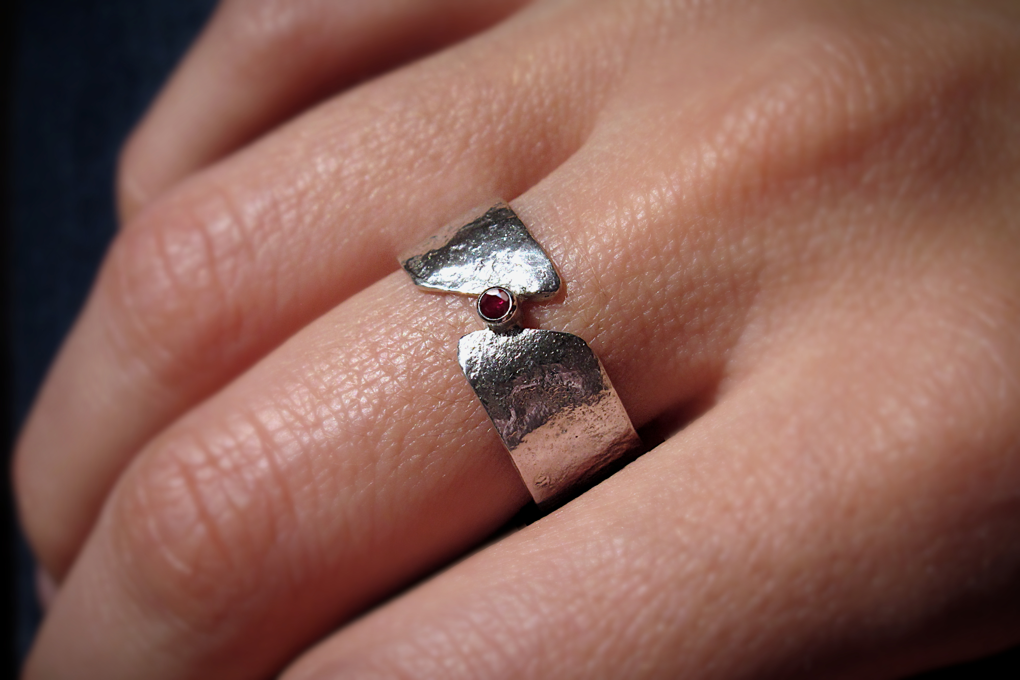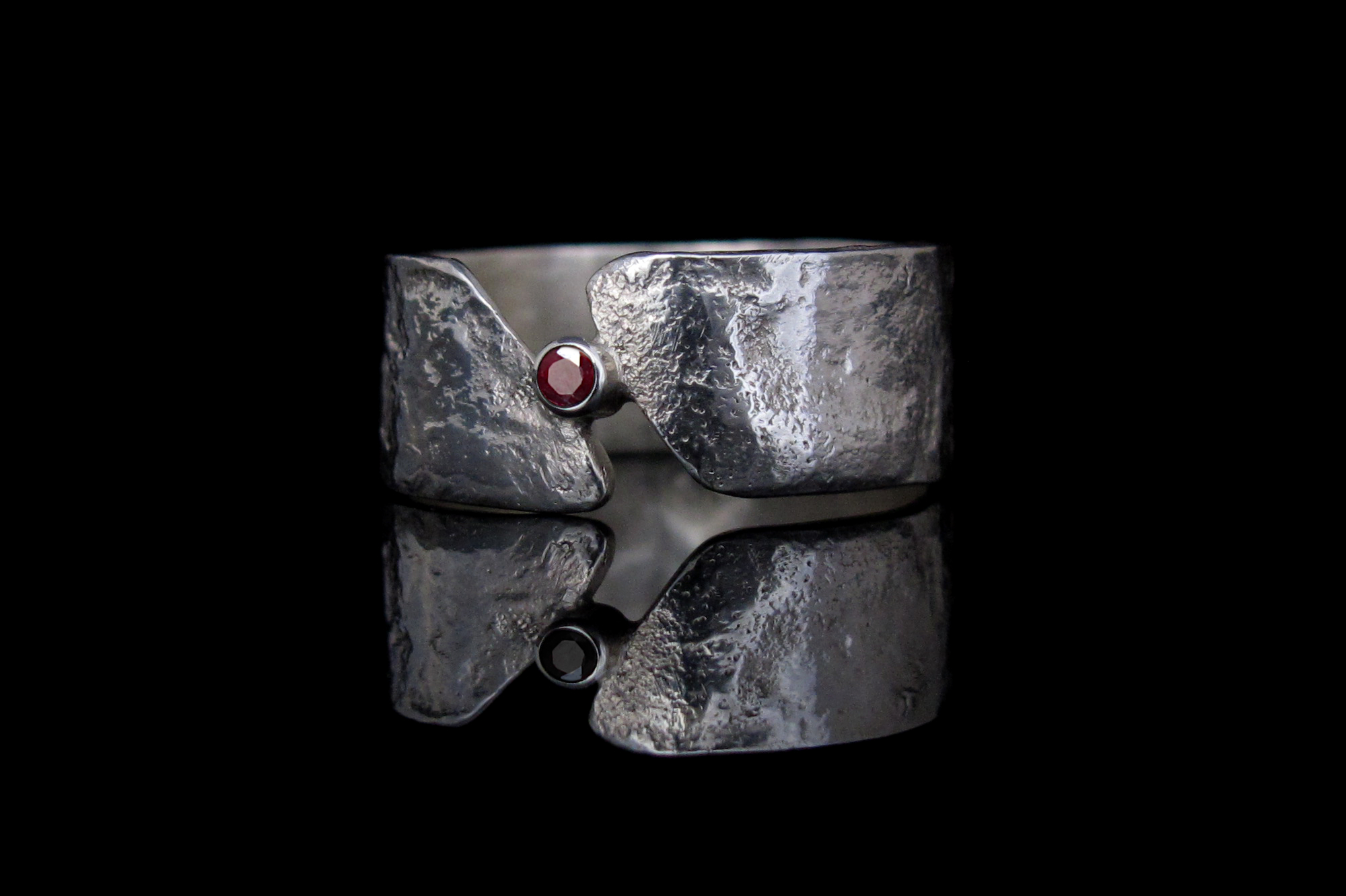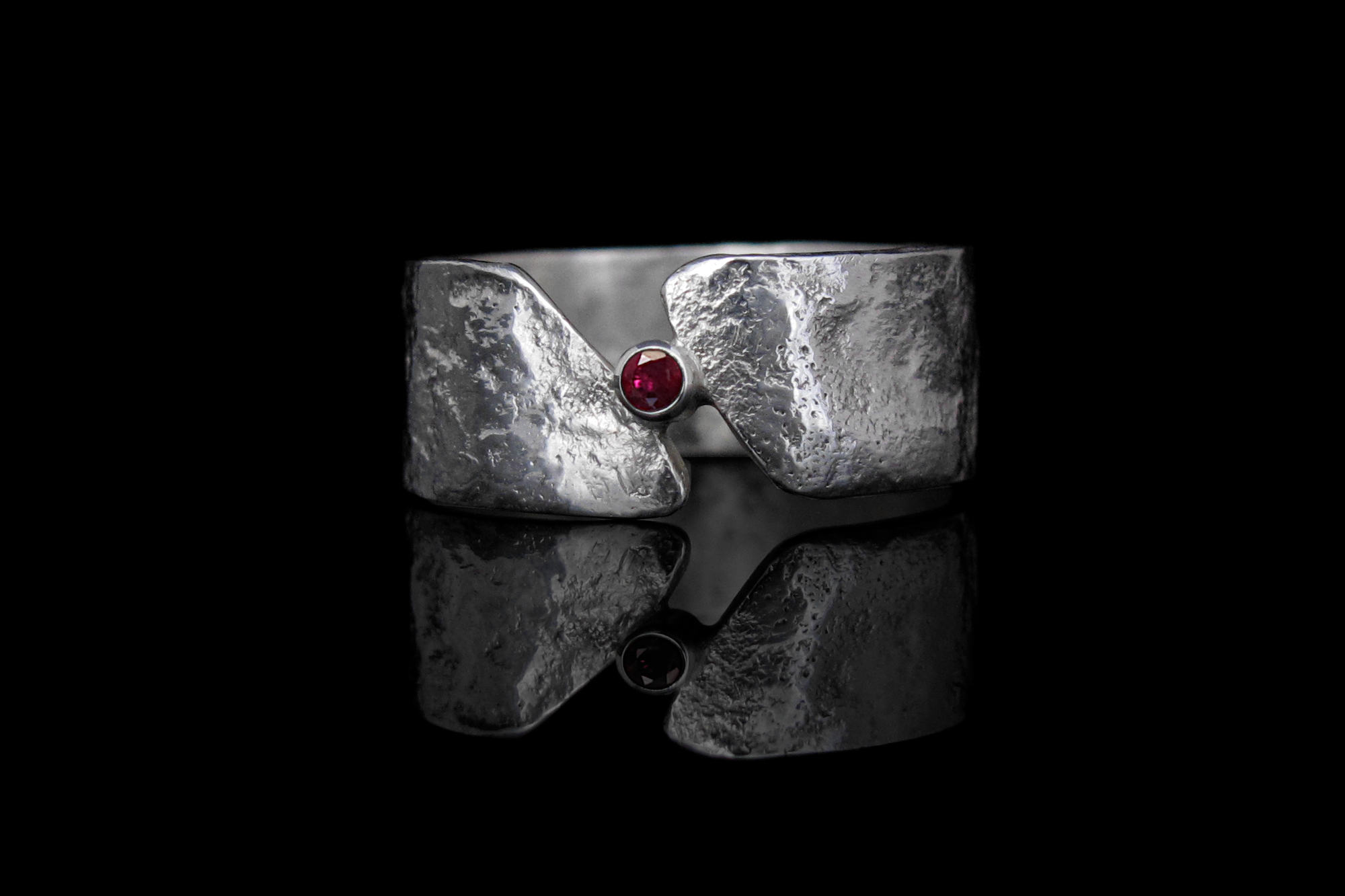 Wide Sterling silver ring with rustic texture and a genuine diamond-cut Ruby.