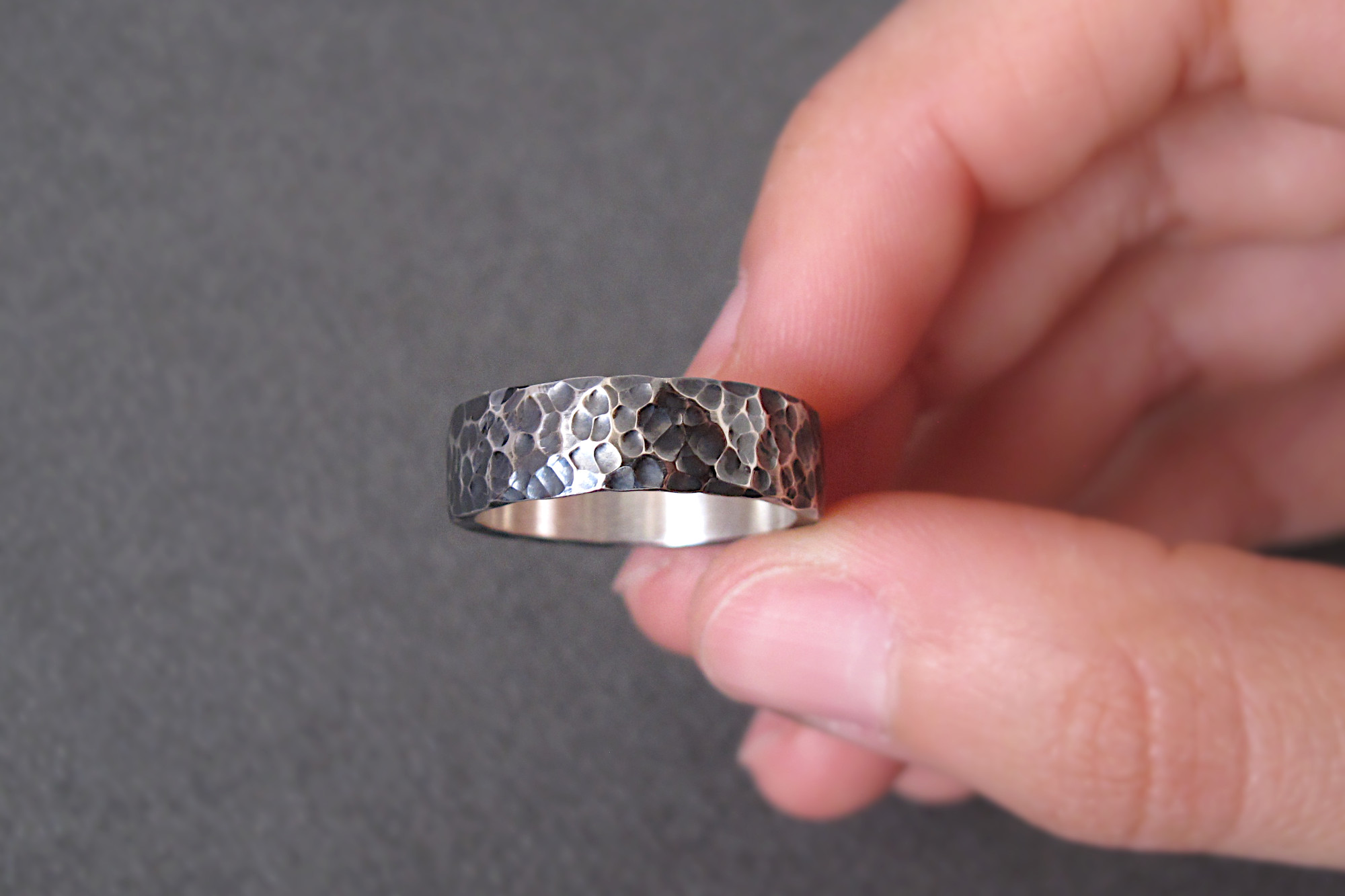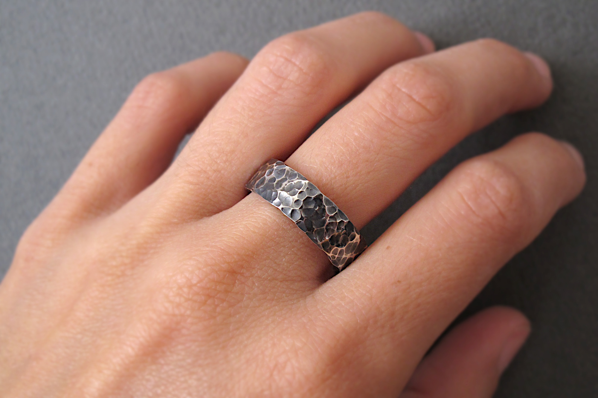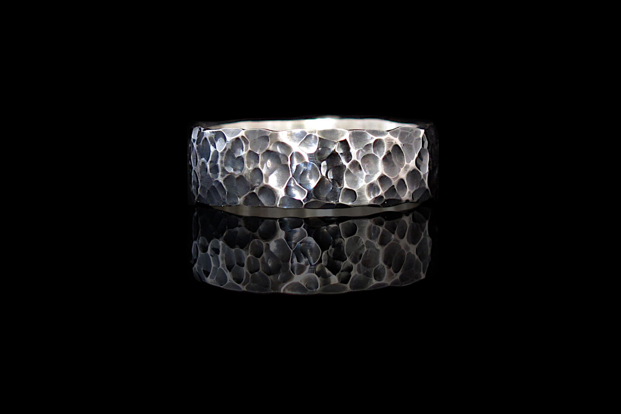 This is a chunky Sterling silver ring with hammered texture and patina, which adds contrast between the indentations and the polished surface. This ring can be worn by men and women alike, as it is chunky enough to look great on a larger finger, while it also suits a smaller hand as more of a statement ring.