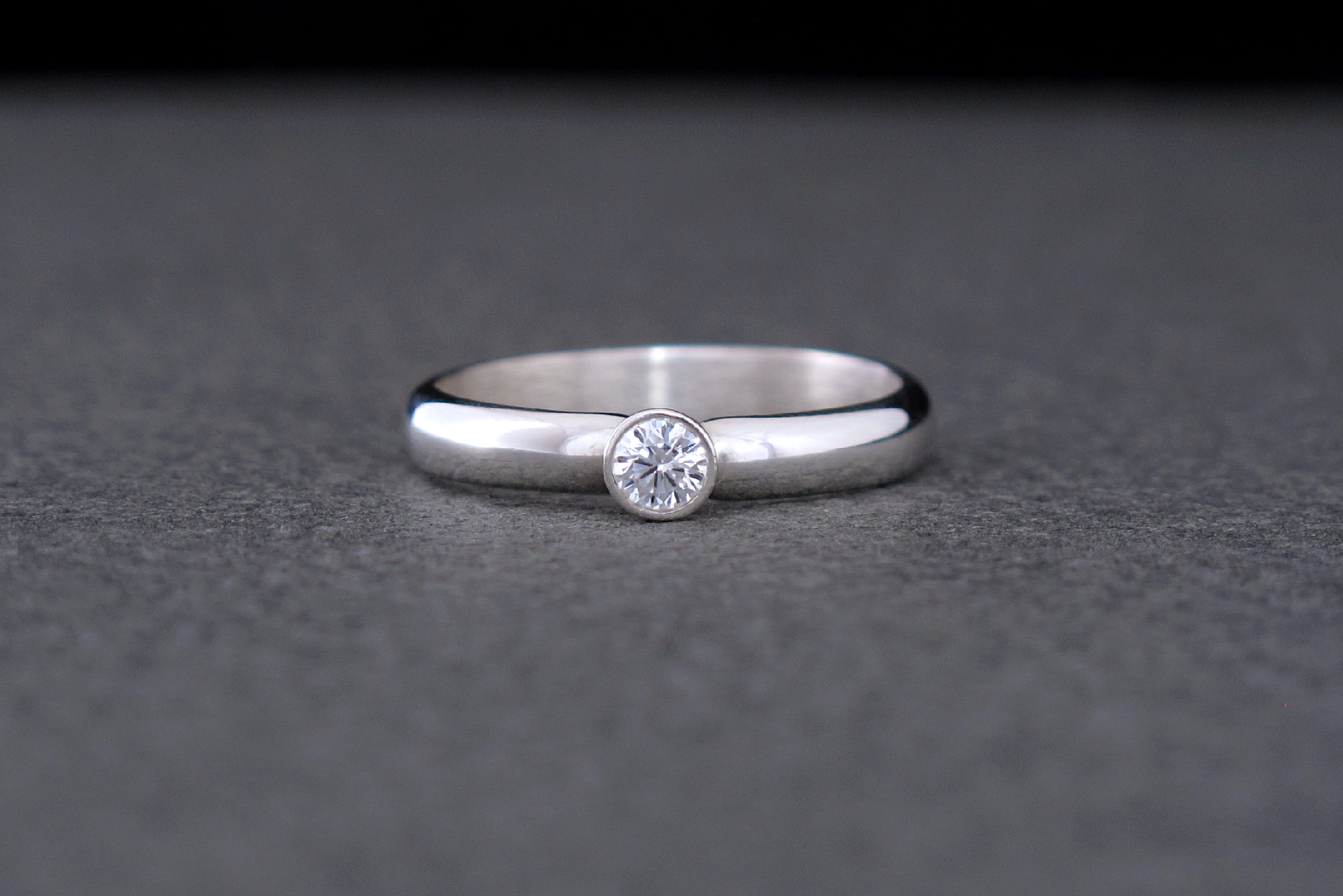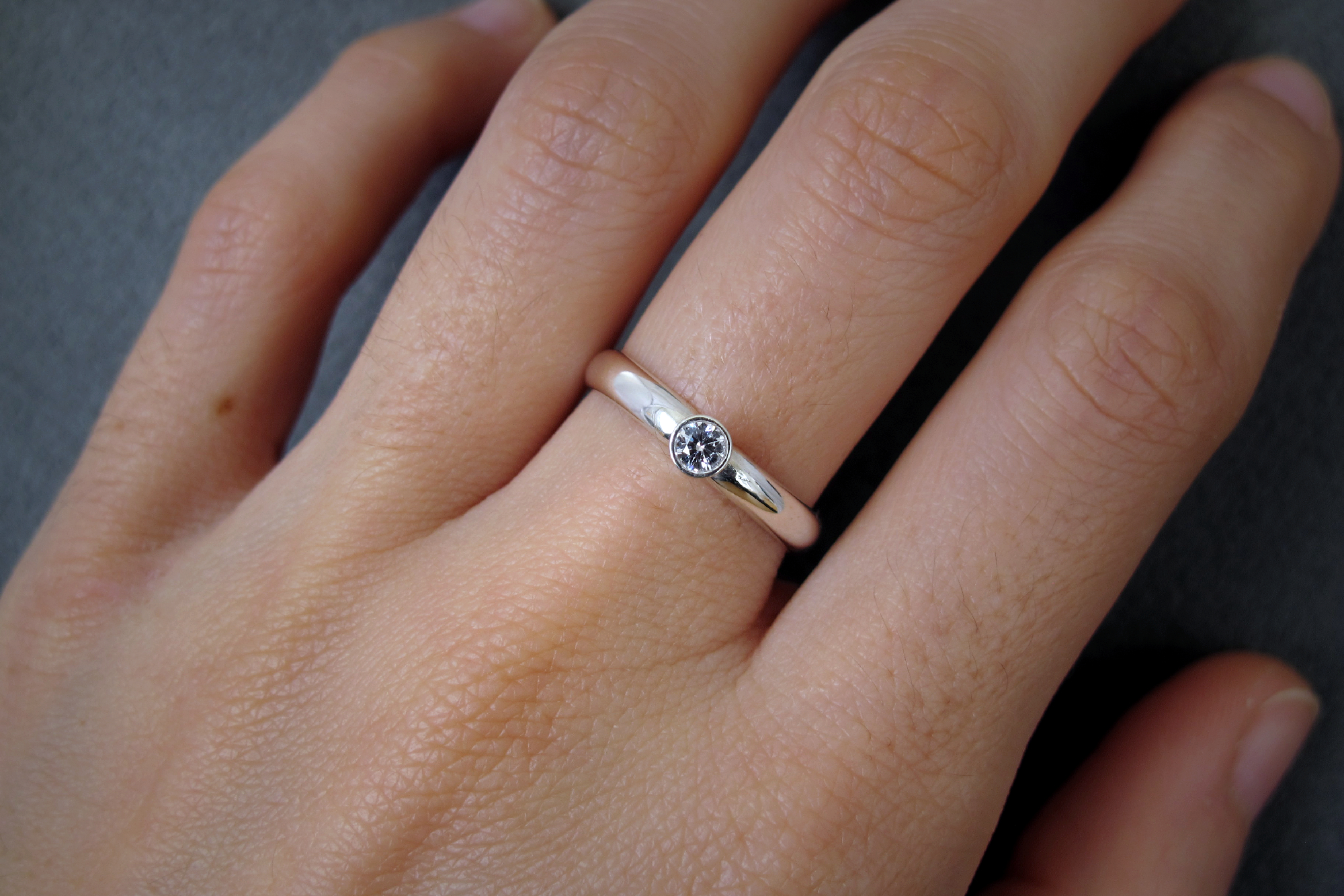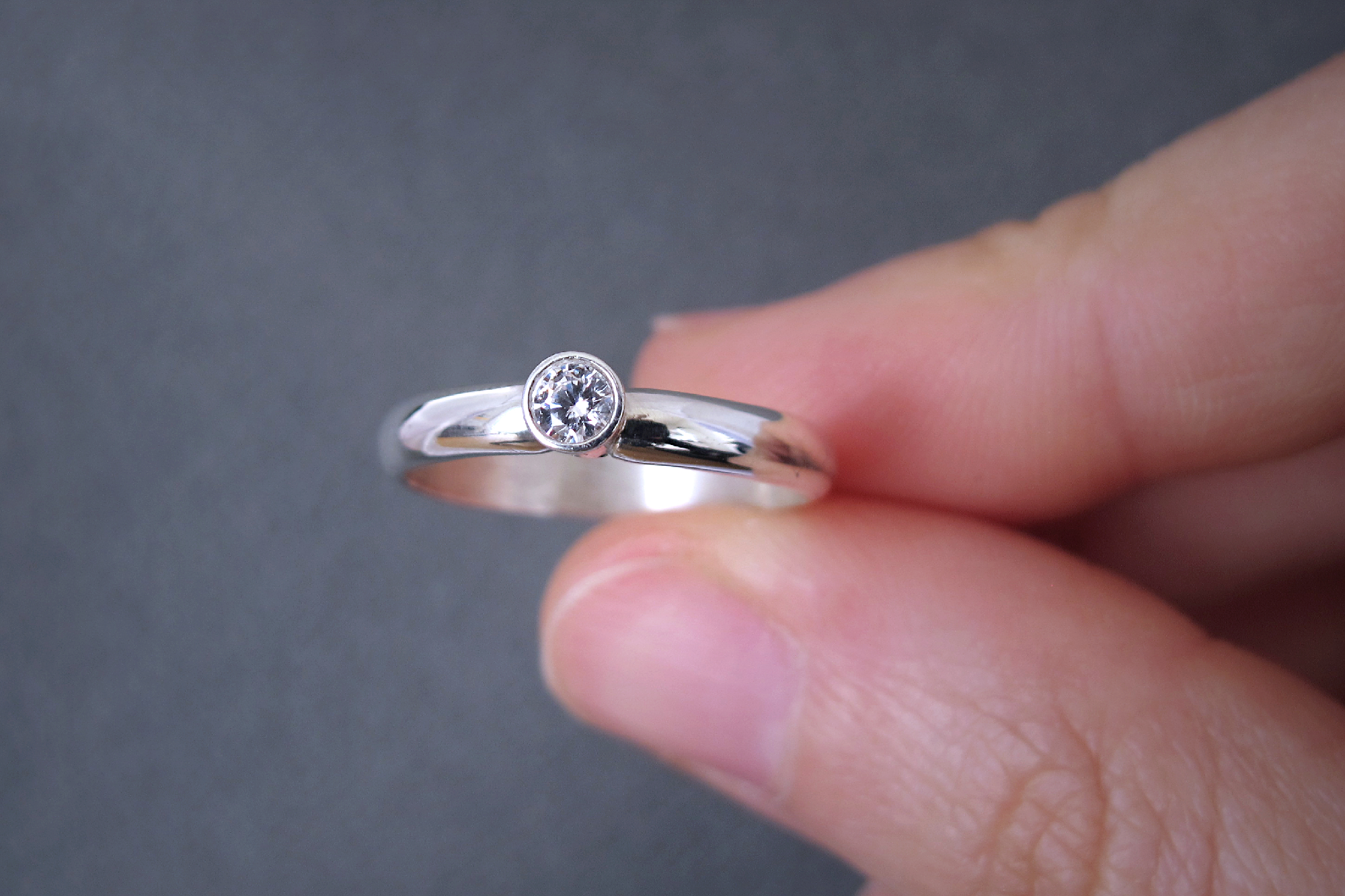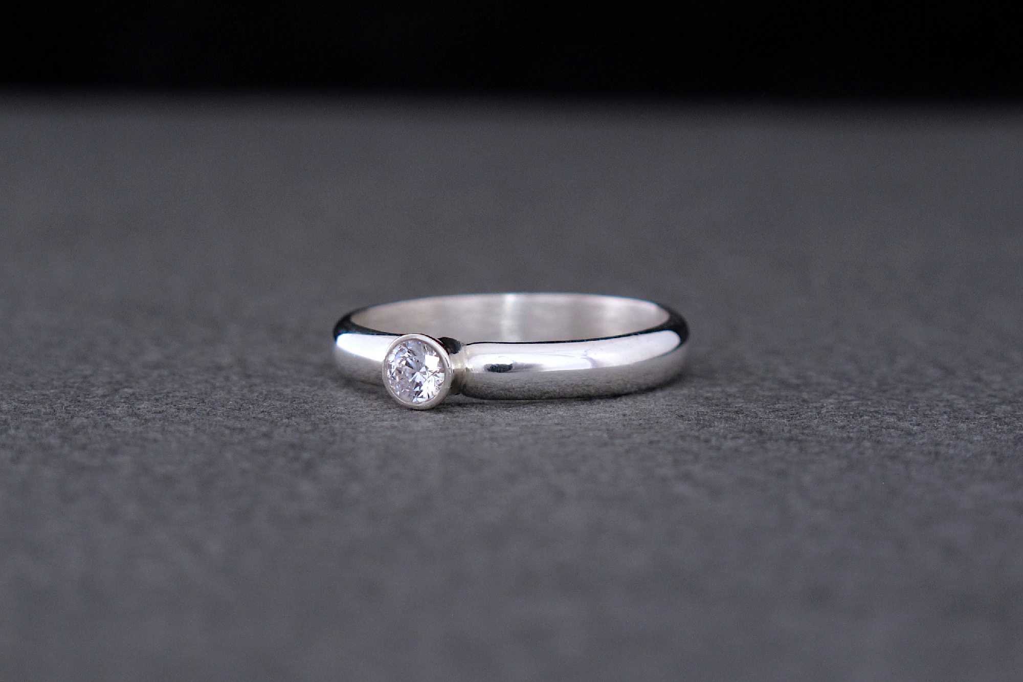 Hand made Sterling silver ring with an ethically-sourced bright SI Diamond. This ring has a comfortable D-shaped band, ideal for everyday wear. The stone is set in a bezel and the whole piece has a polished finish, making this an elegant and timeless piece, as well as a sustainable alternative to traditional engagement rings or promise rings.