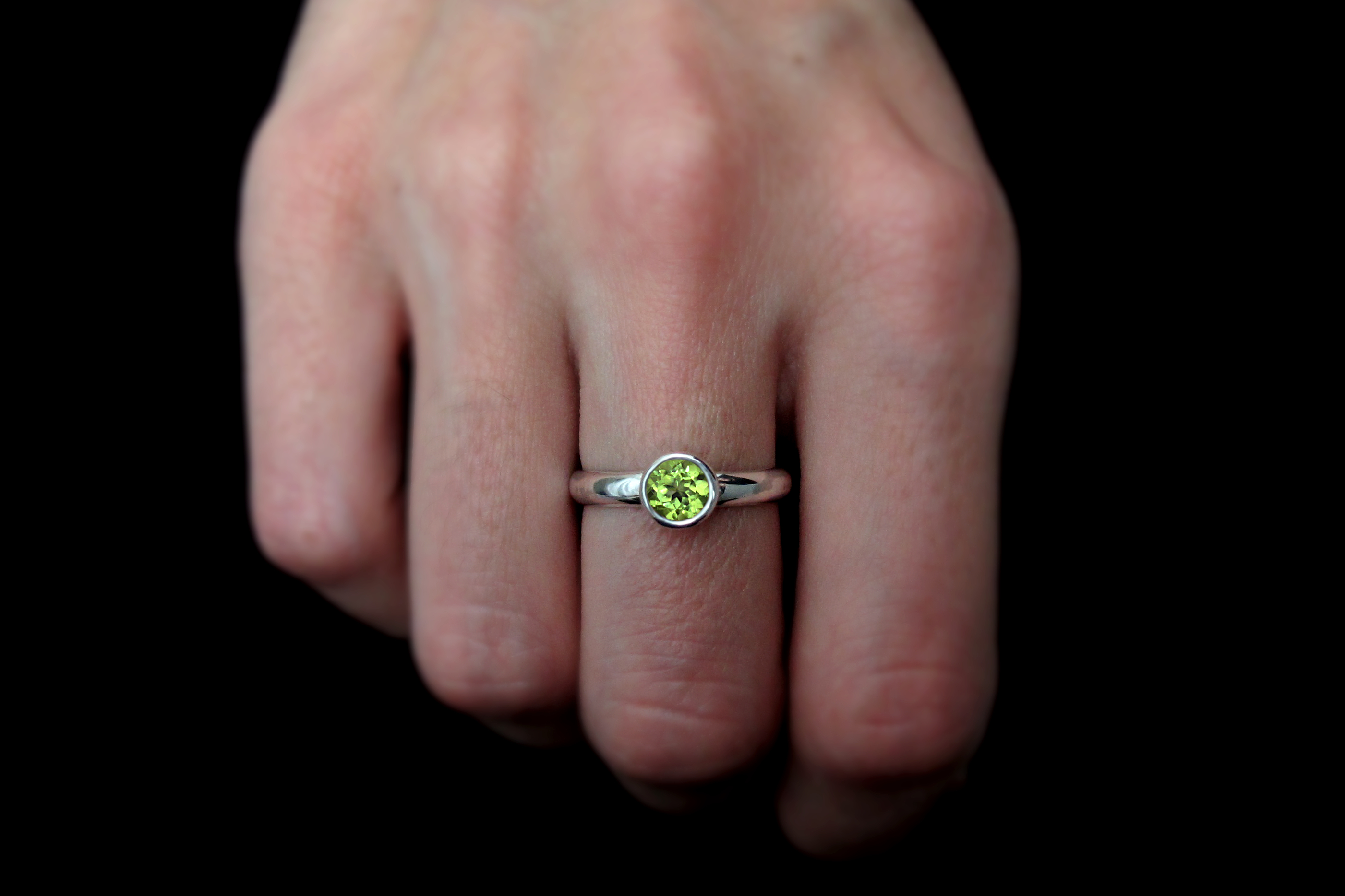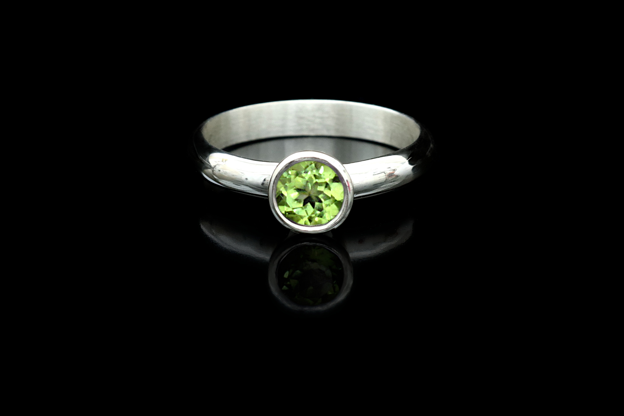 Sterling silver ring with a genuine diamond cut bright Peridot. The gemstone is set in a hand forged bezel that fits each stone perfectly and keeps it secure, hugging the stone all the way around. The band is a comfortable D profile, great for everyday wear. This ring is perfect as an engagement ring, a gift to someone special, or as an addition to stacking rings.