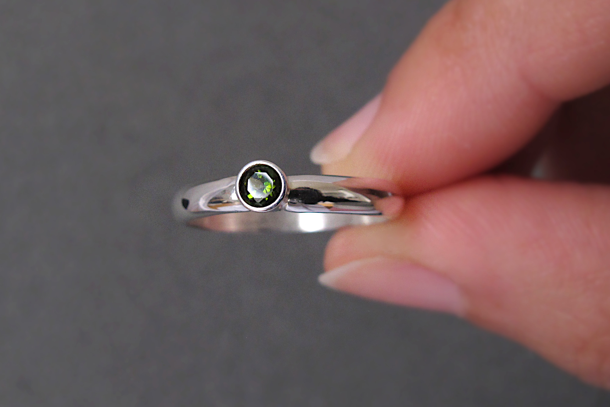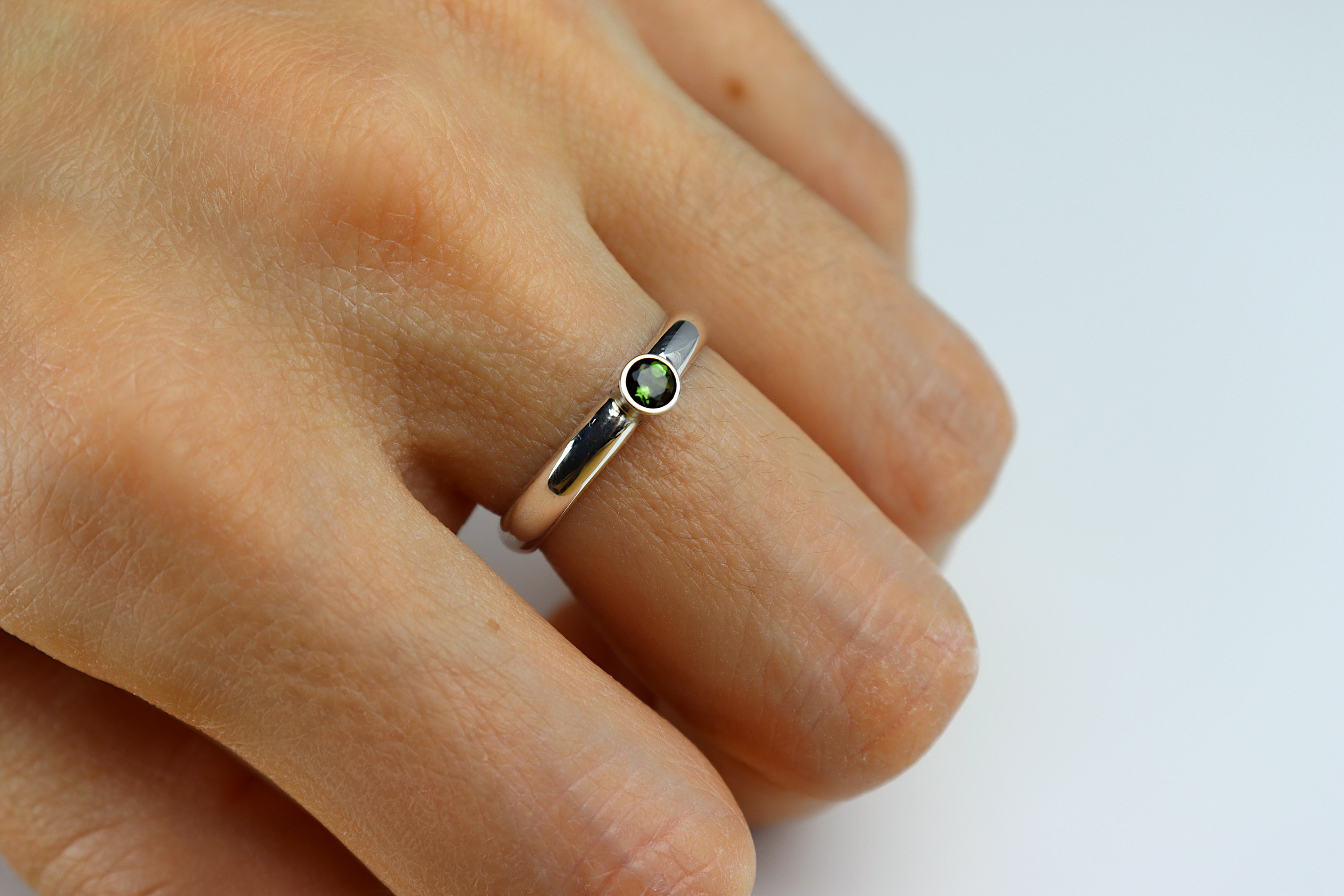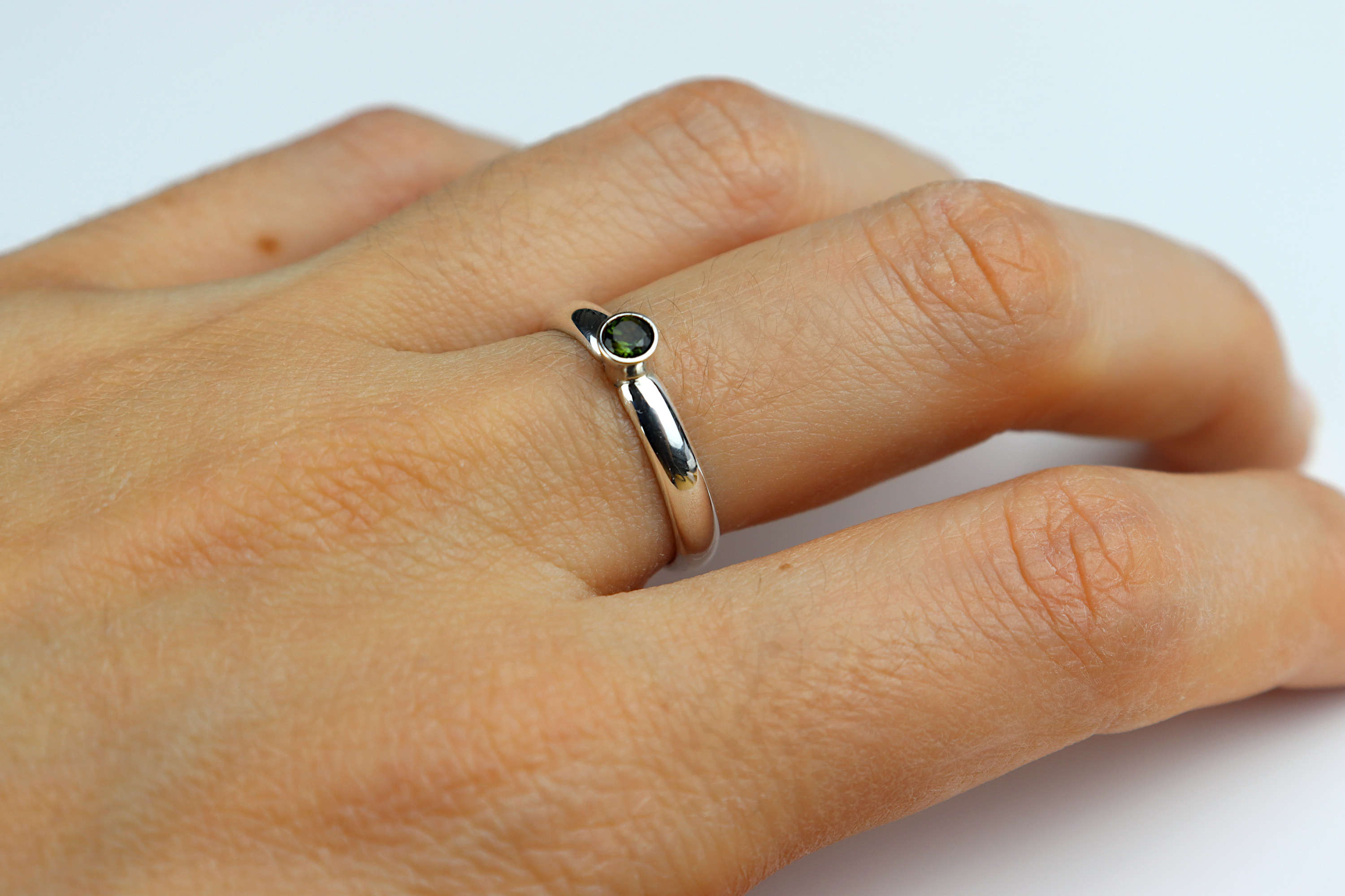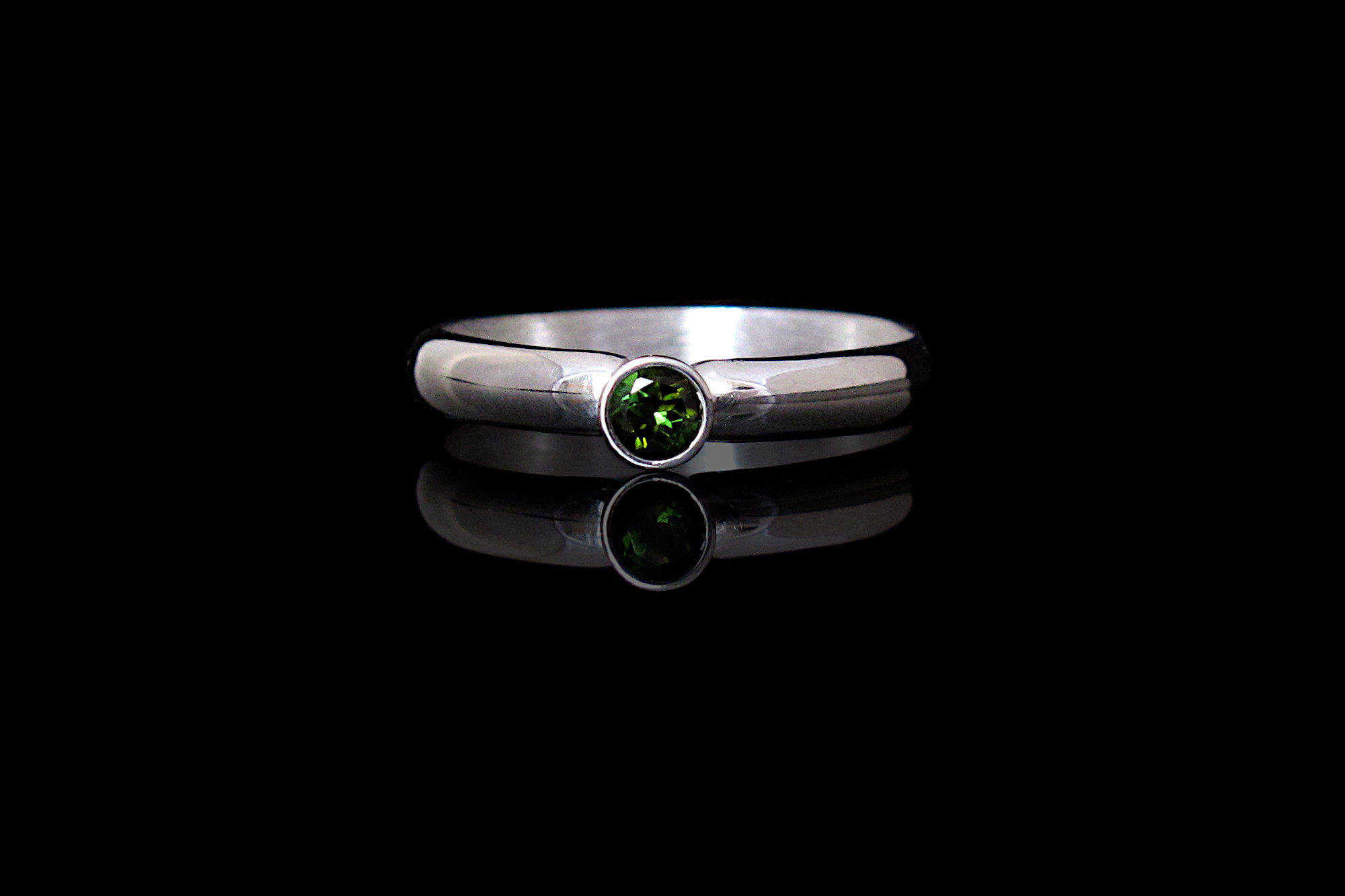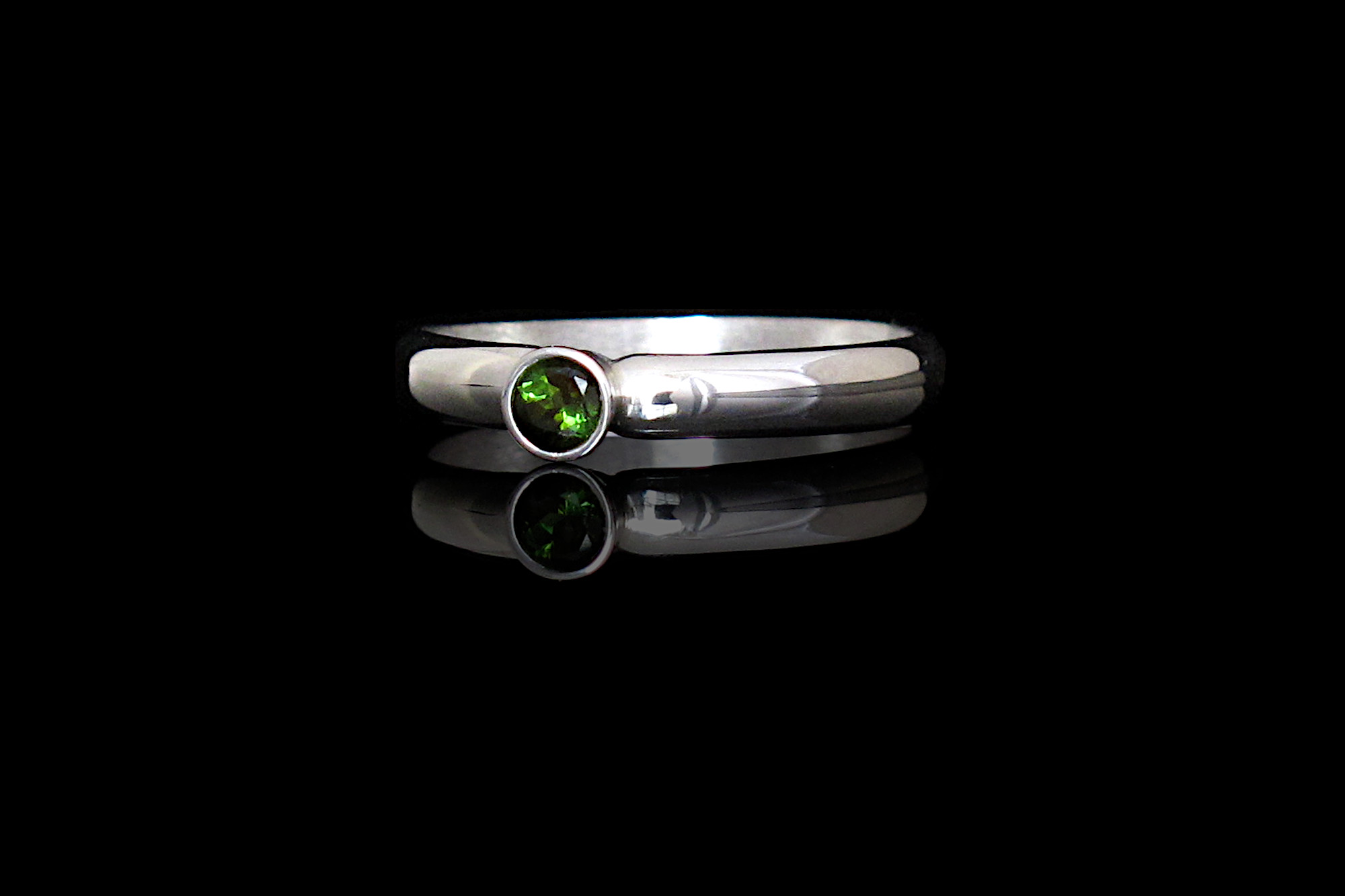 This is a Sterling silver ring with a Green Tourmaline. The gemstone is a deep green translucent and bright stone, and the band is a comfortable D shaped band great for everyday wear.