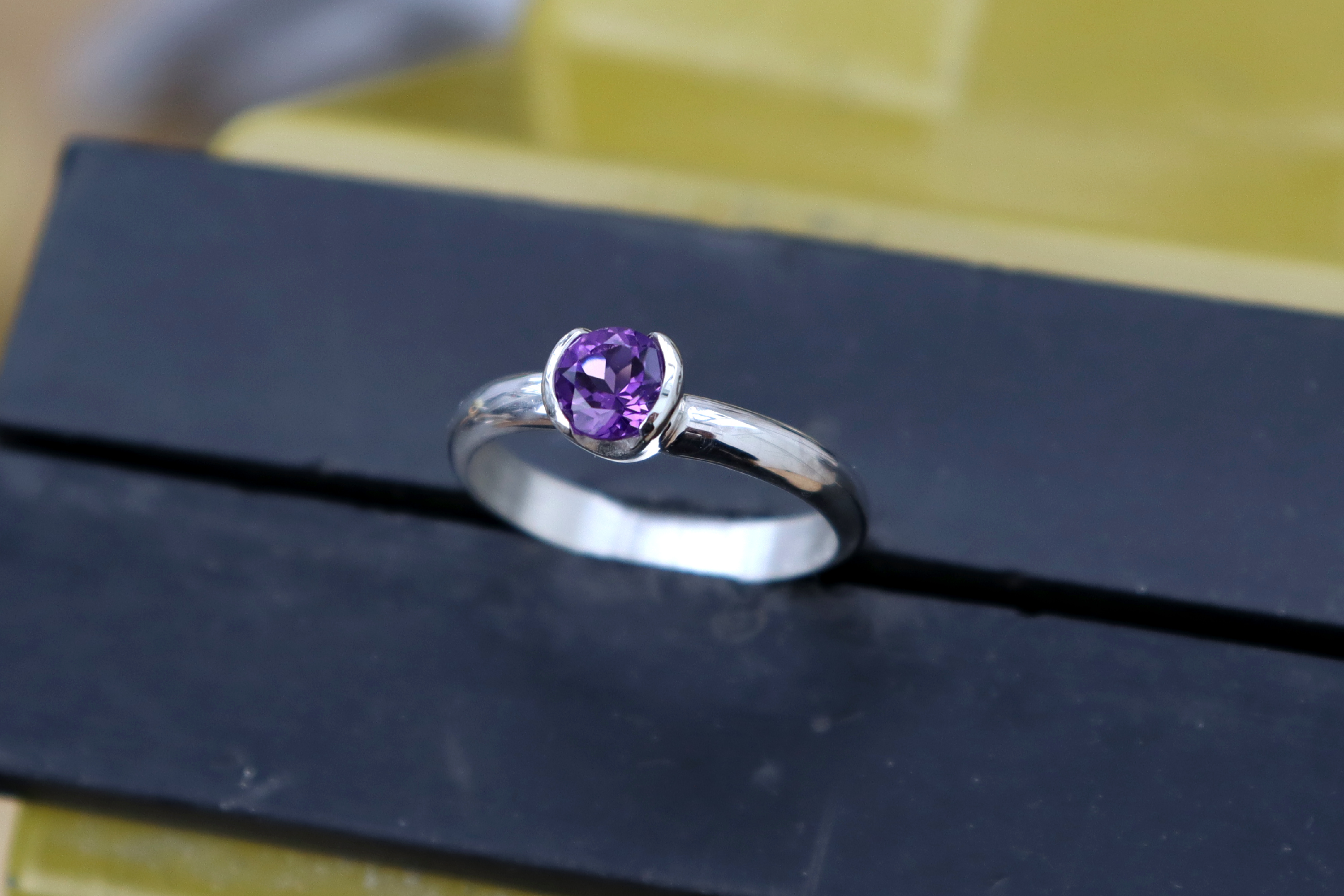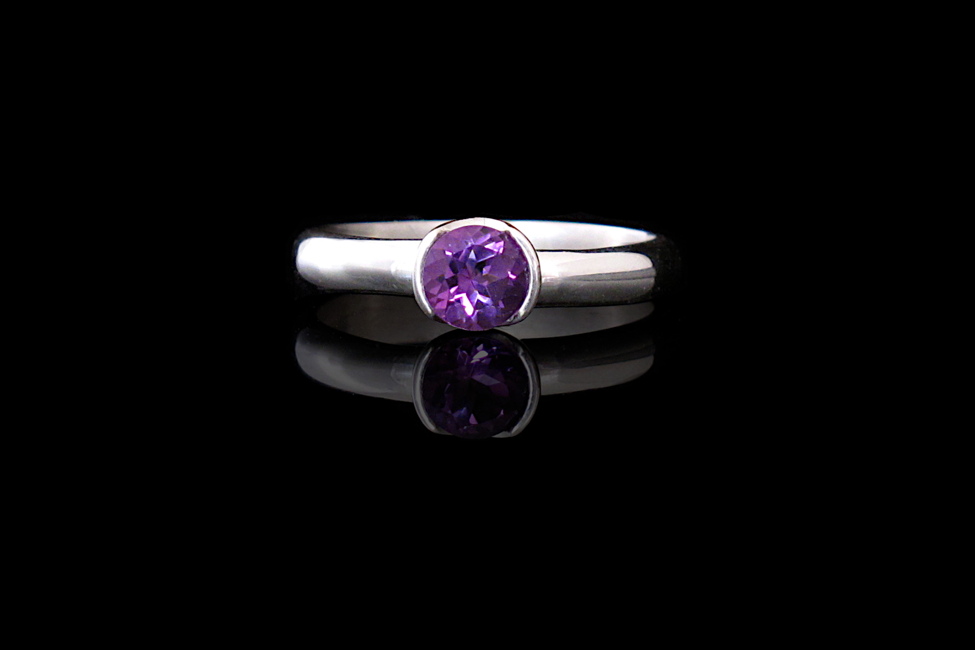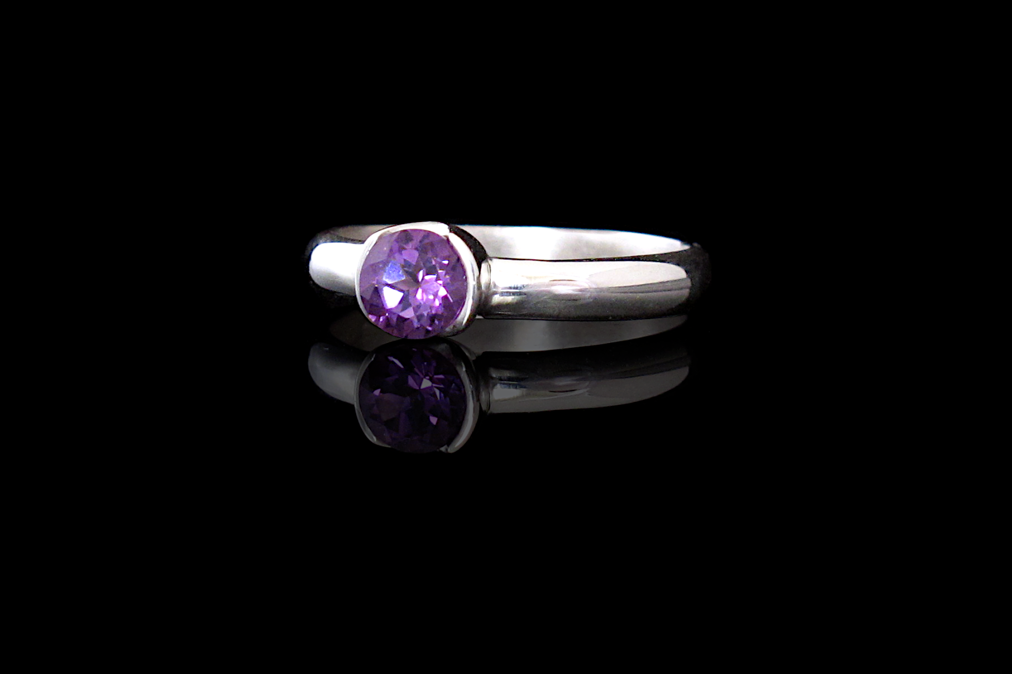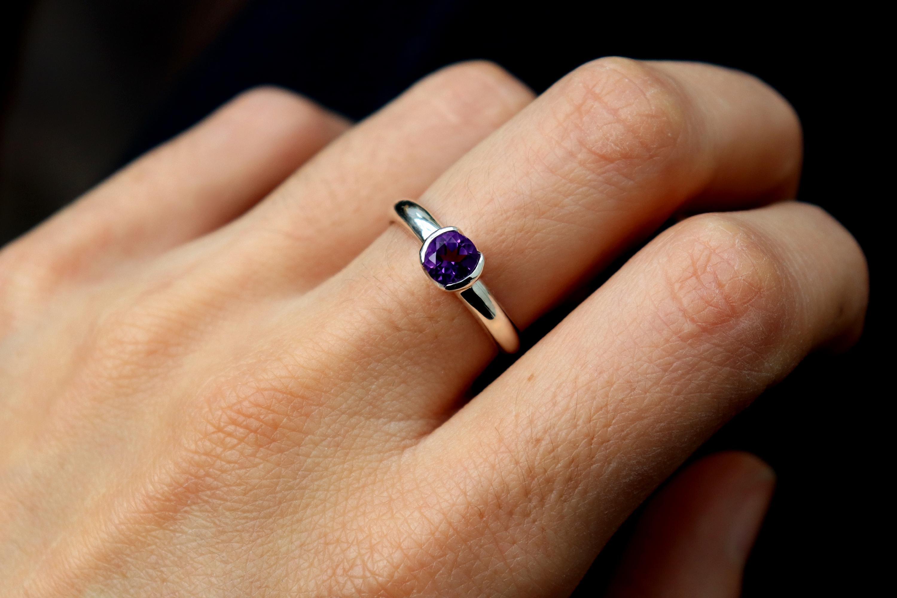 Sterling silver ring with a genuine diamond cut bright Amethyst. The gemstone is set in a hand forged bezel that hugs the Amethyst from its sides, exposing part of the stone for extra shine and a modern look. The band is a comfortable D profile, great for everyday wear. This ring is perfect as an engagement ring, a gift to someone special, or as an addition to stacking rings.