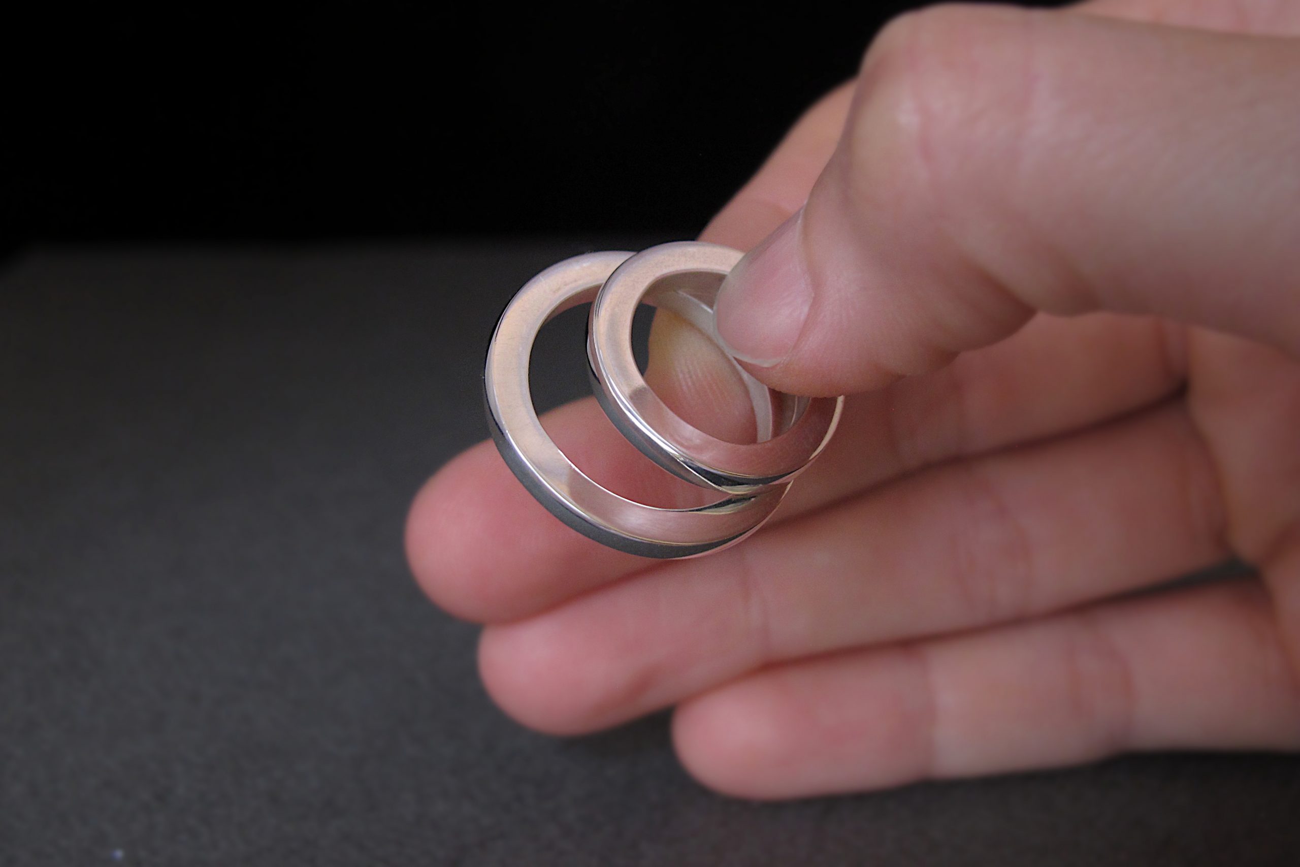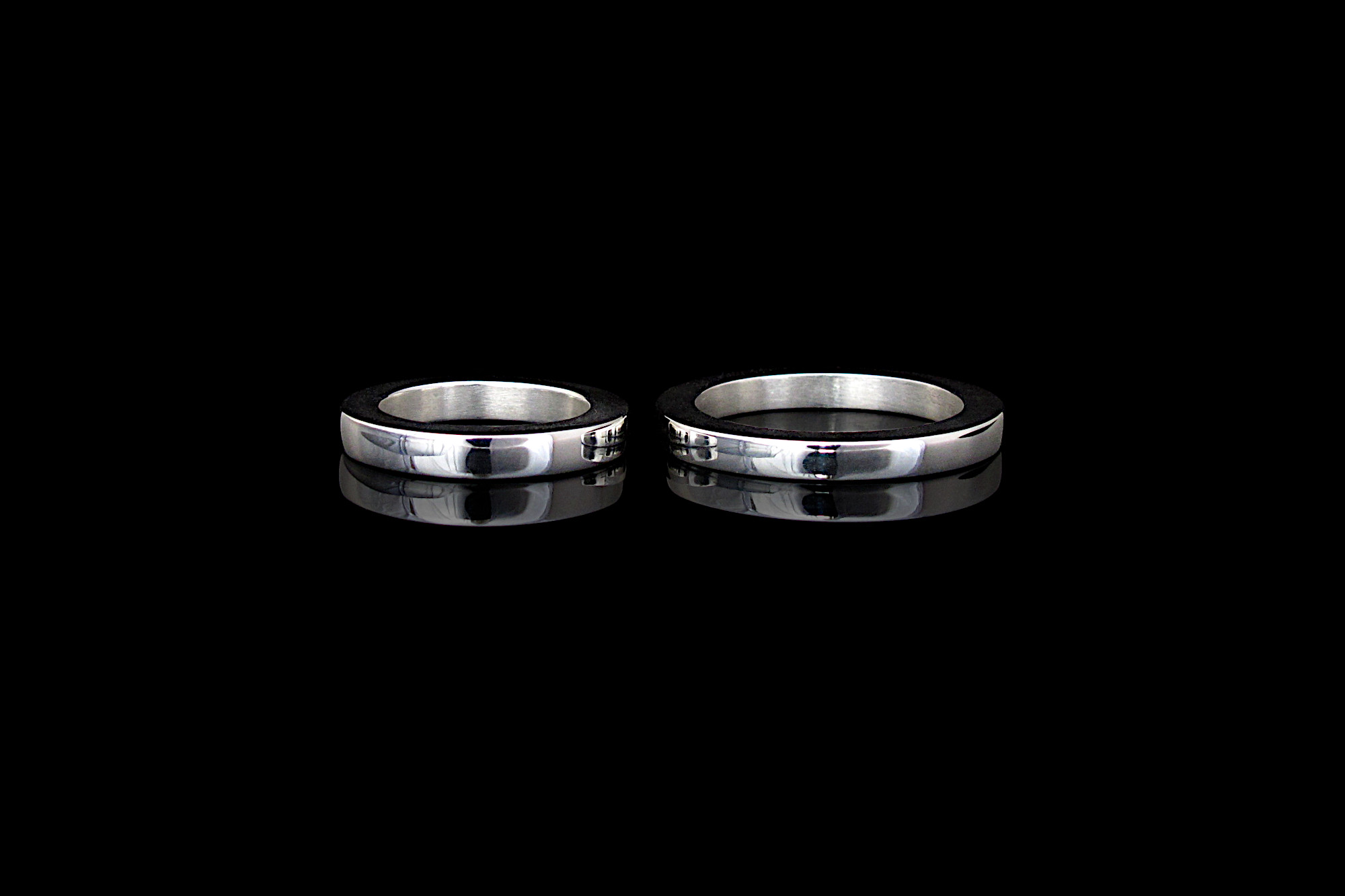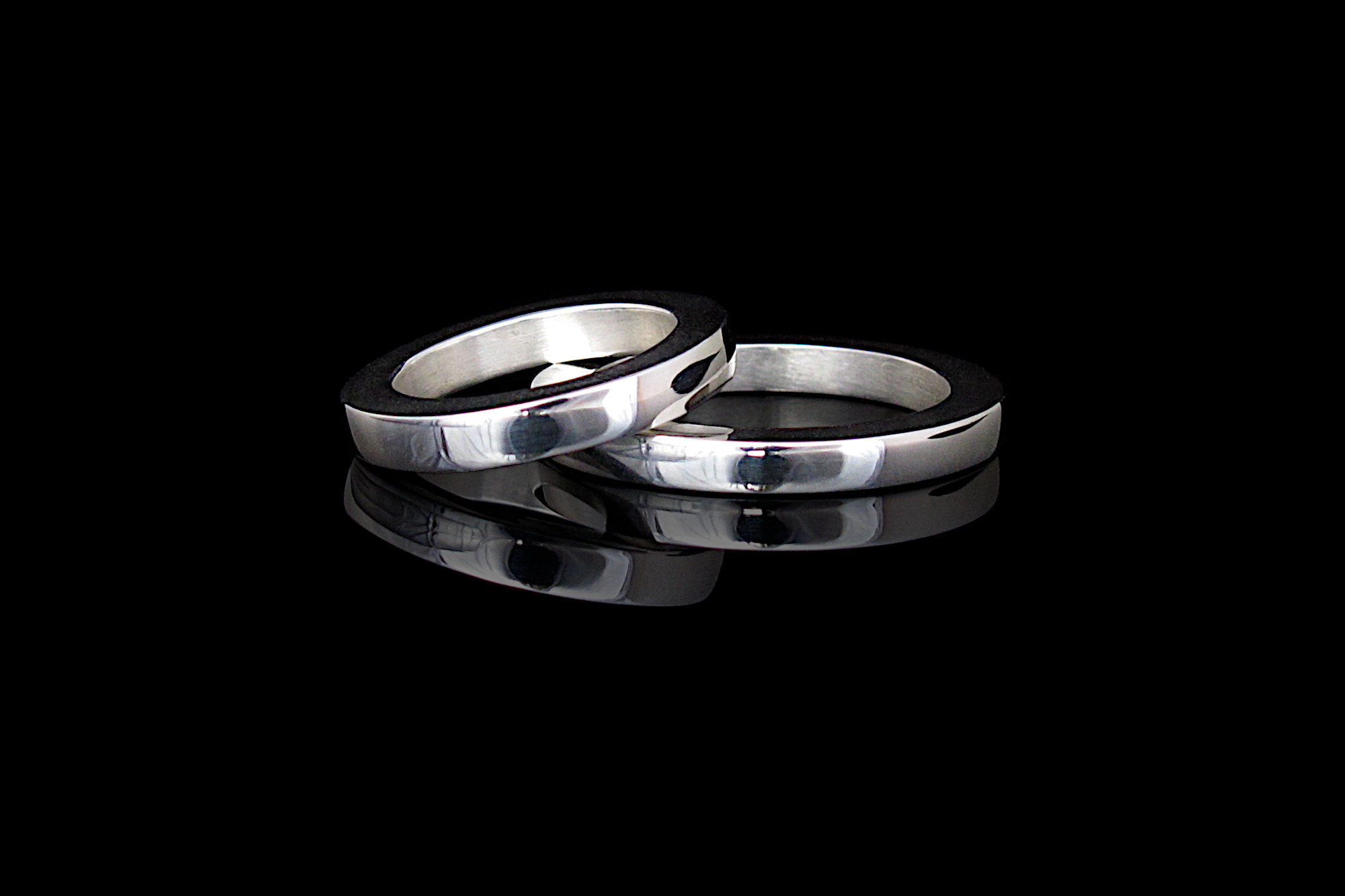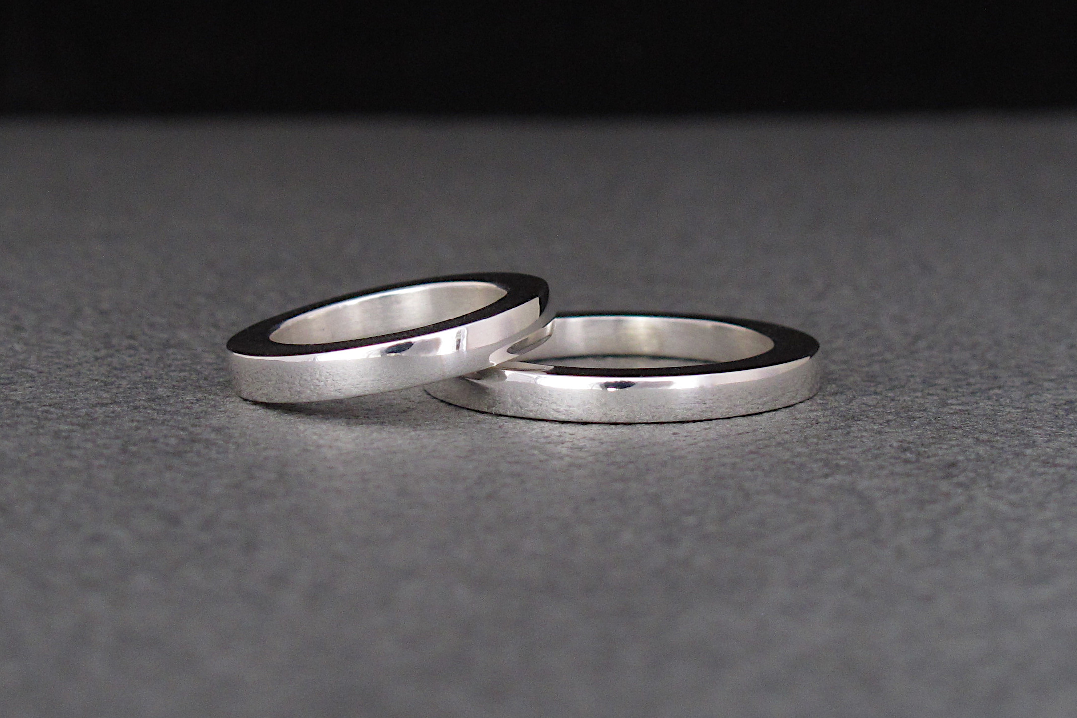 This is a set of two matching rings. The bands are made of Sterling silver, and they have a square profile, with same thickness and width. Both bands are about 3mm (1/8 in).