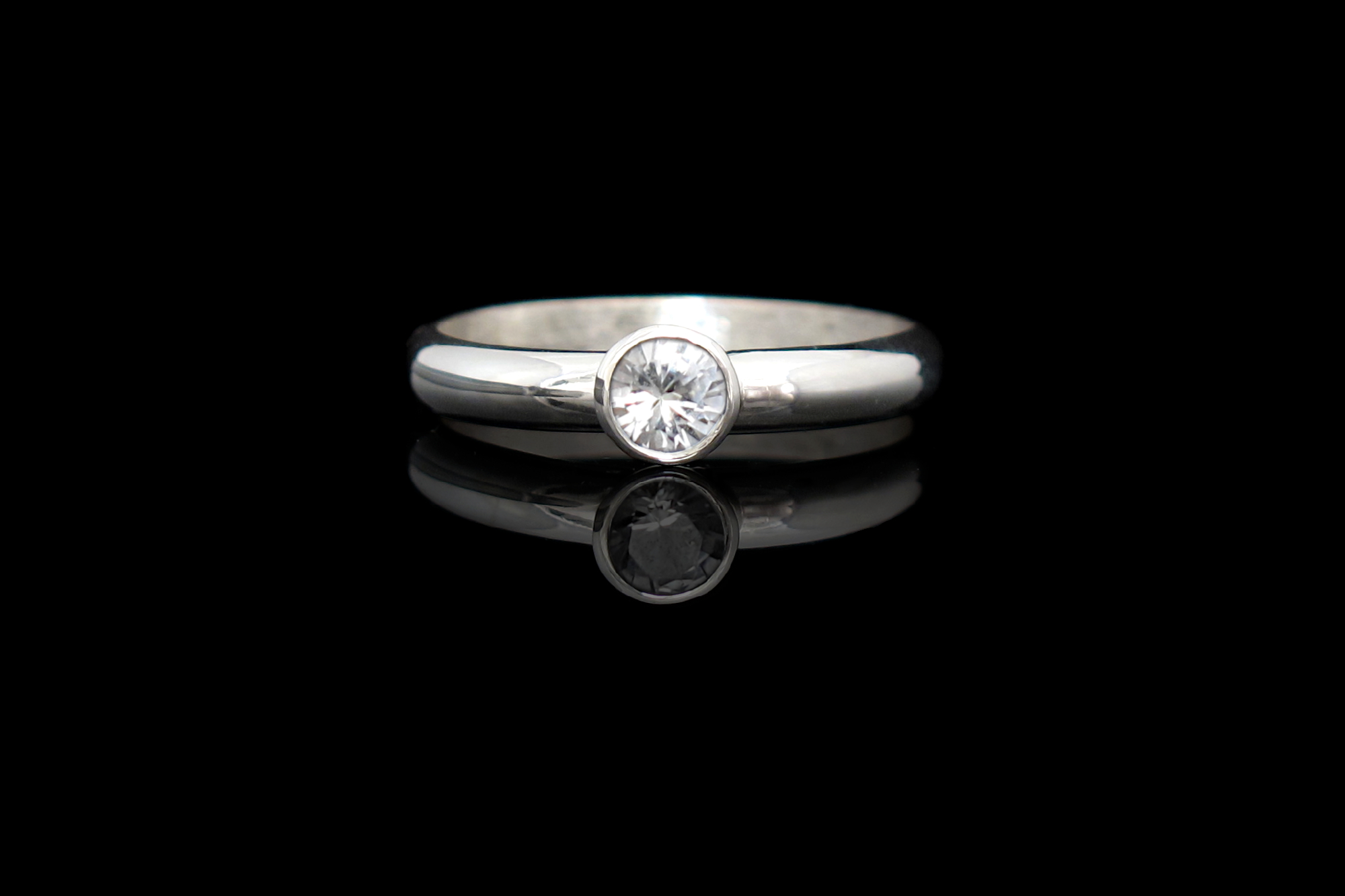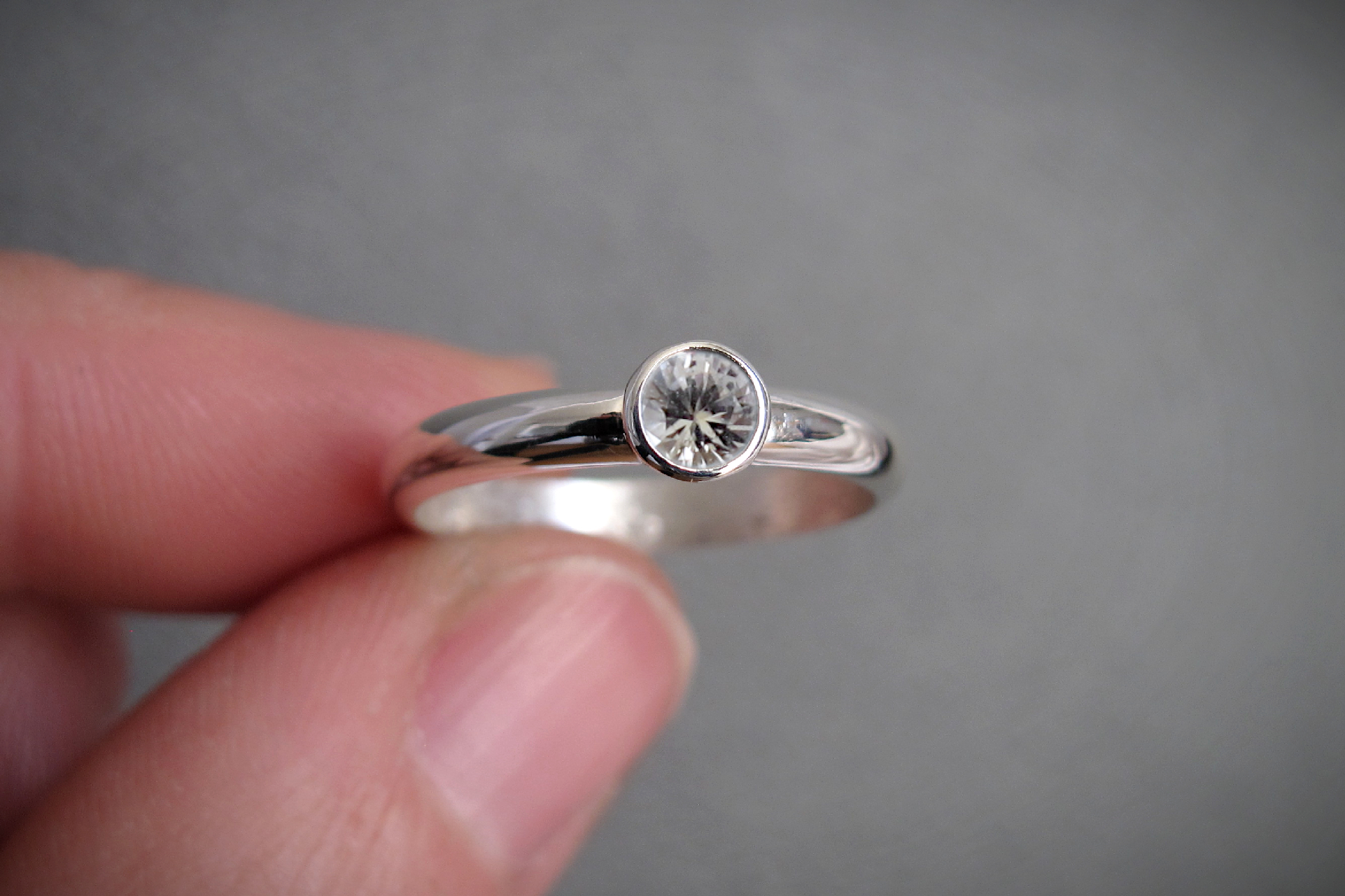 This is a Sterling silver and White Sapphire ring. The gemstone is set in a full bezel and the ring has a shiny polished finish. This ring makes for a great stacking ring, as well as an alternative promise/engagement ring.