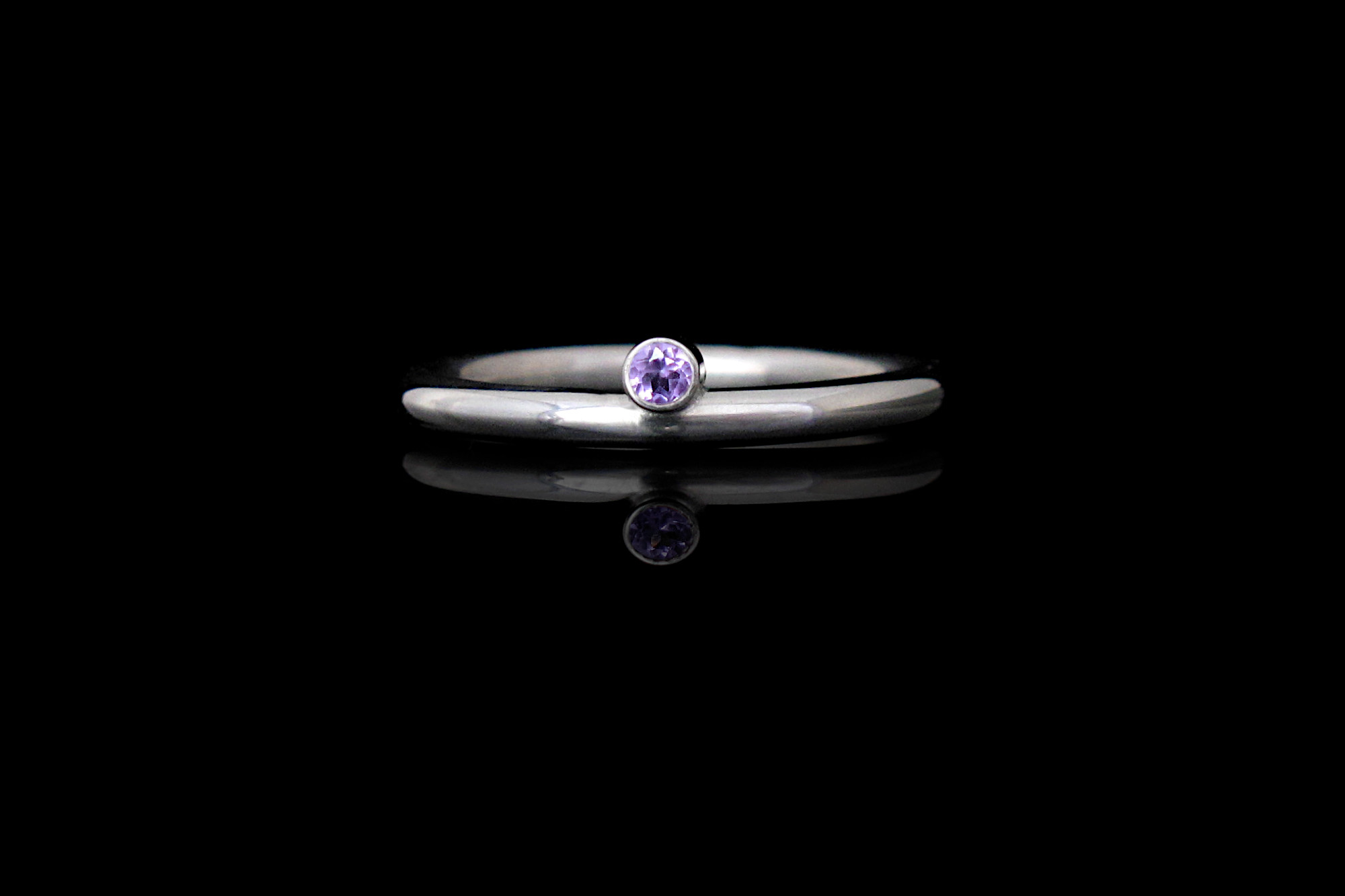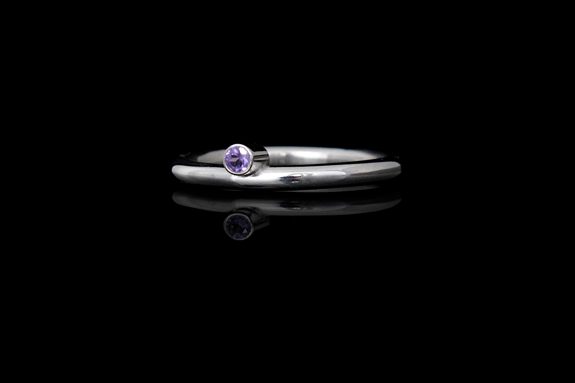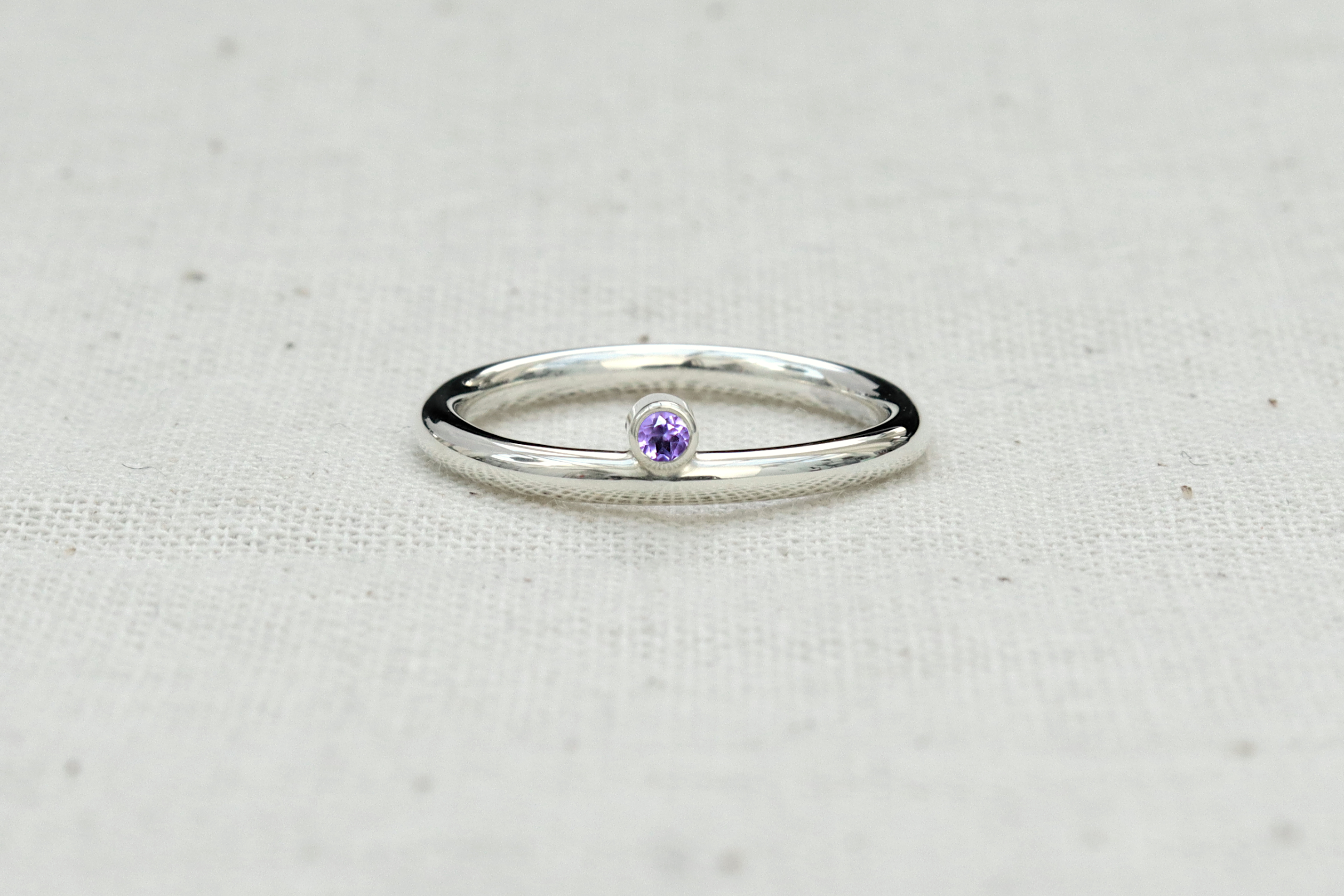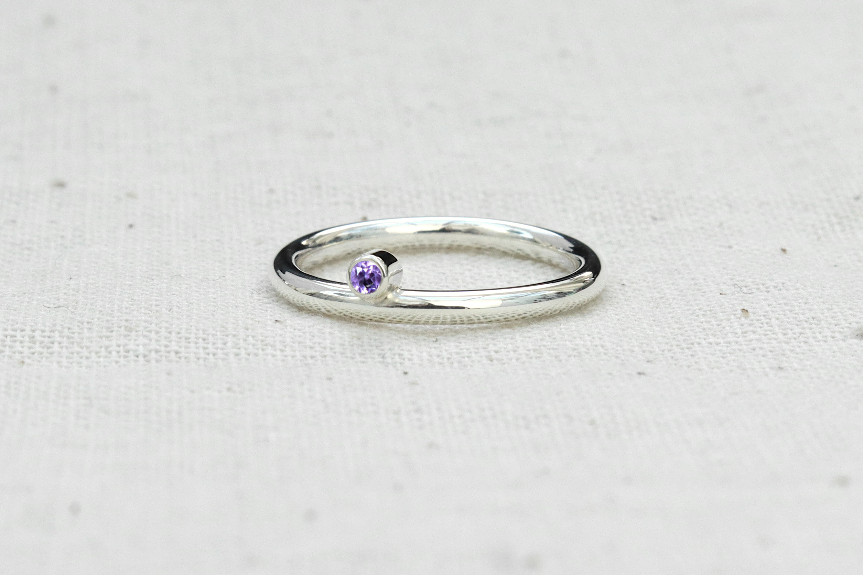 This is a Sterling silver ring with a beautiful and bright purple Amethyst. The stone sits half way into the band. This ring is great for wearing as part of a stack as well as on its own for a more minimal look.