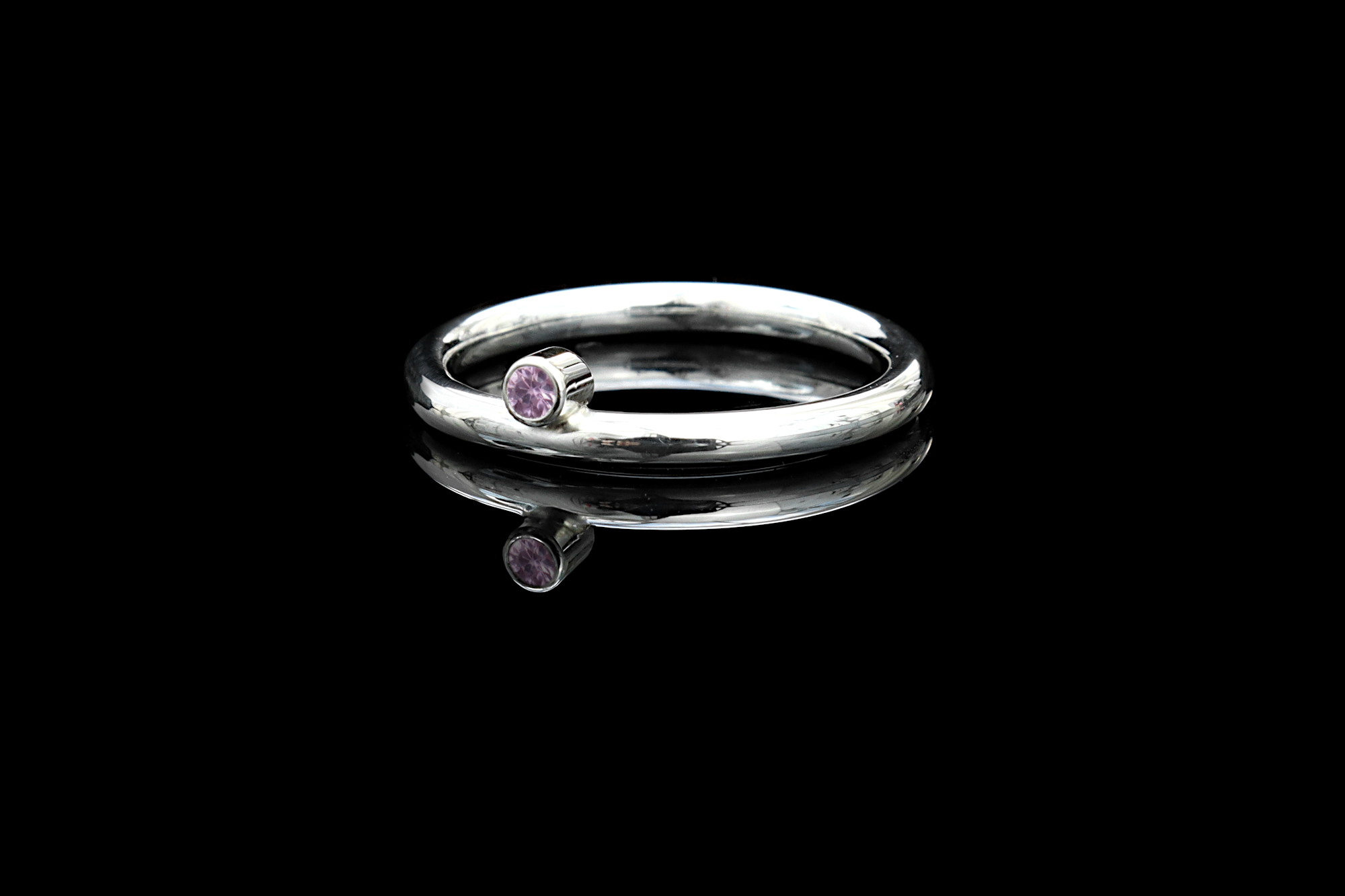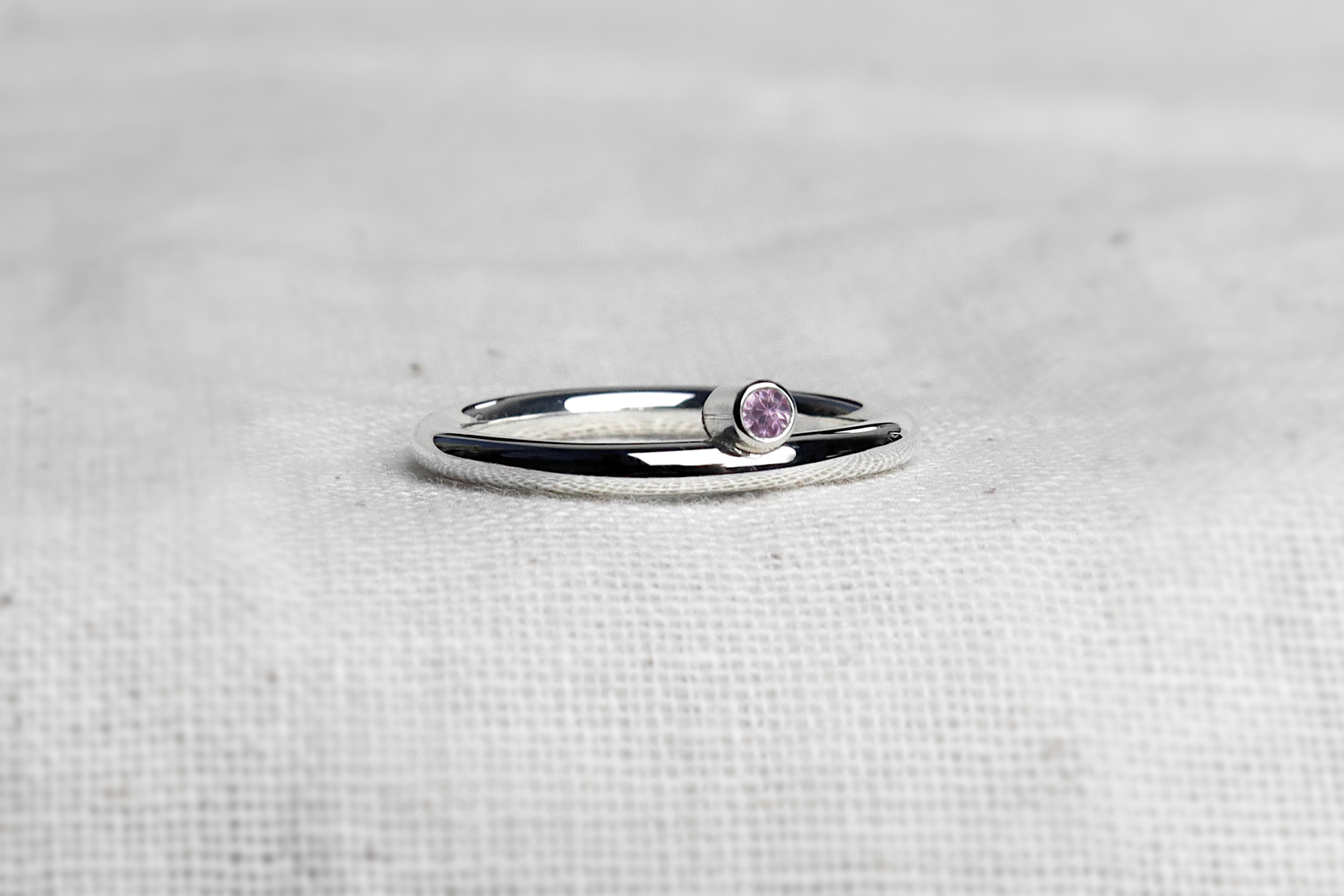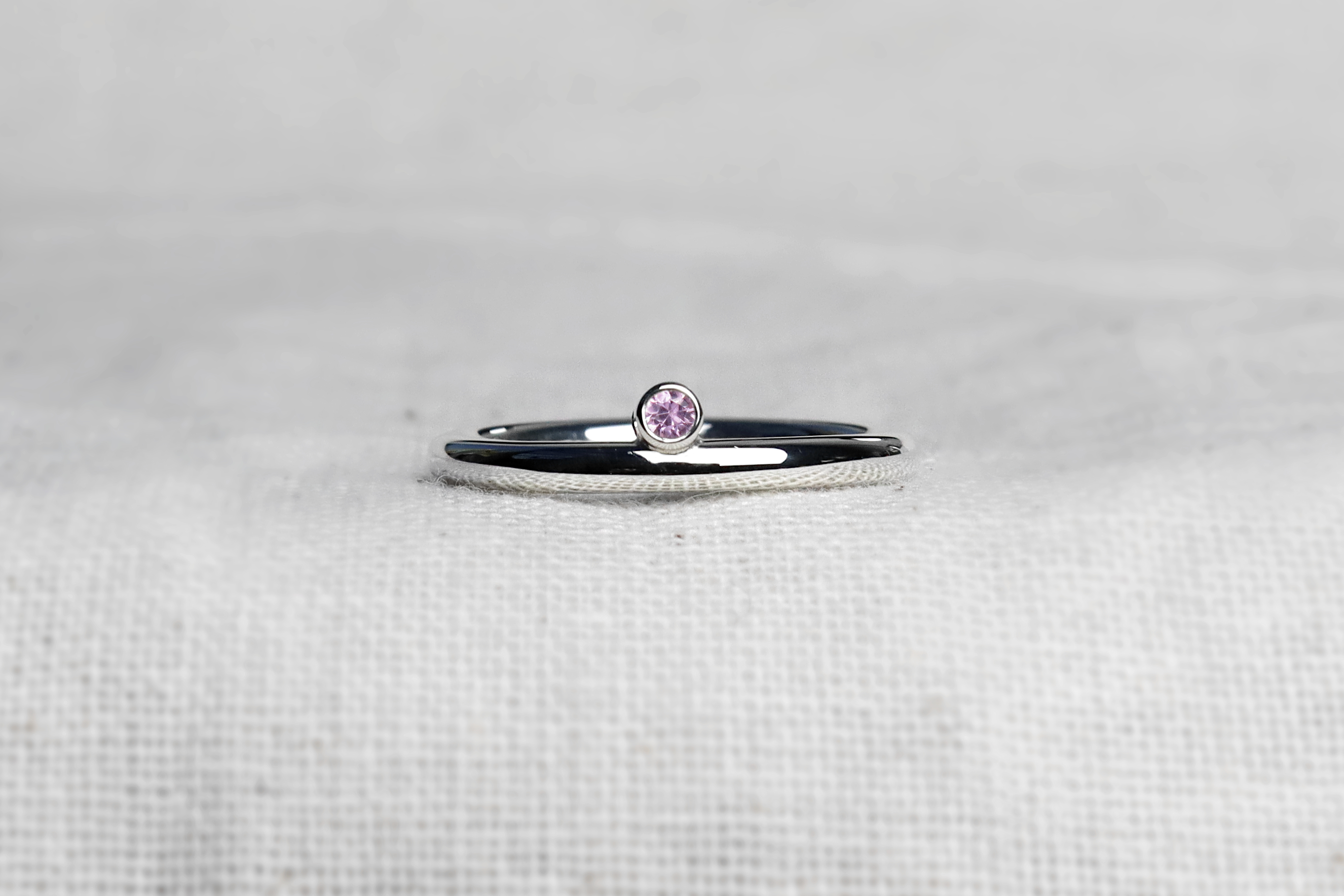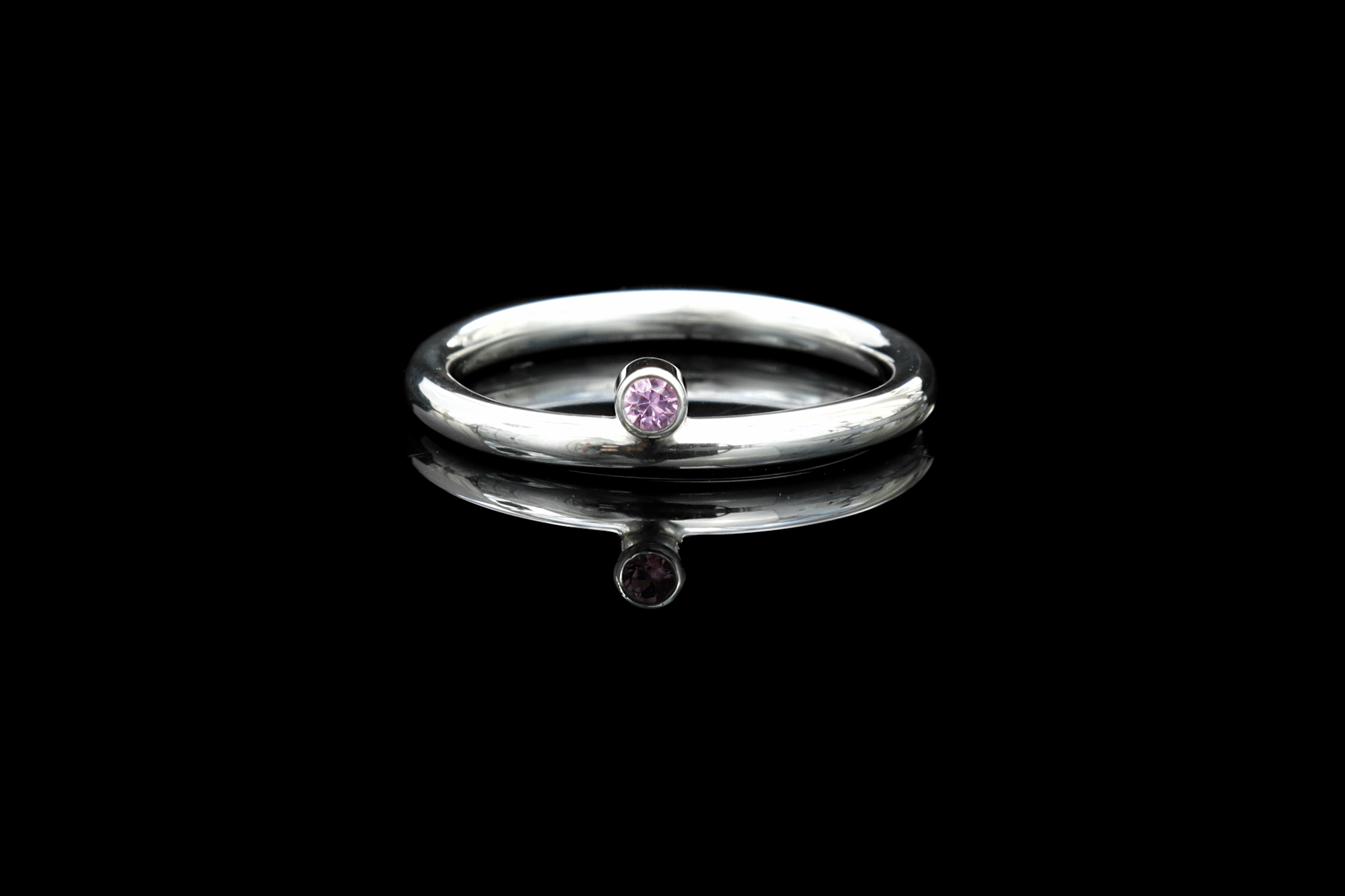 This is a Sterling silver and bright pink Sapphire ring, where the gemstone sits halfway down into the band. This ring makes for a great stacking ring, as well as an alternative promise/engagement ring.