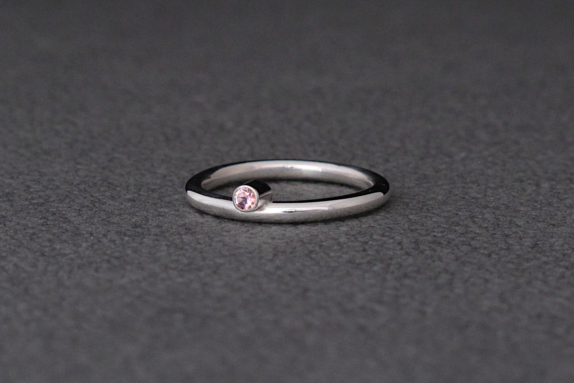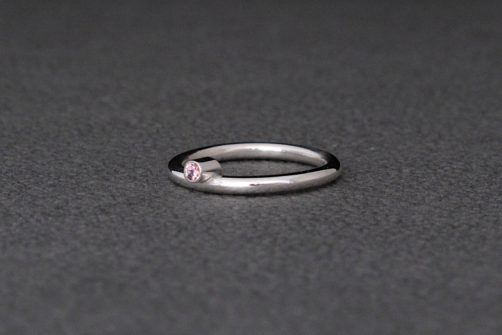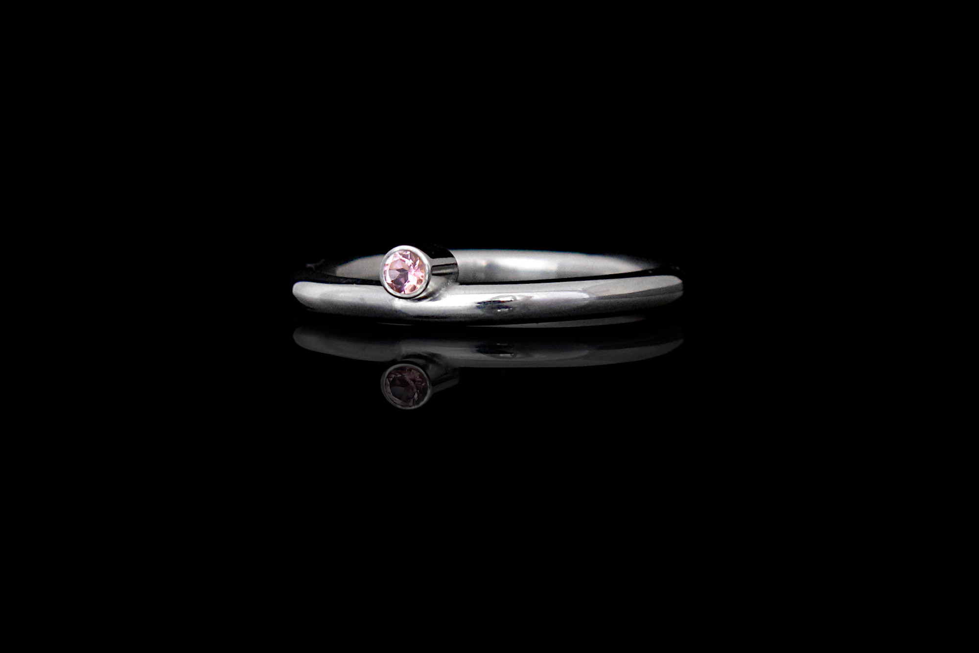 This is a handmade Sterling silver ring with a pink Tourmaline that sits half way down into the band. This ring makes for a beautiful stacking ring, or a minimal promise ring.