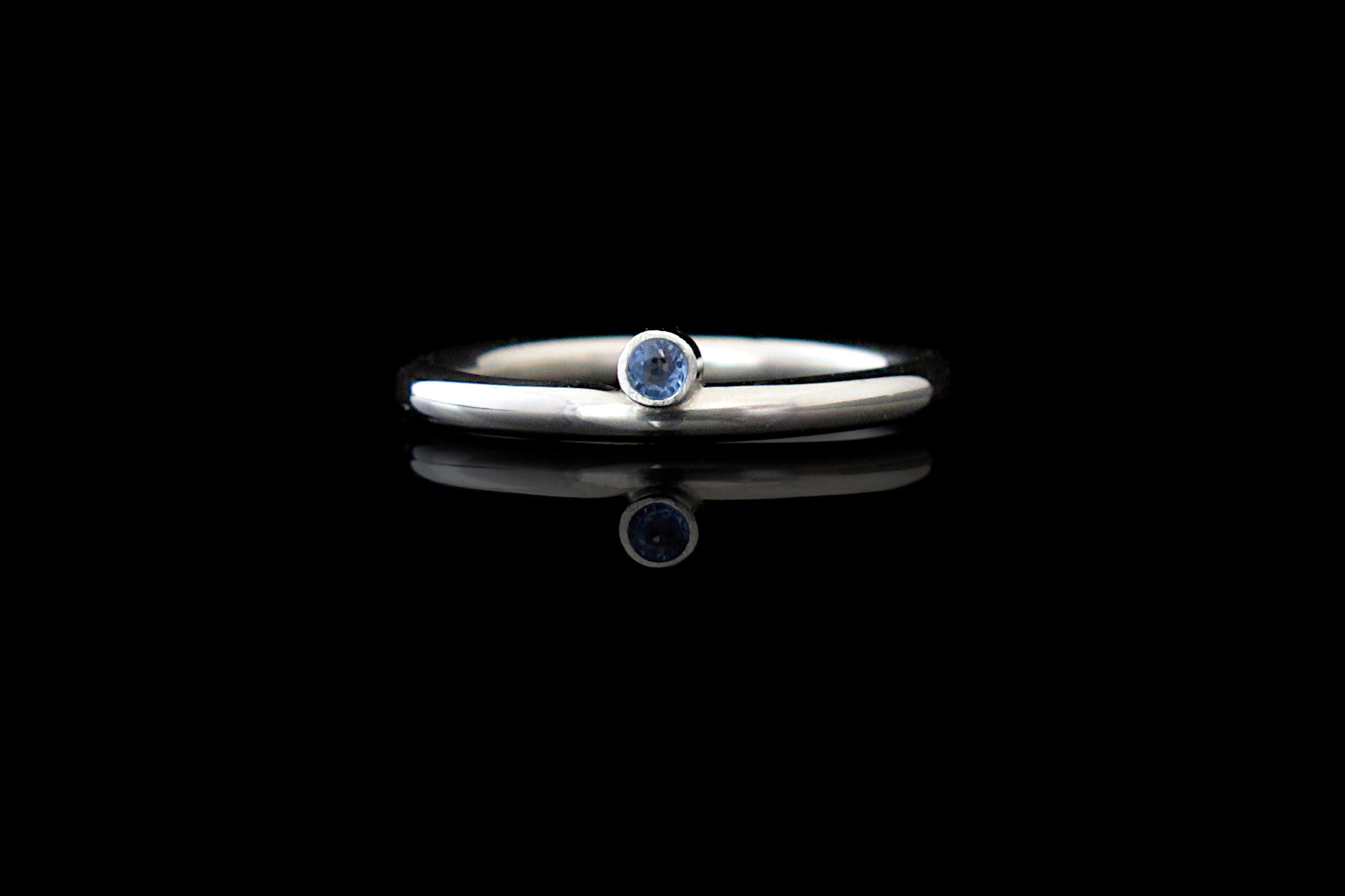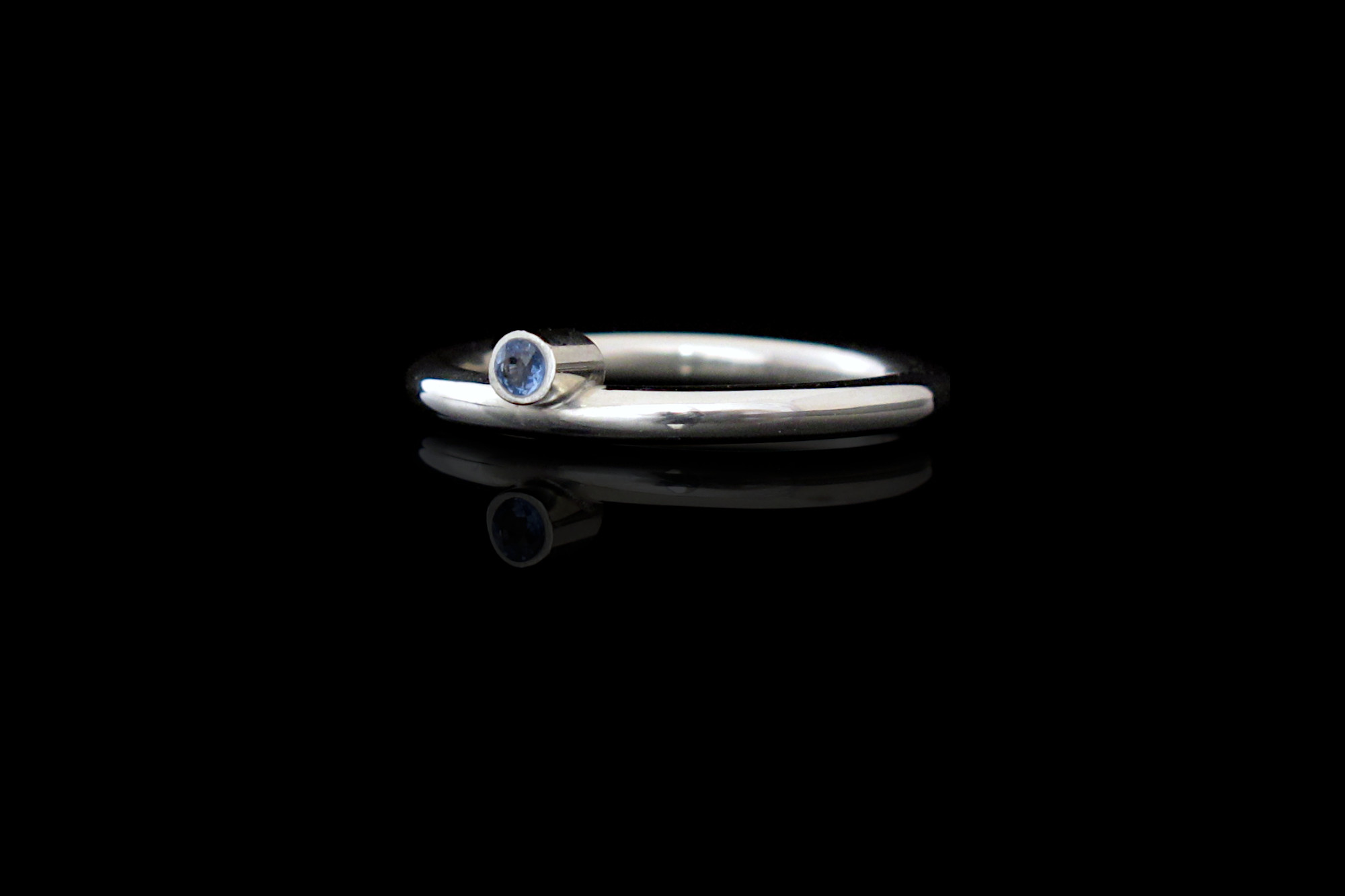 This is a Sterling silver and Sapphire ring. The look is minimal and elegant, with a polished finish and a small blue Sapphire that sits halfway down the silver band in a bezel. It is a good option for those looking for a promise ring before committing to a larger investment.