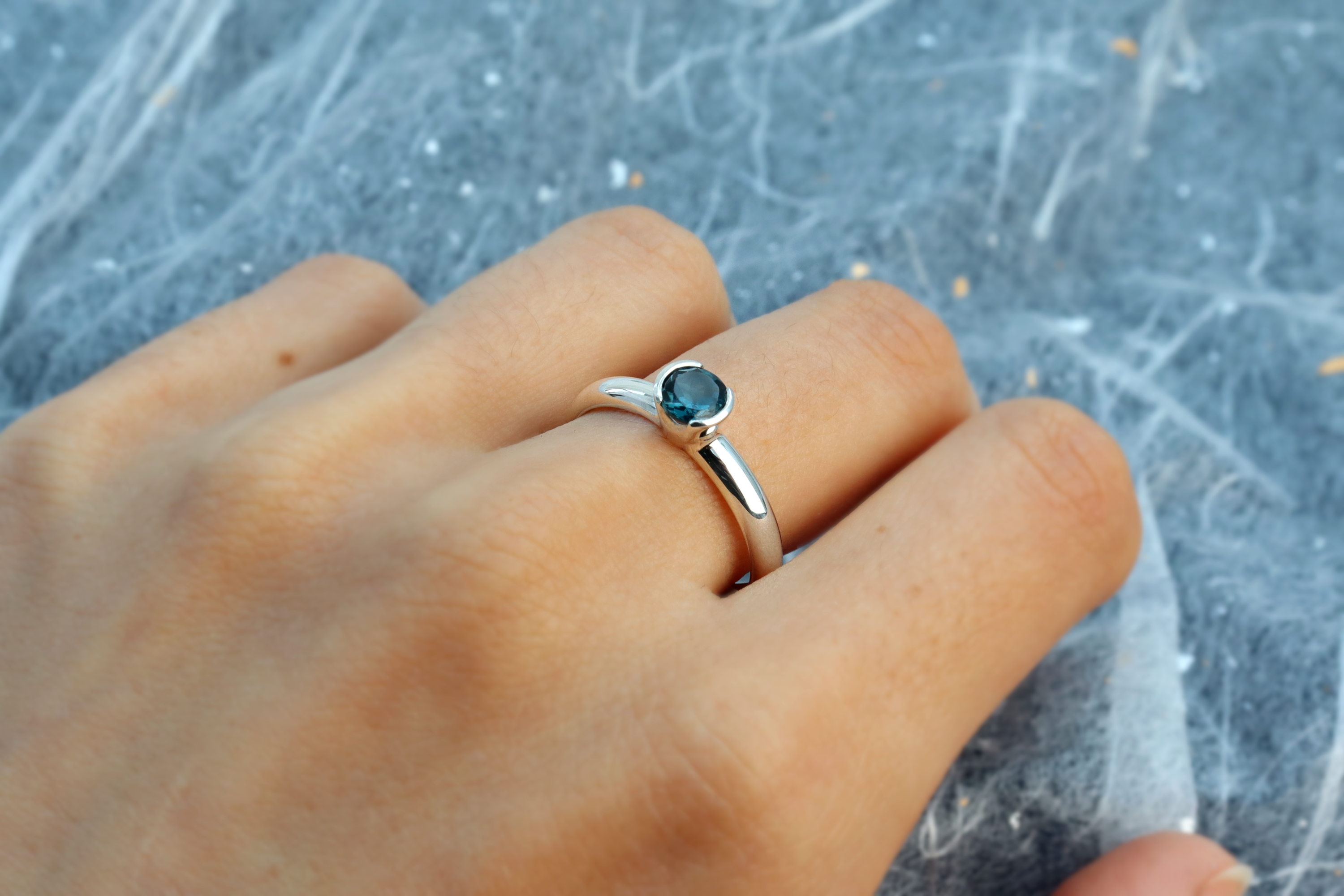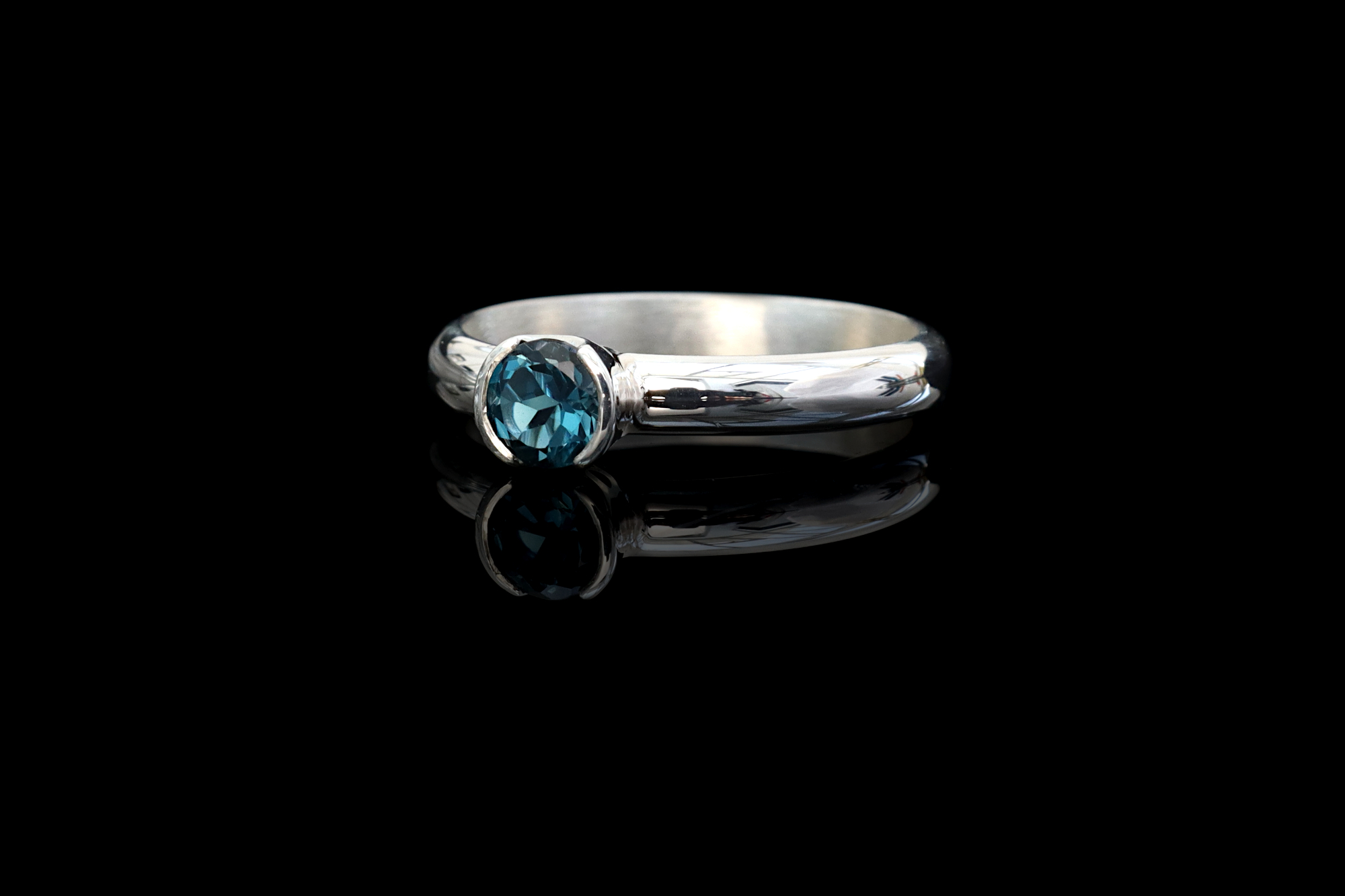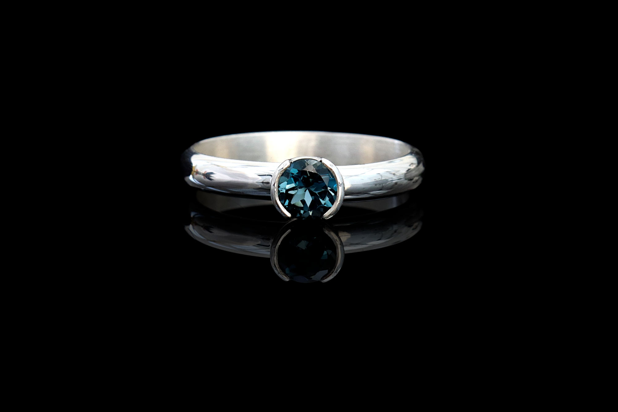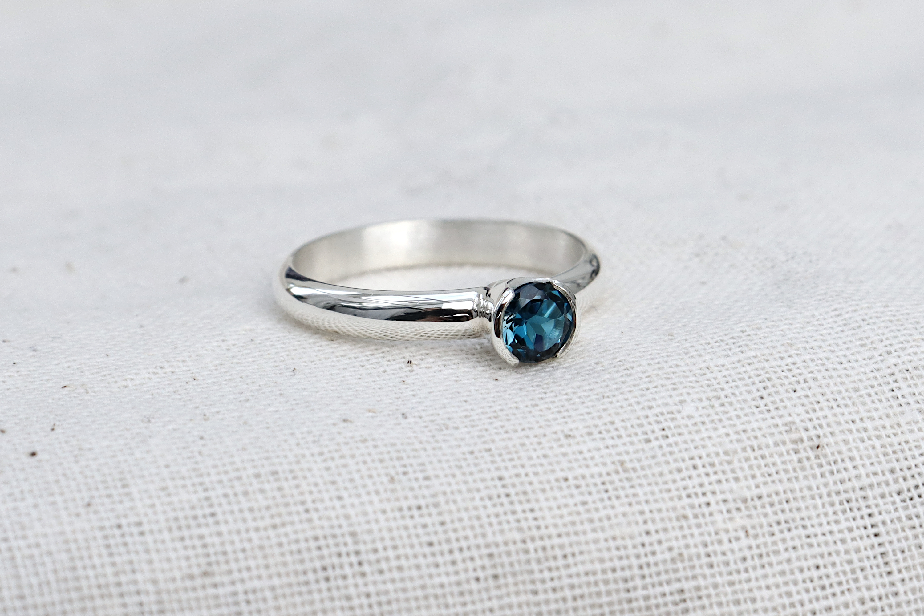 This is our silver and London blue Topaz ring. The Topaz is set in a hand forged half bezel, which has a modern look and allows for more exposure of the gemstone. The band has a D profile, which is flat on the inside and rounded on the visible side. This is a comfortable band for everyday wear.