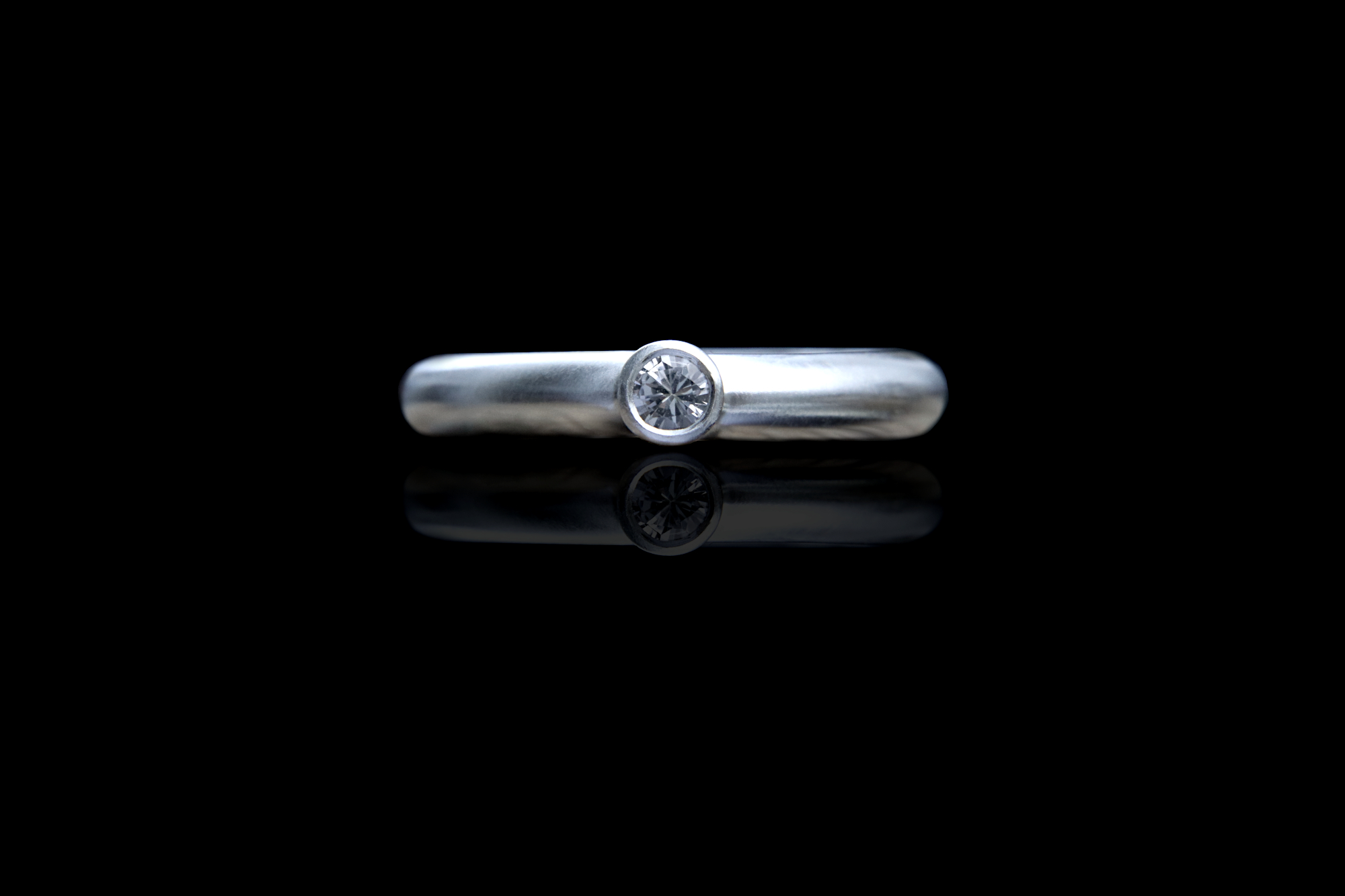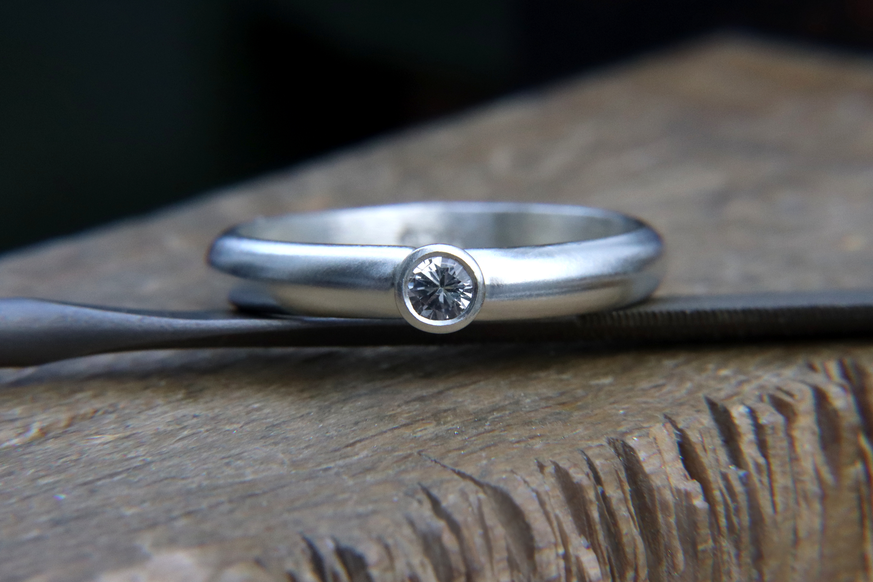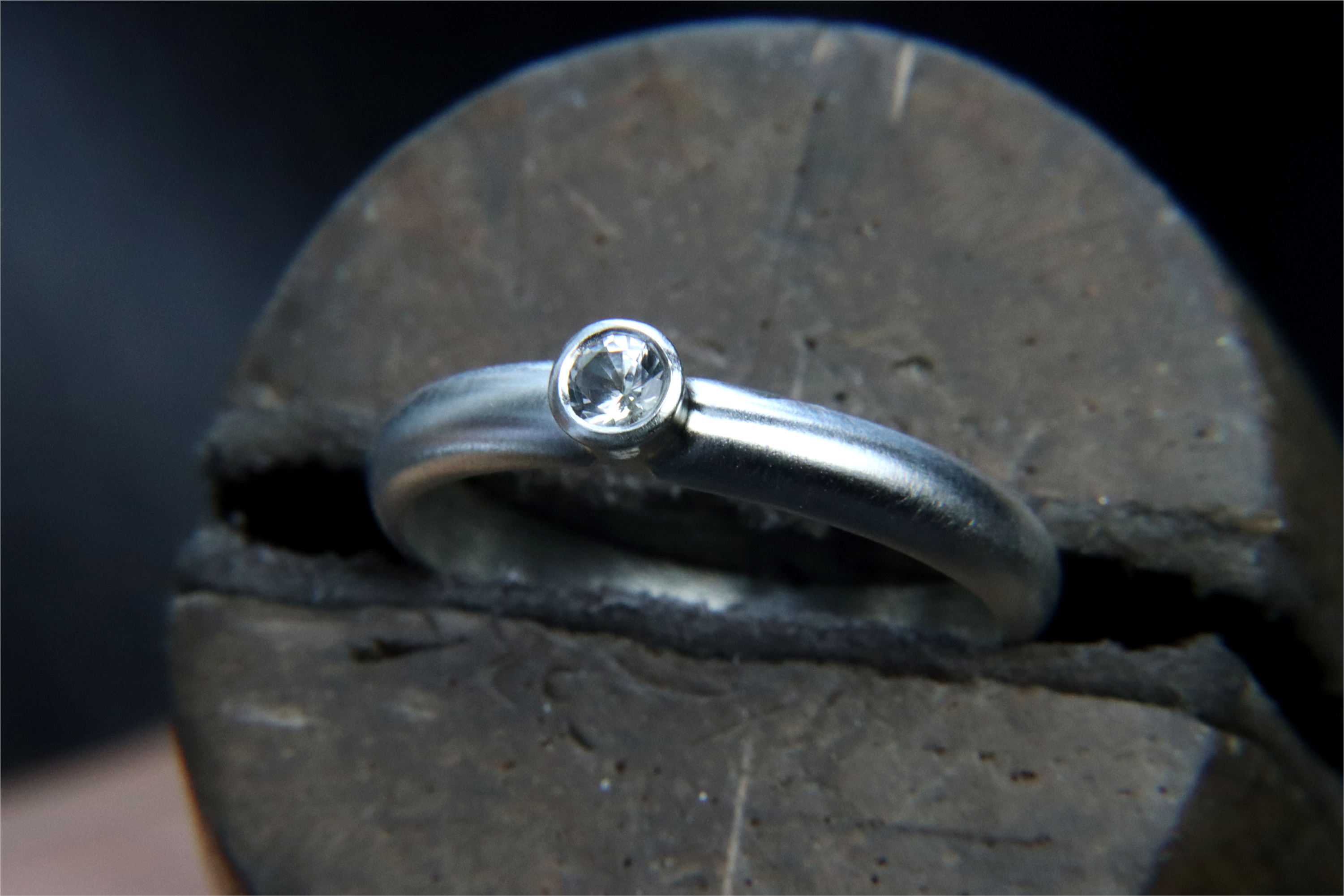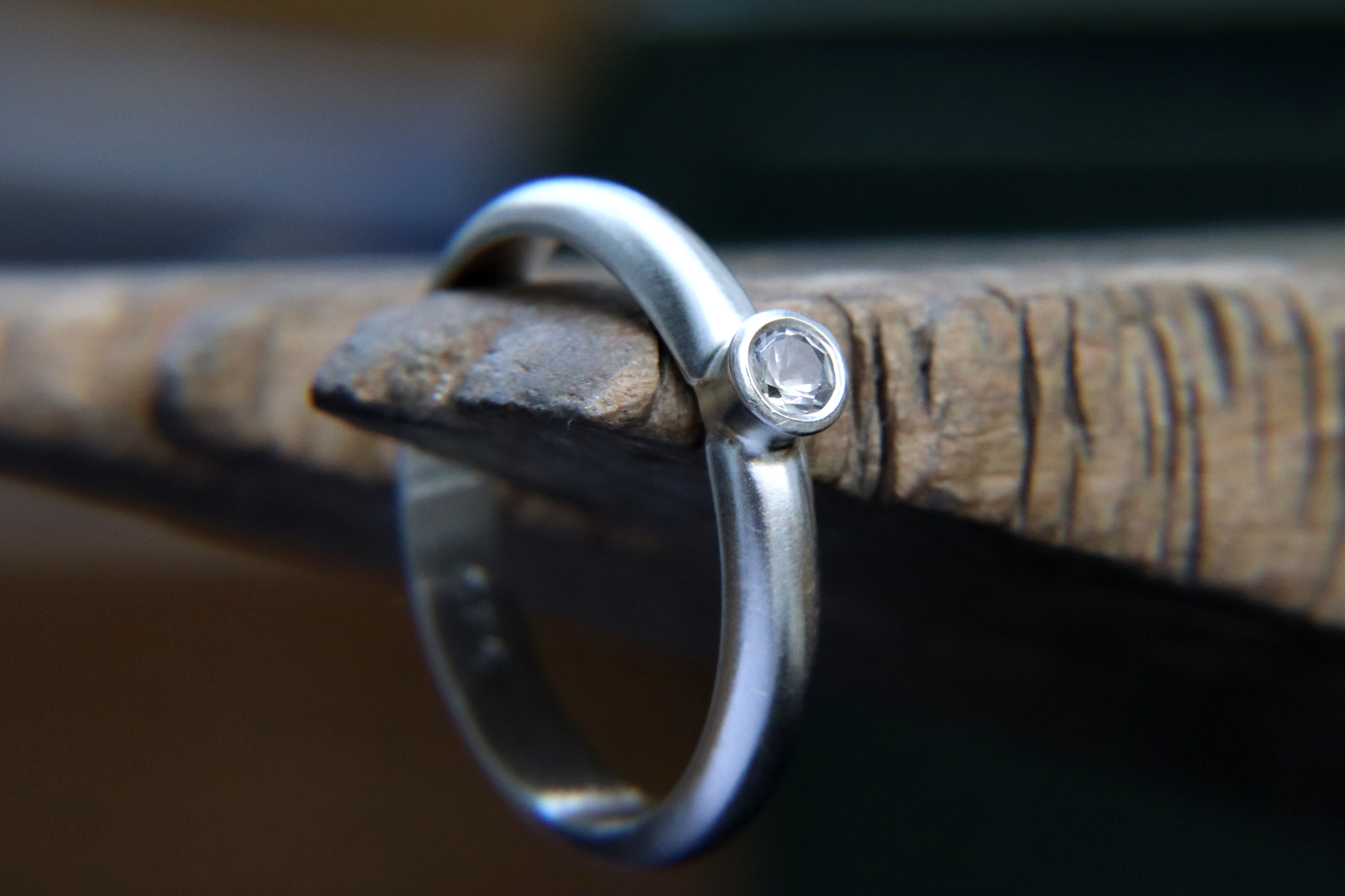 Hand made Sterling silver and white Sapphire ring. The D-shaped band makes this ring comfortable for everyday wear. The combination of the clear gemstone and the matte silver gives this ring a minimal and subtle look, and makes it a good option for those looking for a Diamond ring alternative.