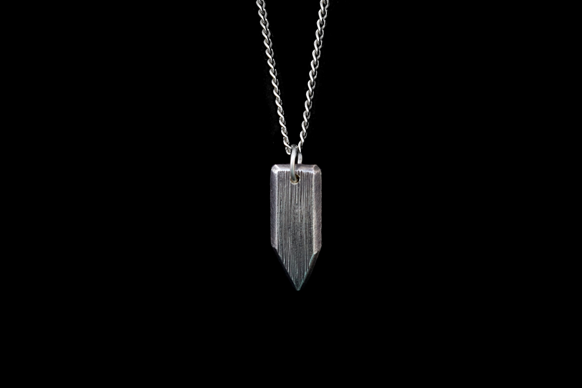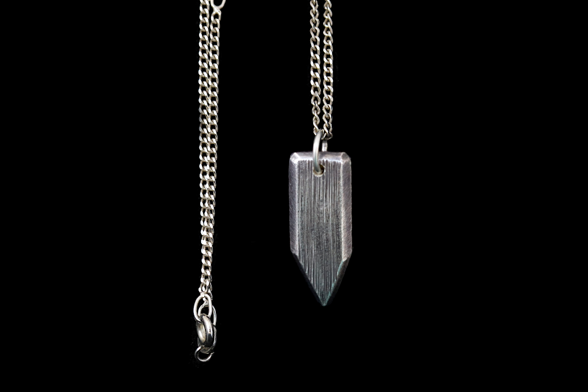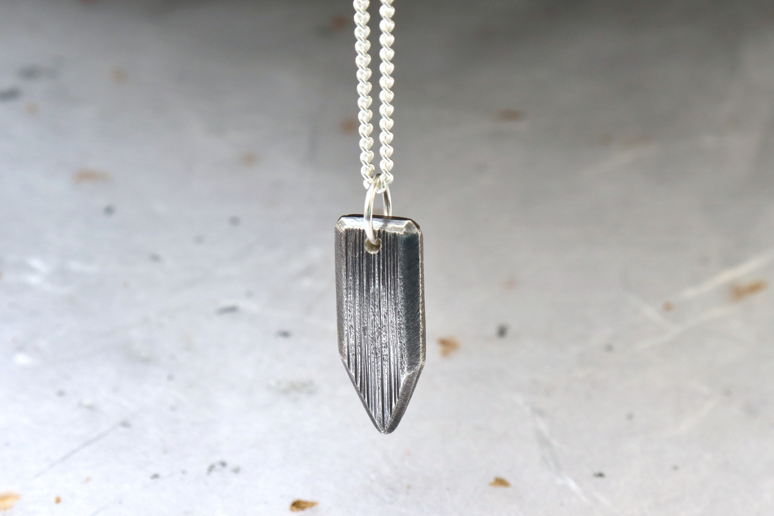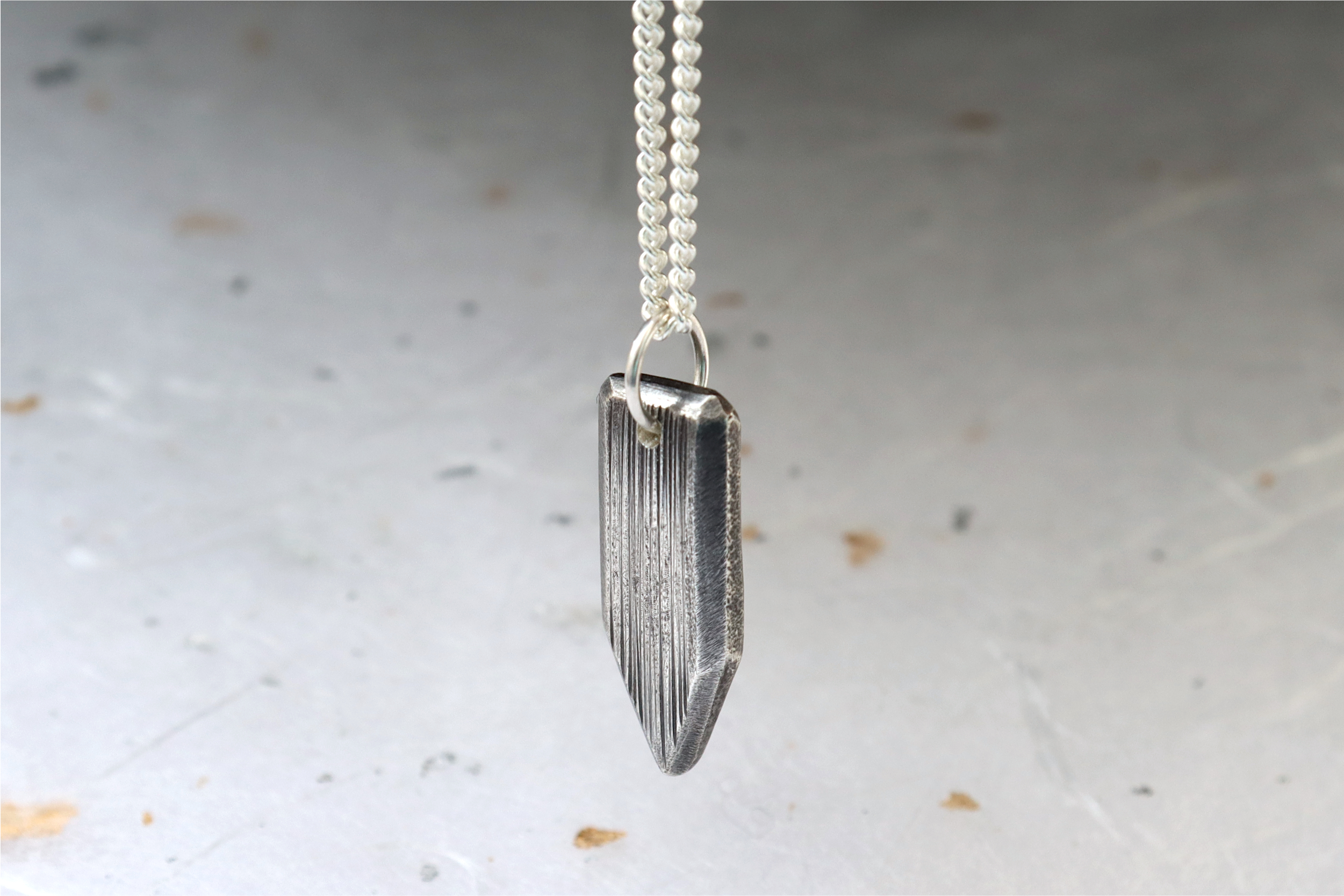 This is a sand cast Sterling silver pendant necklace with a 55cm long chain. The charm has sharp angles and rough textures, and it has a dark patina.