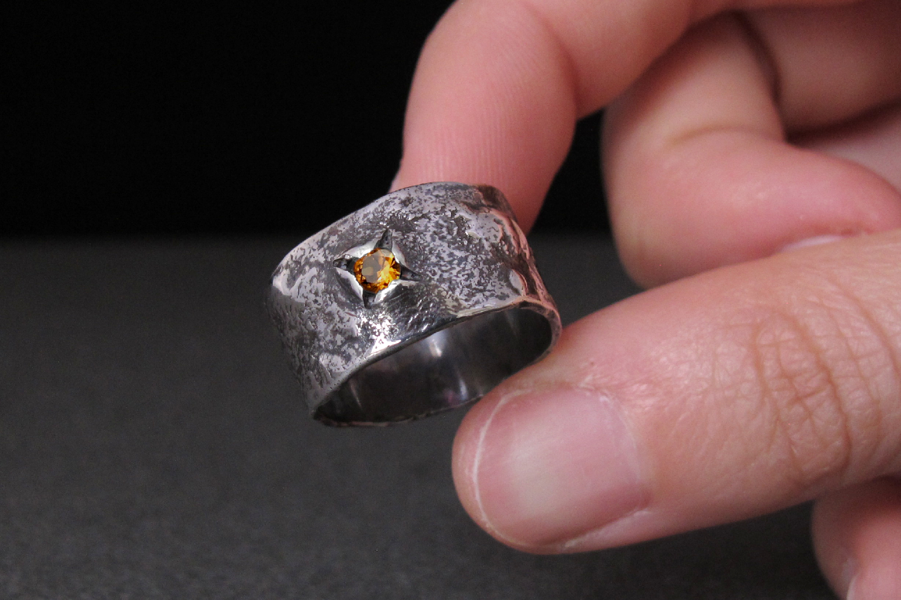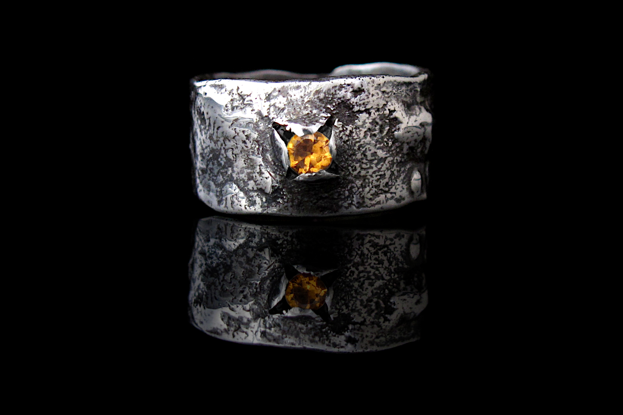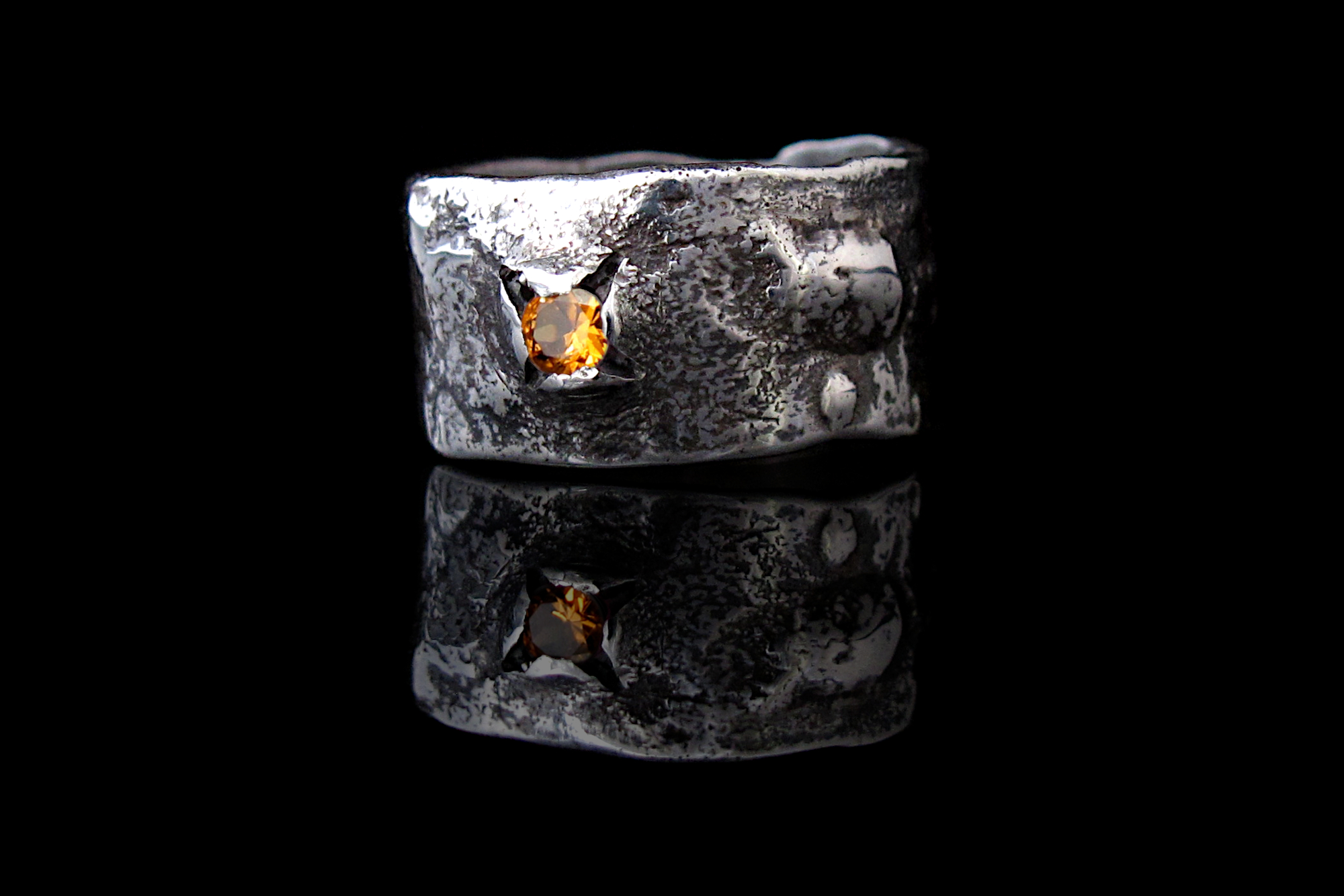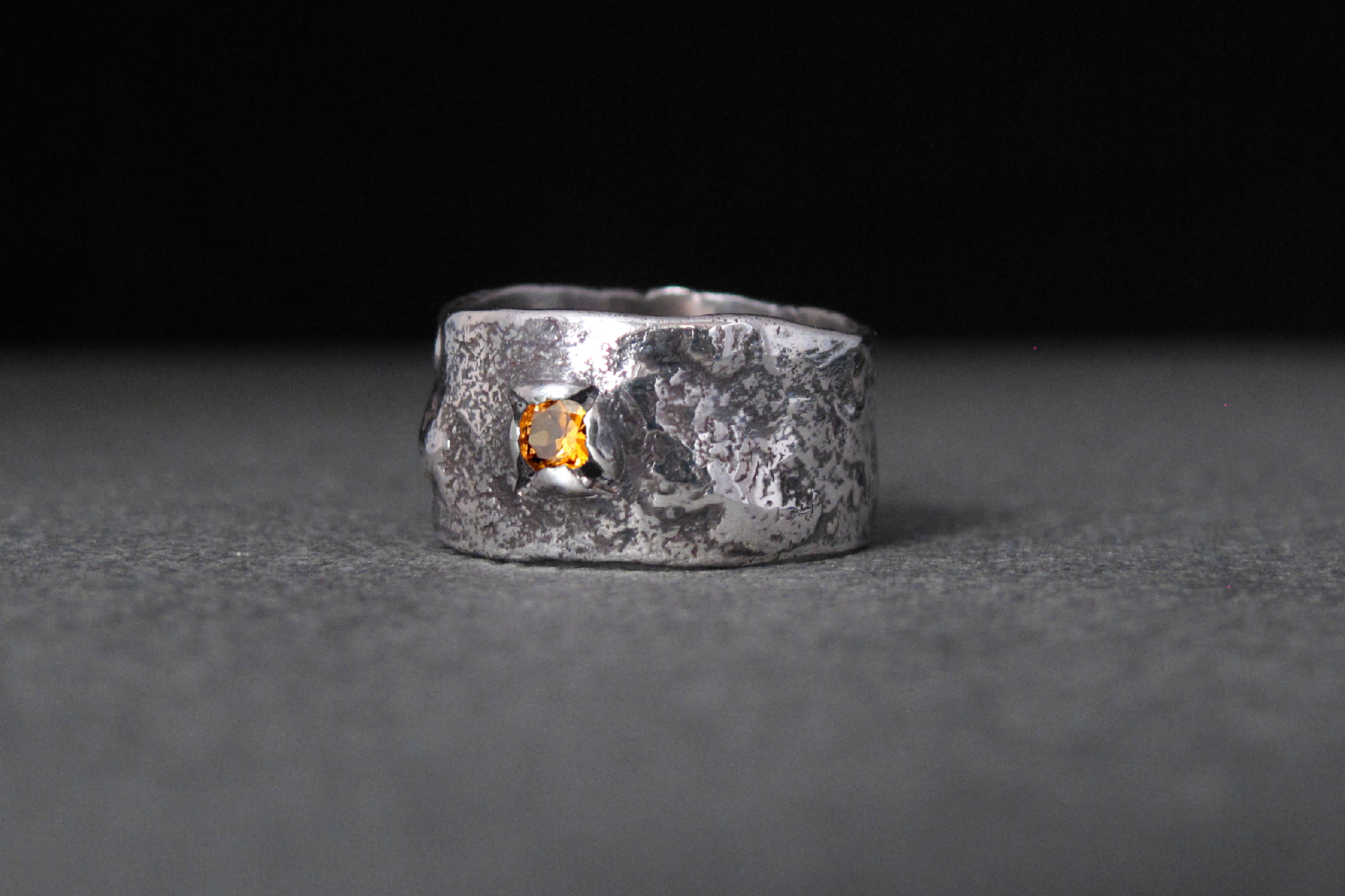 Sterling silver ring with a rustic texture and an Orange Sapphire. This is a statement, eye-catching piece, where the gemstone is set in an unusual way, and the bubbles and ripples on the surface give the ring a more alternative look.