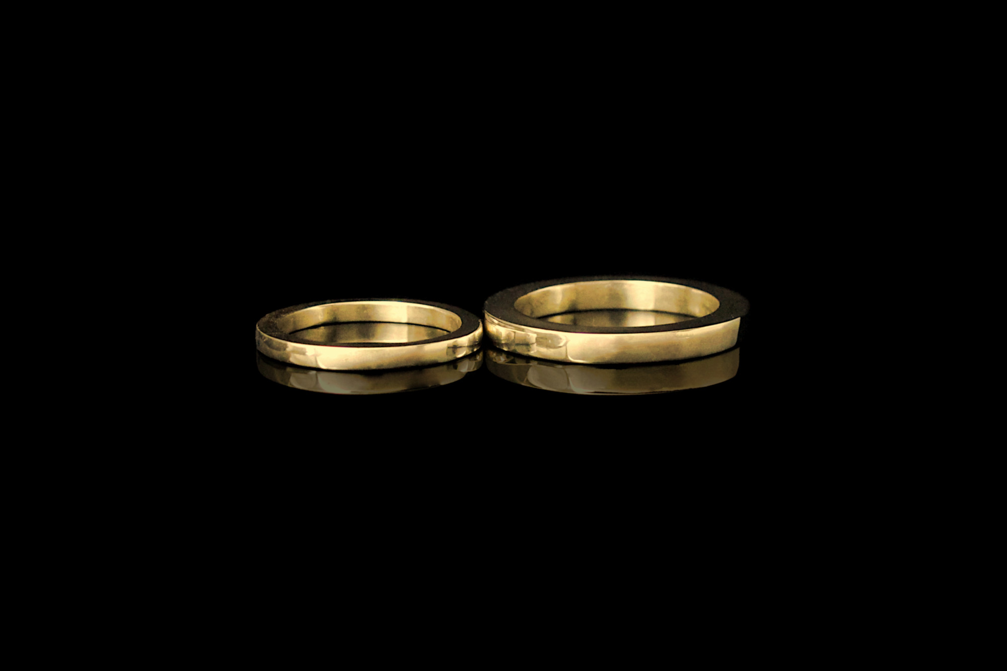 This is a set of two matching rings. The bands are made of recycled yellow gold and they have a square profile, with same thickness and width. The thinner band is a 2mm (3/16 in) and the chunkier one is 3mm (1/8 in).