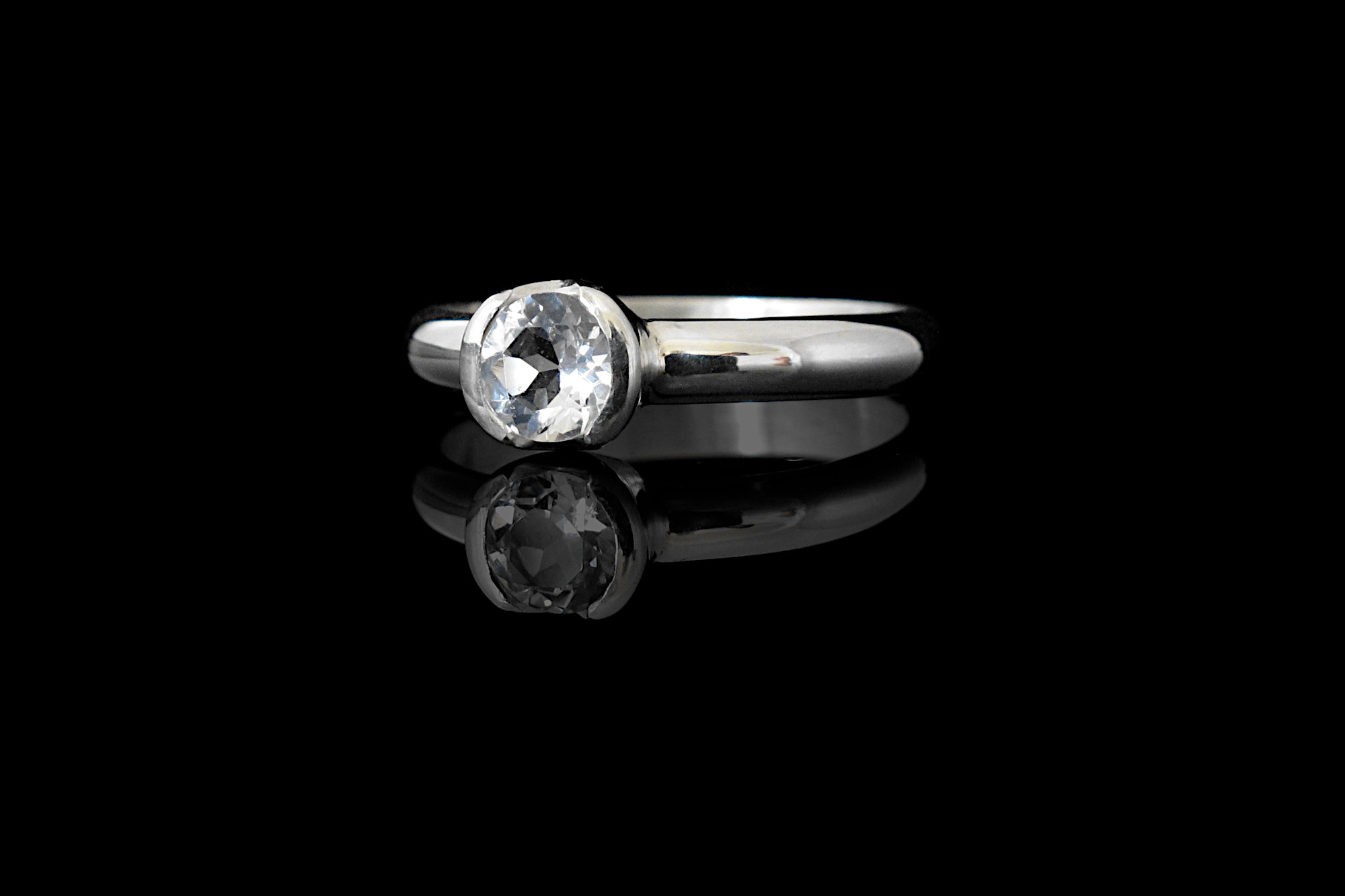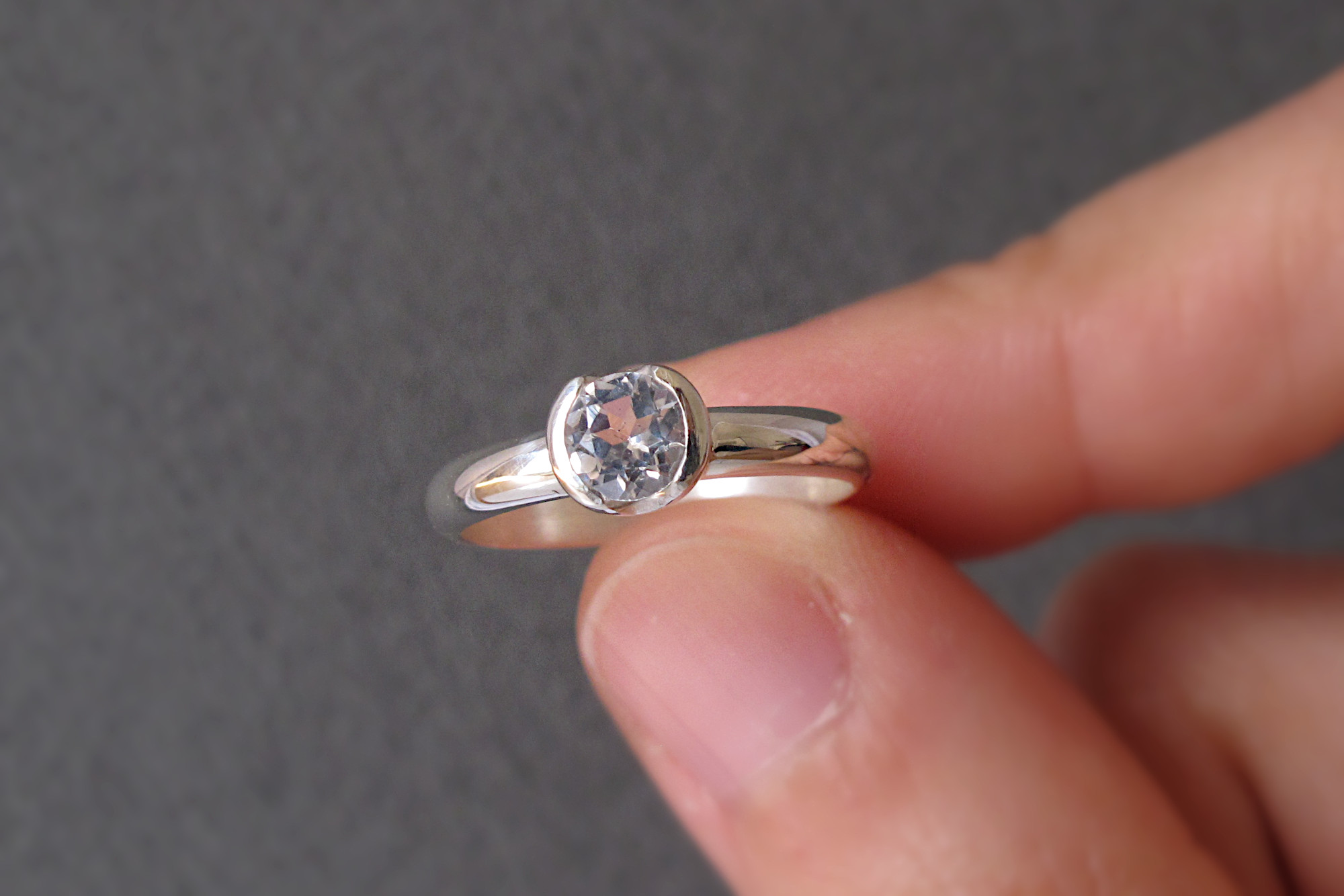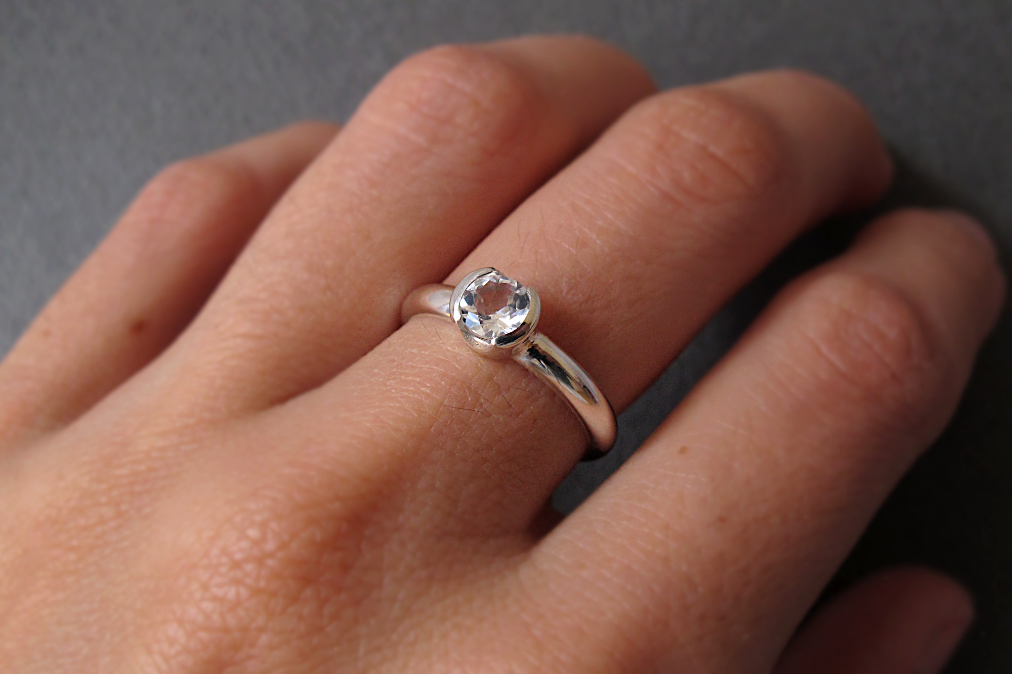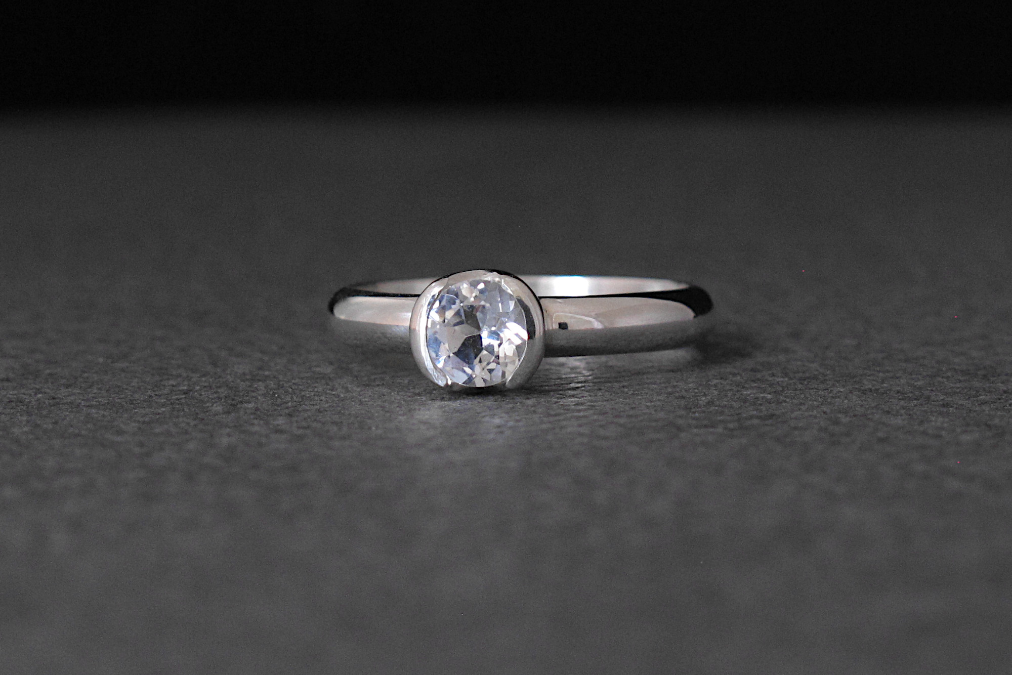Sterling silver ring with a genuine diamond cut White Topaz. The gemstone is set in a hand forged bezel that hugs the Topaz from its sides, exposing part of the stone for extra shine and a modern look. The band is a comfortable D profile, great for everyday wear. This ring is perfect as an engagement ring, a gift to someone special, or as an addition to stacking rings.