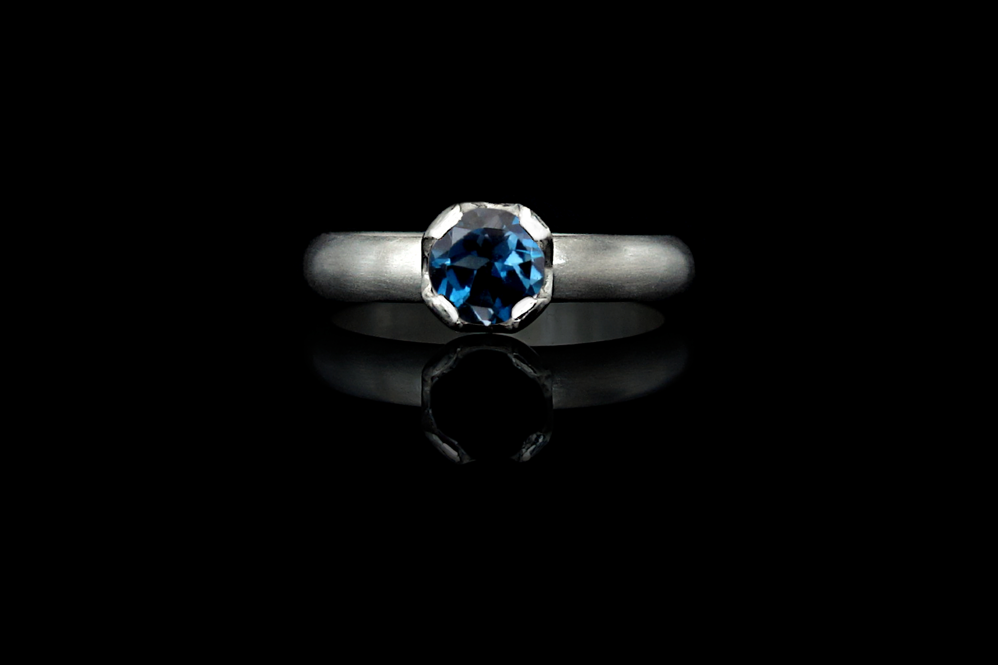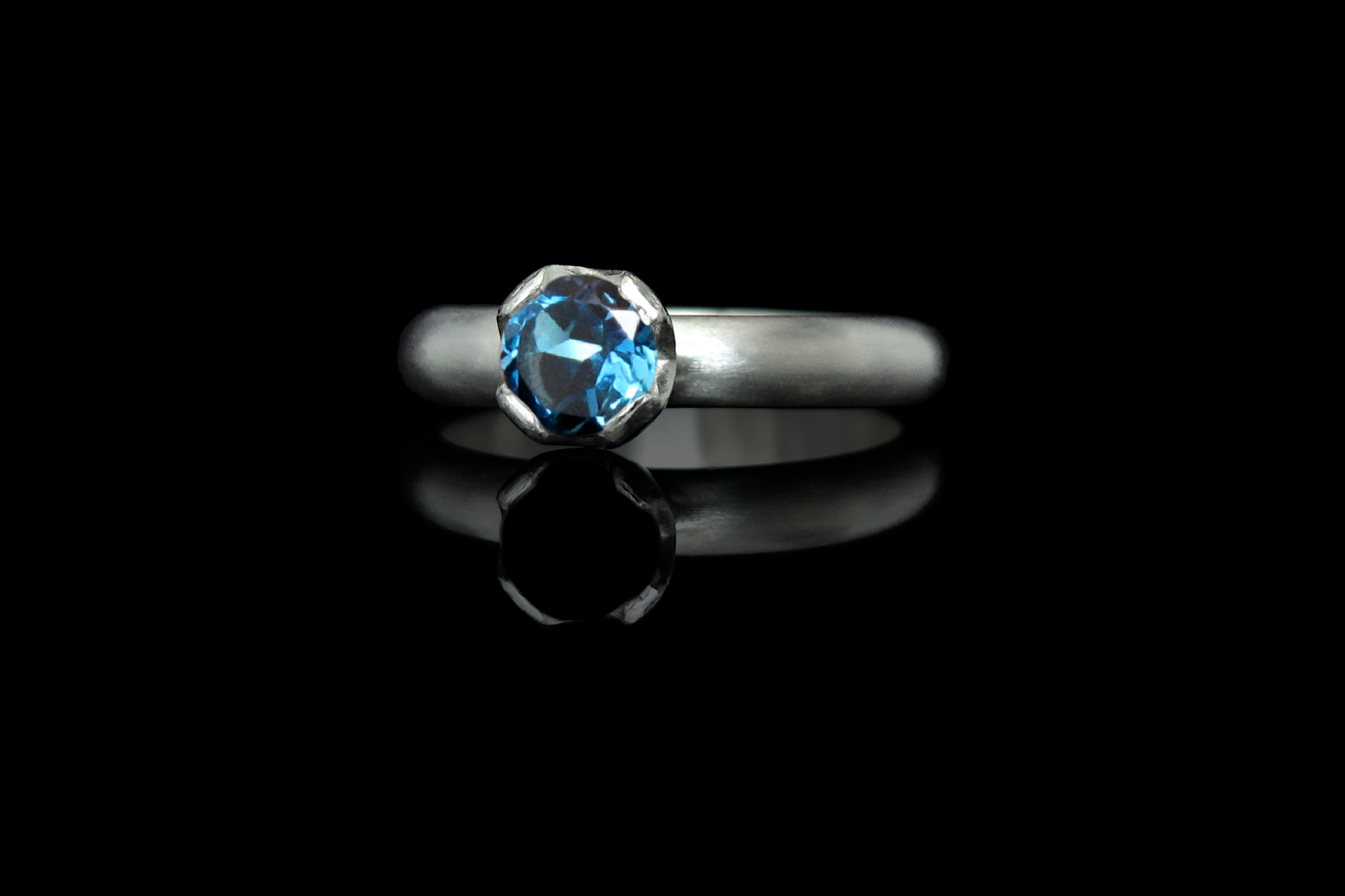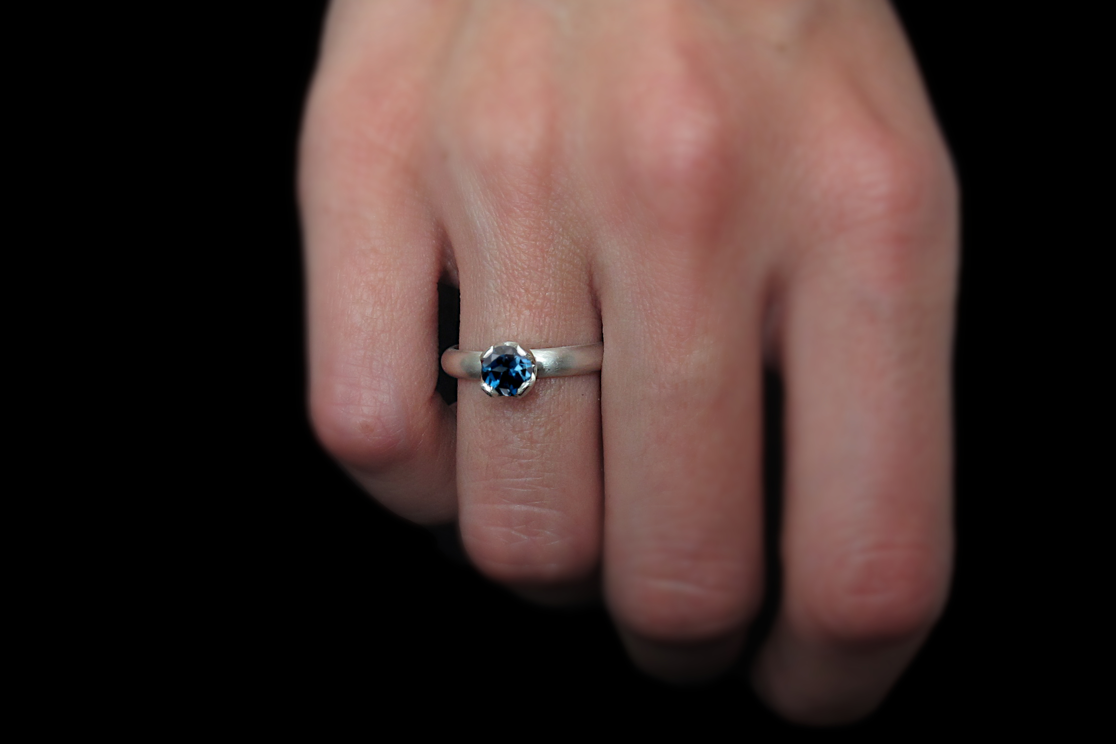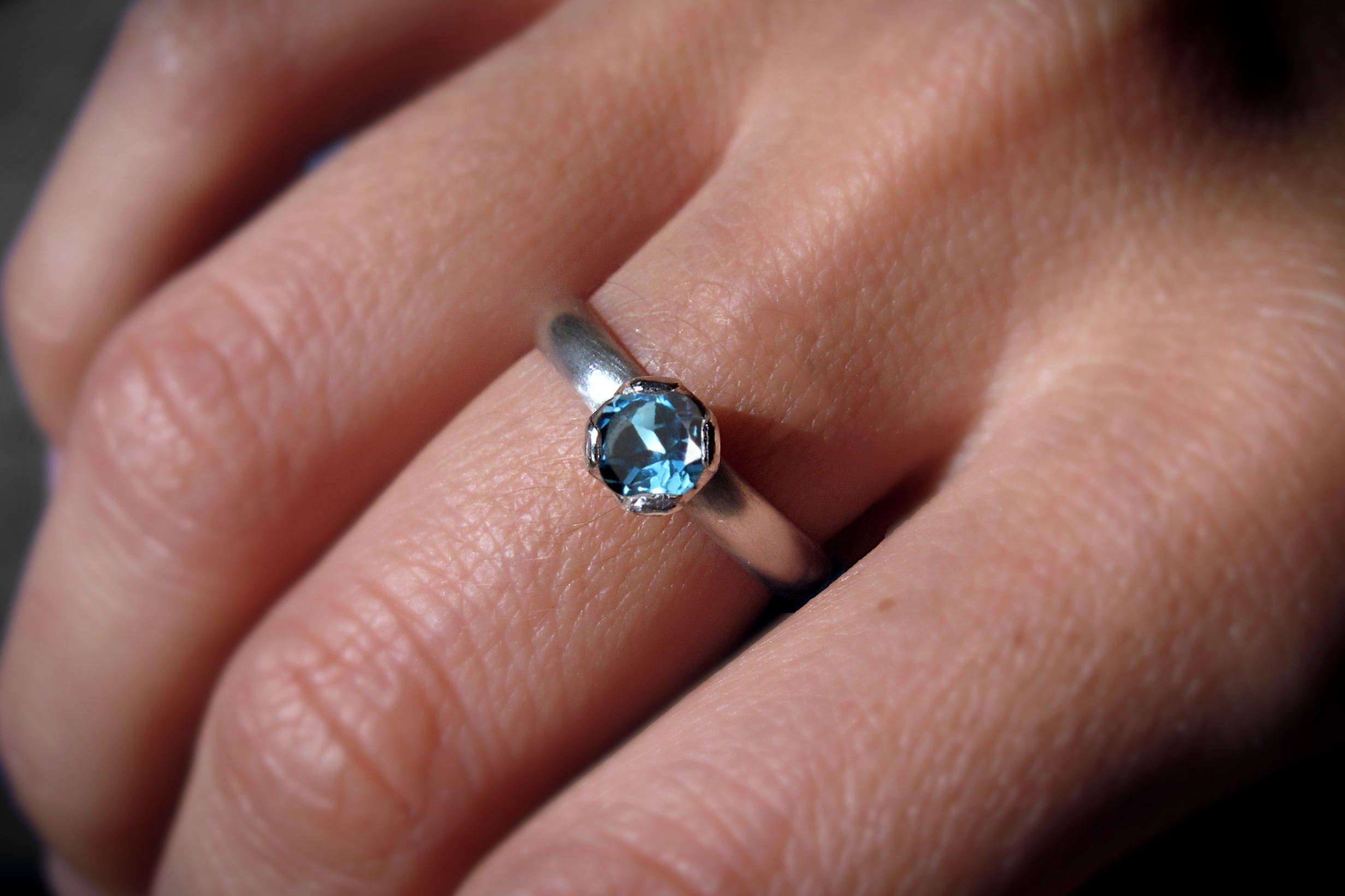 This is a handmade Sterling silver ring with a diamond-cut London Blue Topaz. This ring has a D profile and could be given as an engagement ring or to anyone who appreciates a delicate, handcrafted piece. The stone is set in a sturdy bezel that is handcrafted to fit each stone perfectly. This bezel is then filed to a crown-like shape to allow for more exposure of the gemstone.