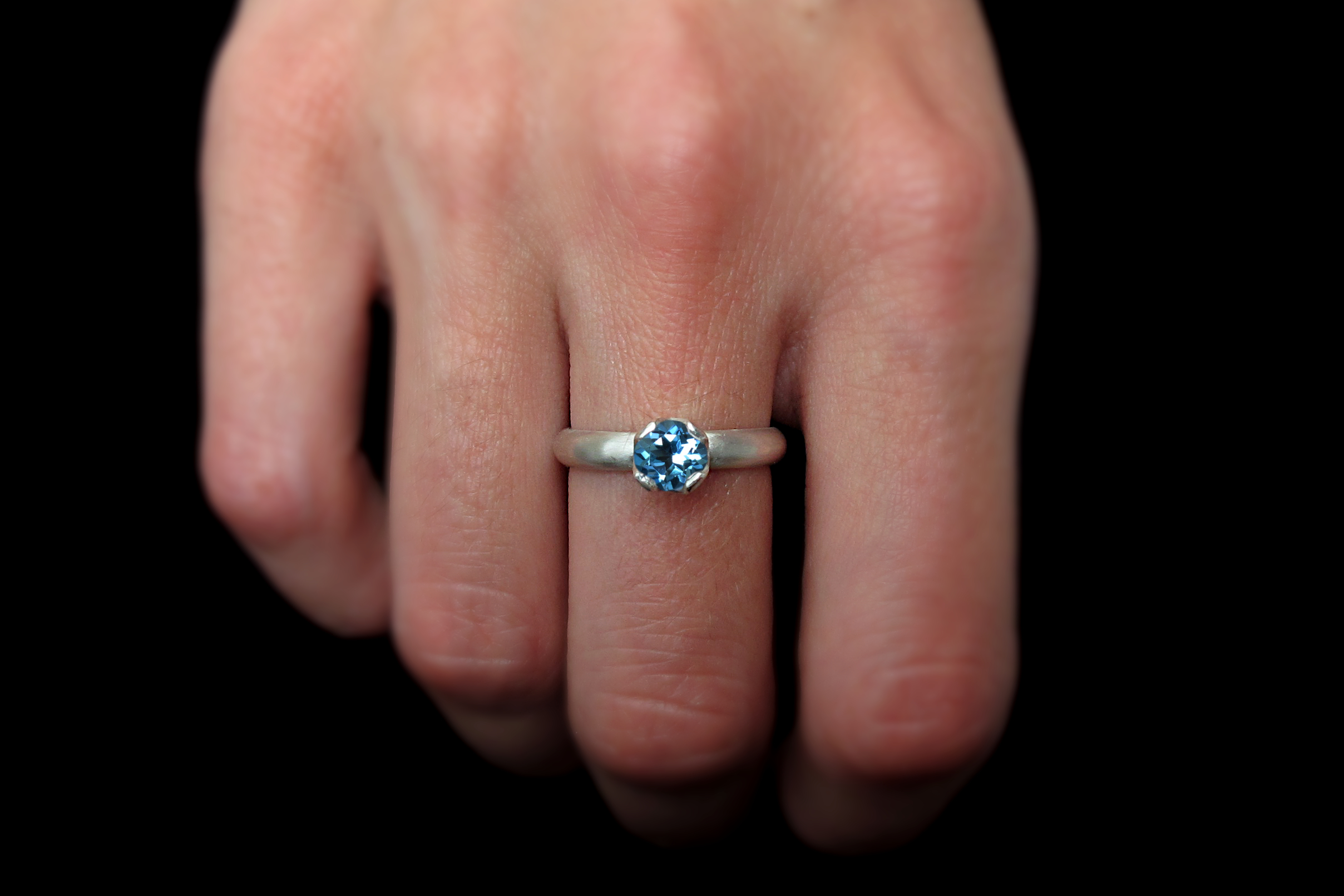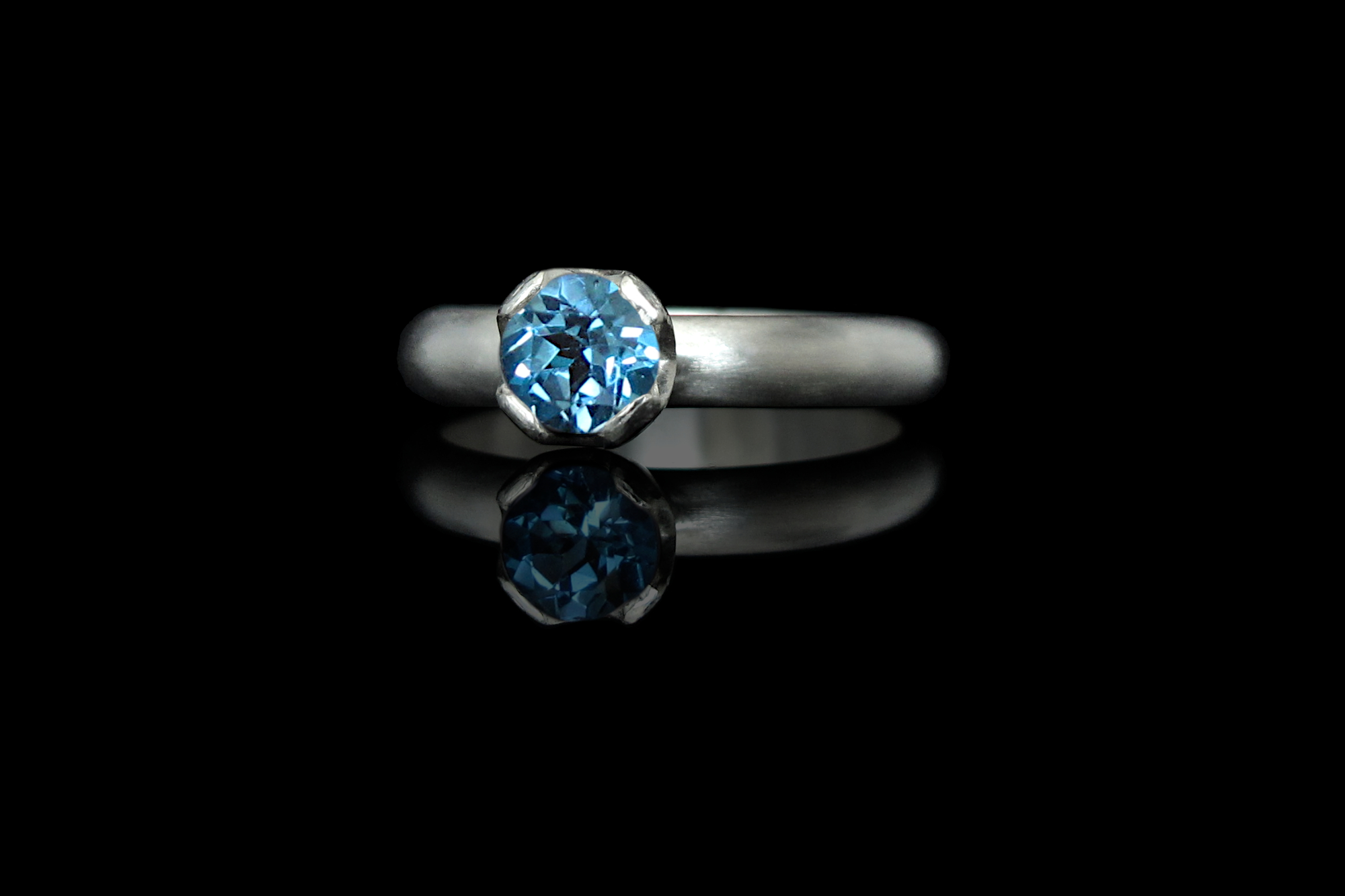 This is a handmade Sterling silver ring with a genuine diamond-cut Swiss Blue Topaz. This ring has a D profile and could be given as an engagement ring or to anyone who appreciates a delicate, handcrafted piece. The stone is set in a sturdy bezel that is handcrafted to fit each stone perfectly. This bezel is then filed to a crown-like shape to allow for more exposure of the gemstone.
