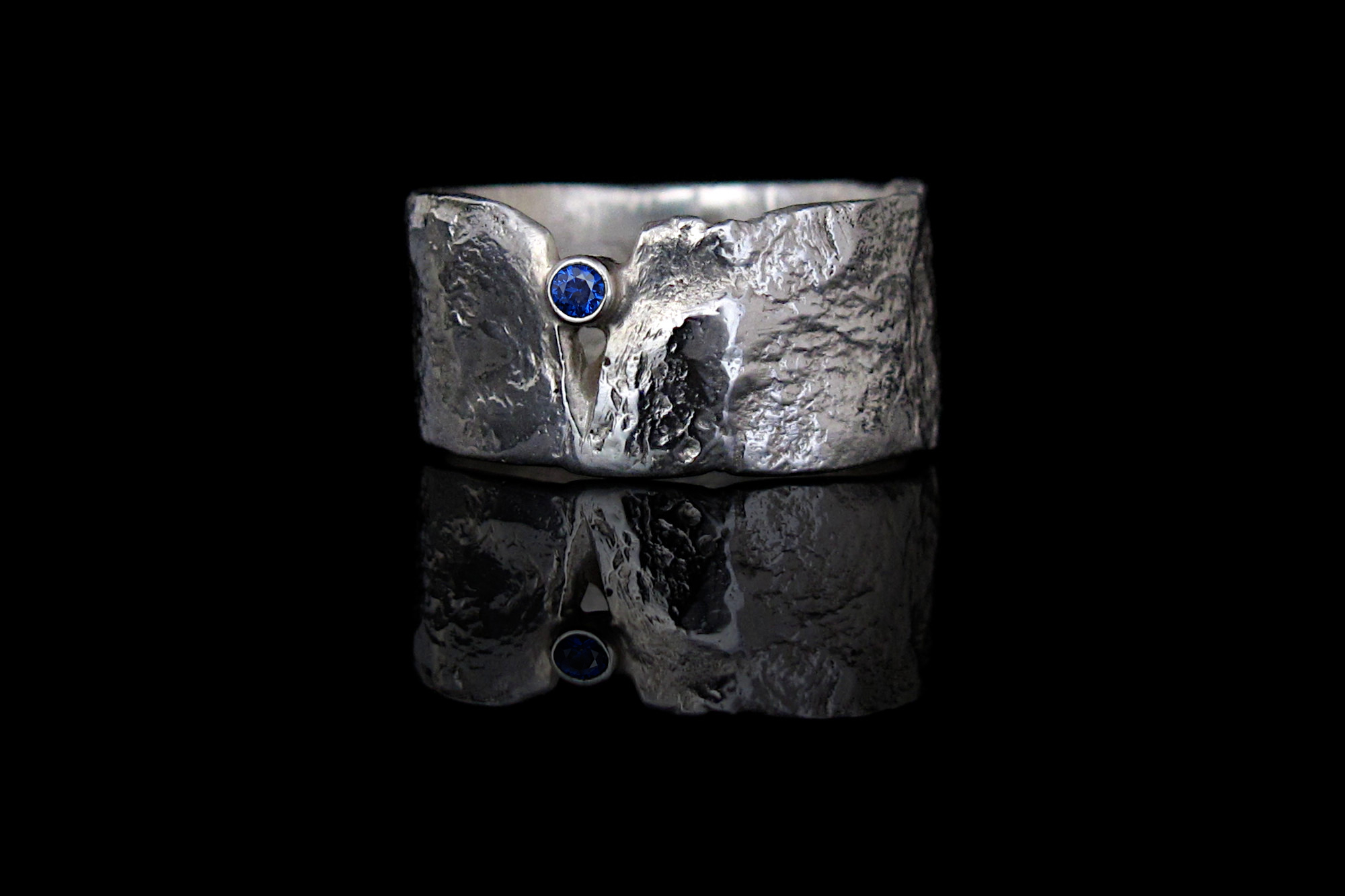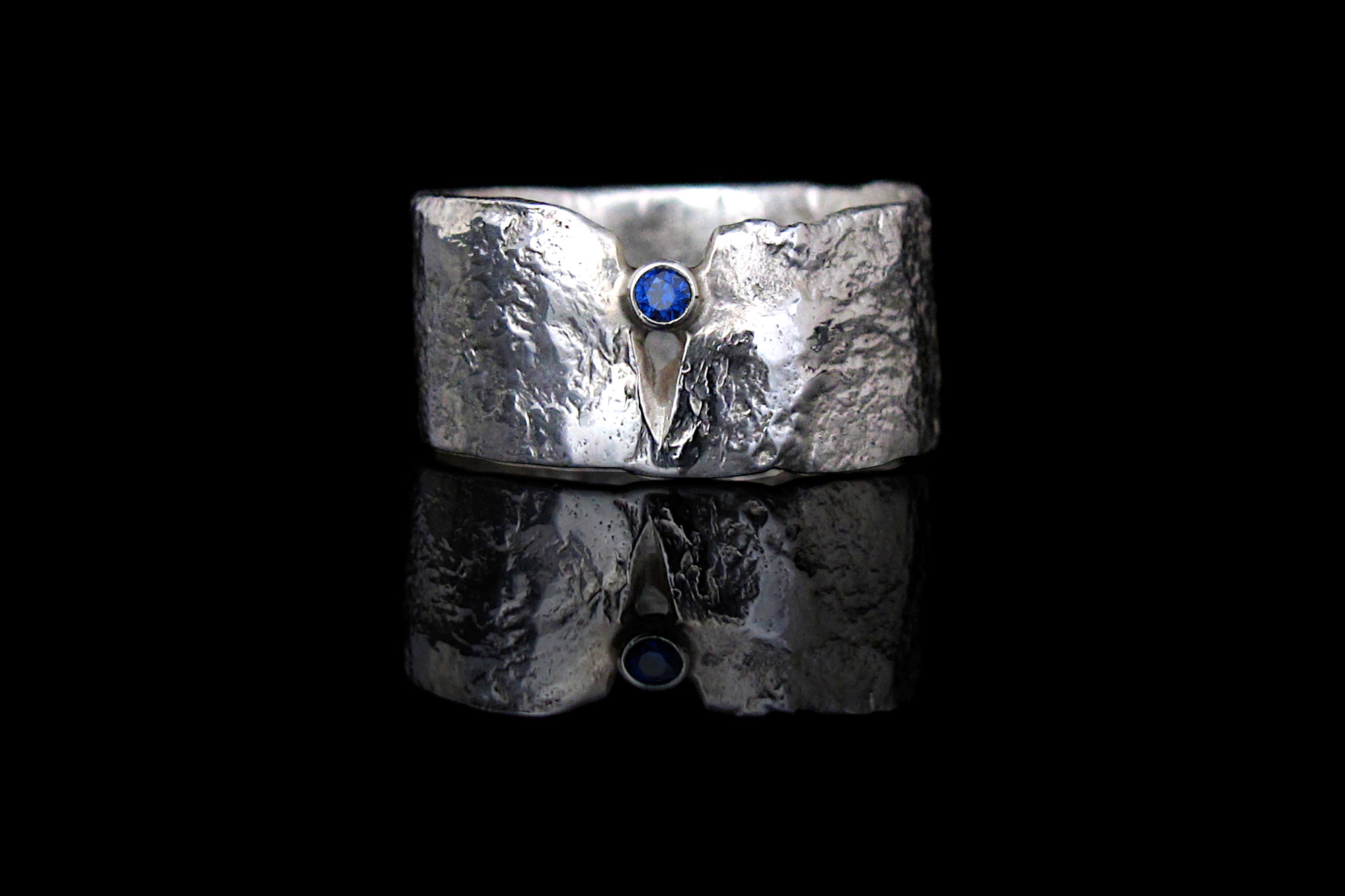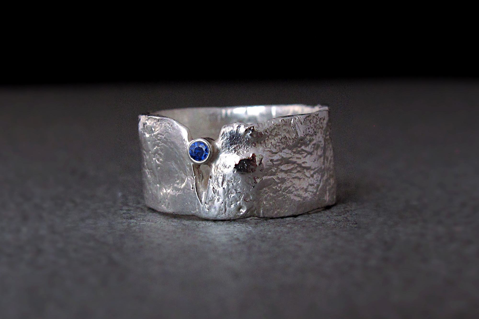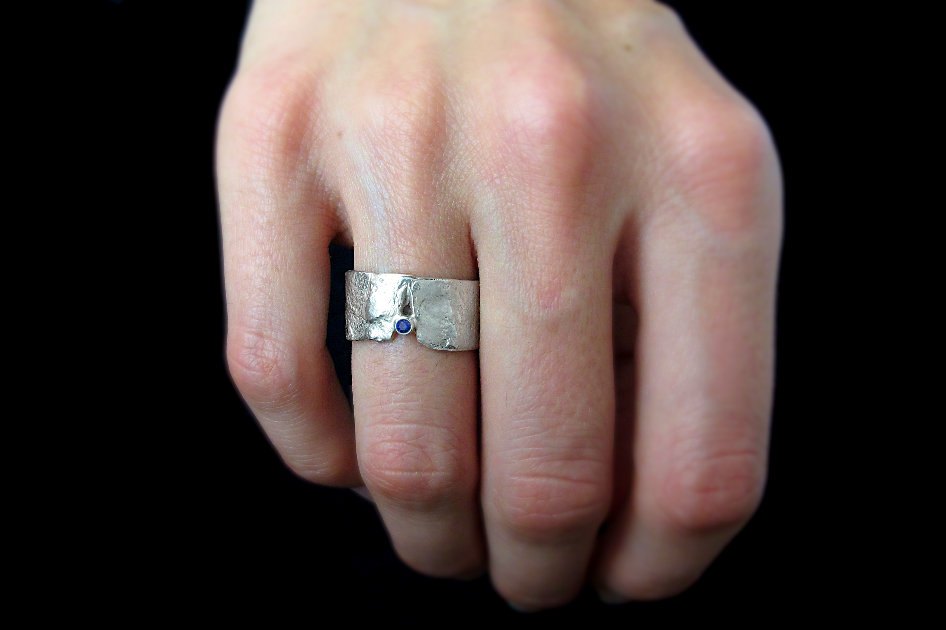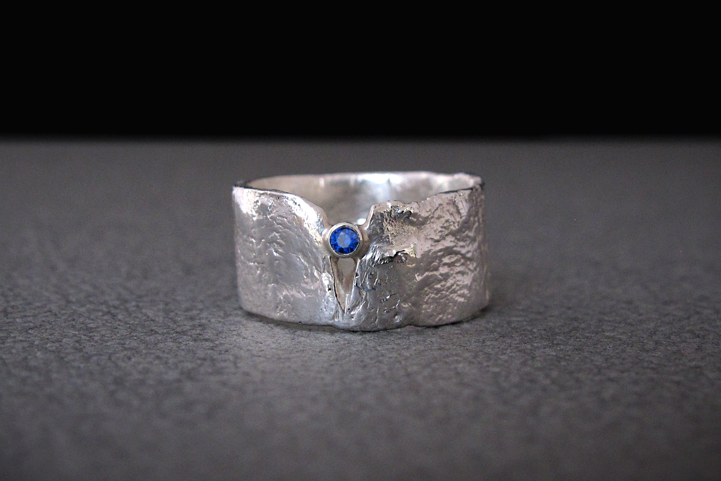 Sterling silver ring with rustic texture and a genuine diamond-cut blue Sapphire. This is a statement ring with an eye-catching contrast between the delicacy of the gemstone and the brutalist style of the melted silver. This is one of our best-selling pieces, loved by men and women alike.