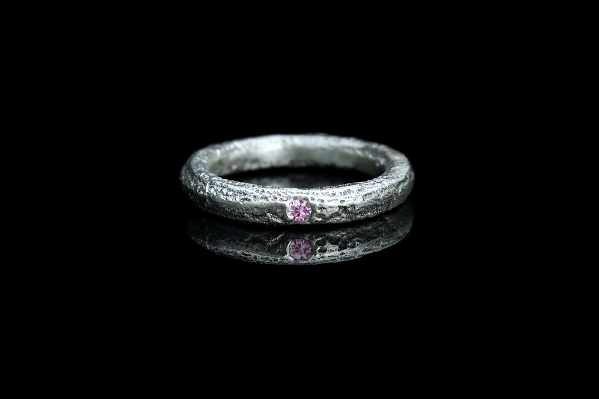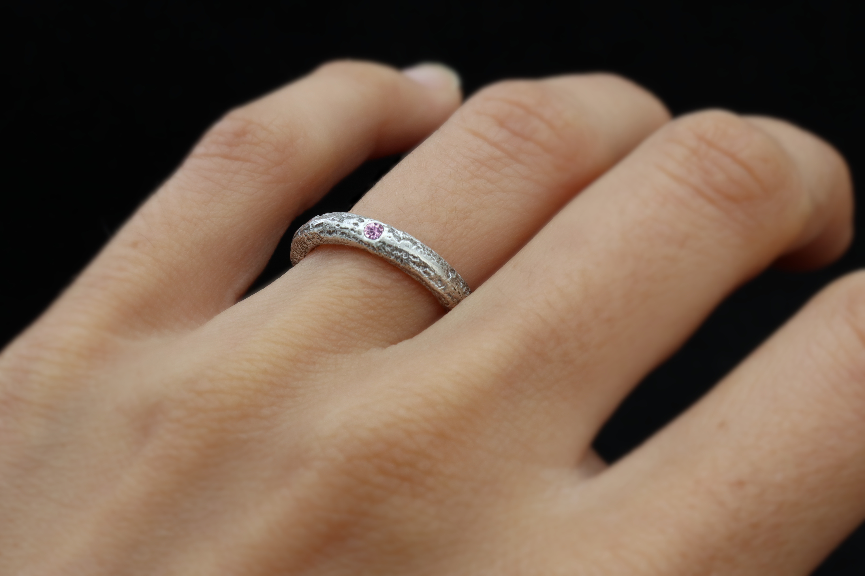 Hand made Sterling silver ring with a pink Sapphire. This piece has a harmonious balance between the rustic texture of the silver and the delicacy of the gemstone, offering a unique alternative to the traditional engagement/wedding ring. The gemstone is flush-set on the surface of the ring, creating a comfortable and durable piece.