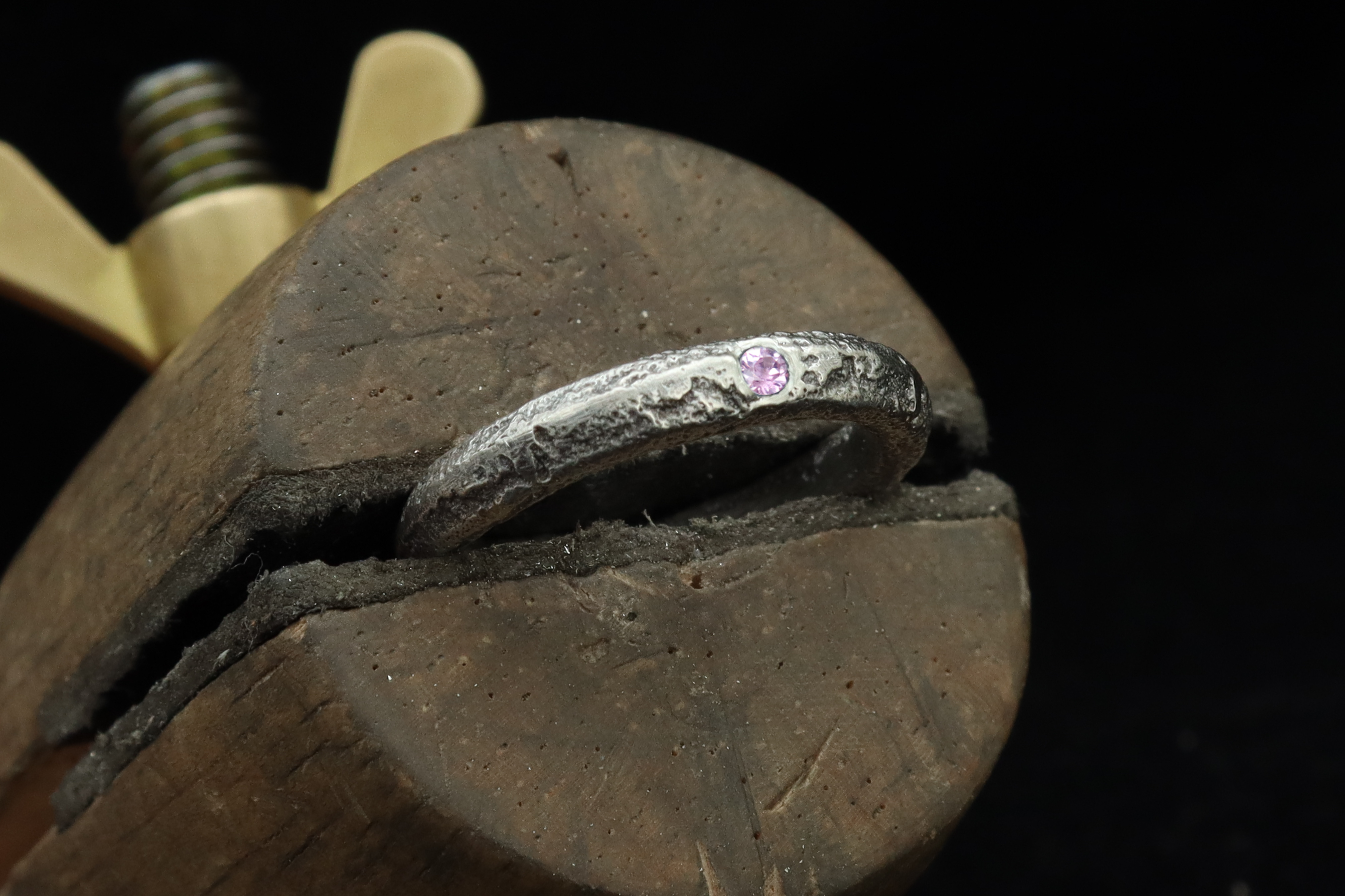 To create this piece we employ the ancient method of sand casting, where molten Sterling silver is poured in a sand mold. Each mold is carefully prepared to yield a ring in the precise size needed for each customer and the texture is added by hand with a very small tool before pouring the metal. The whole process is unique to each ring, and therefore the result is a one of a kind piece that cannot be exactly replicated.