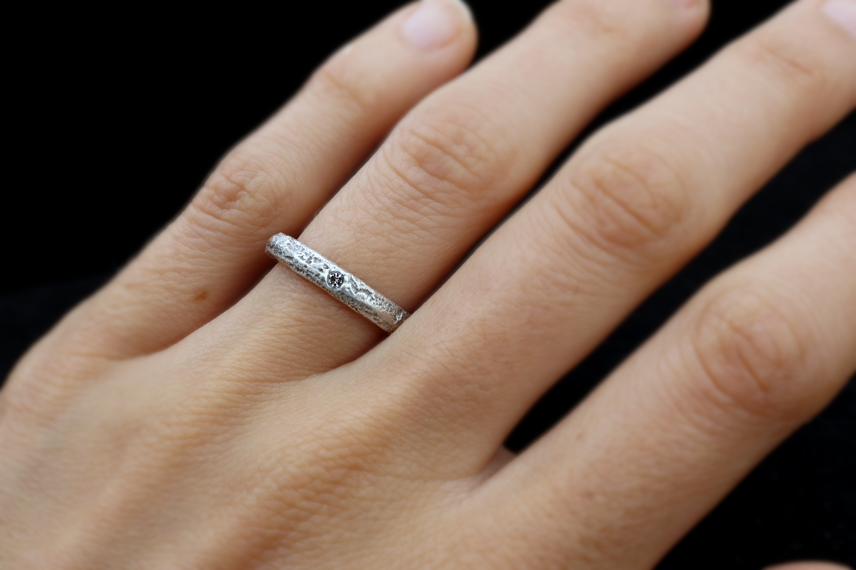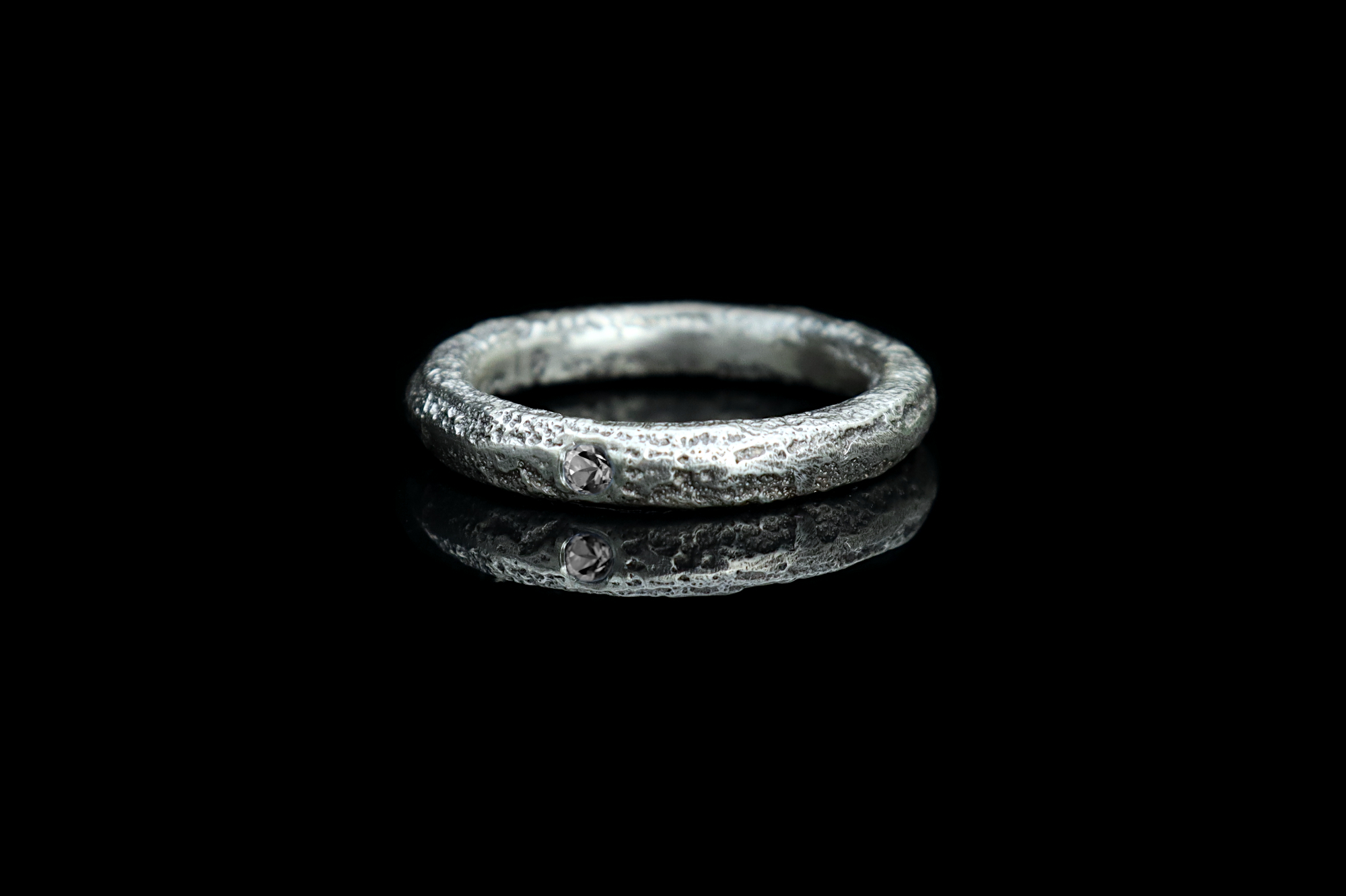 To create this piece we employ the ancient method of sand casting, where molten Sterling silver is hand poured in a sand mold. Each mold is carefully prepared to yield a ring in the precise size needed for each customer and the texture is added by hand with a very small tool before pouring the metal. The whole process is unique to each ring, and therefore the result is a one of a kind piece that cannot be exactly replicated.