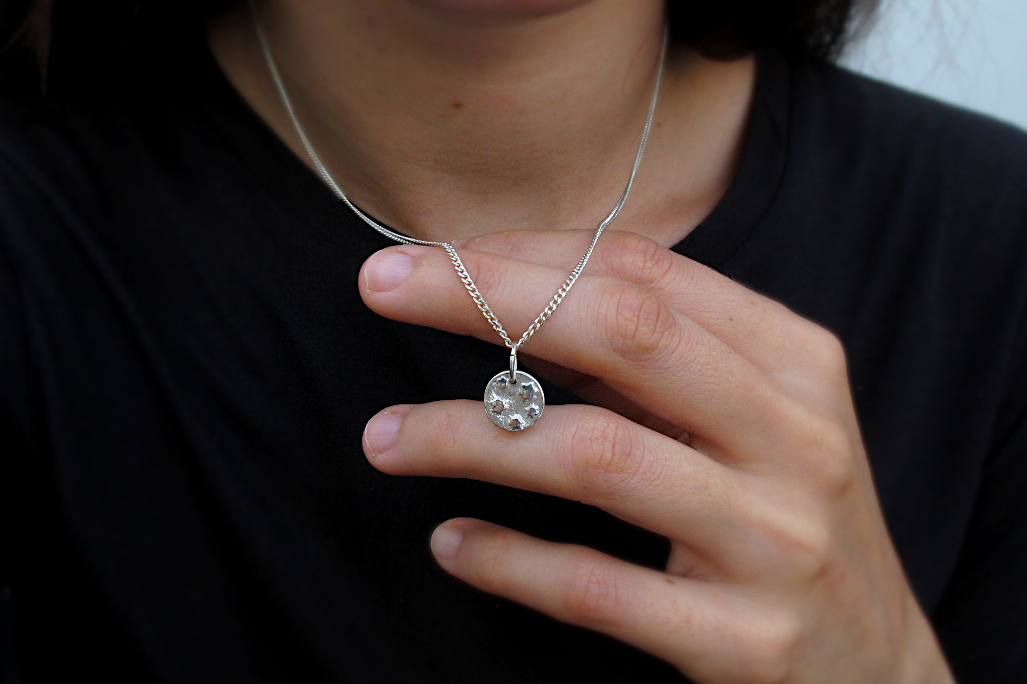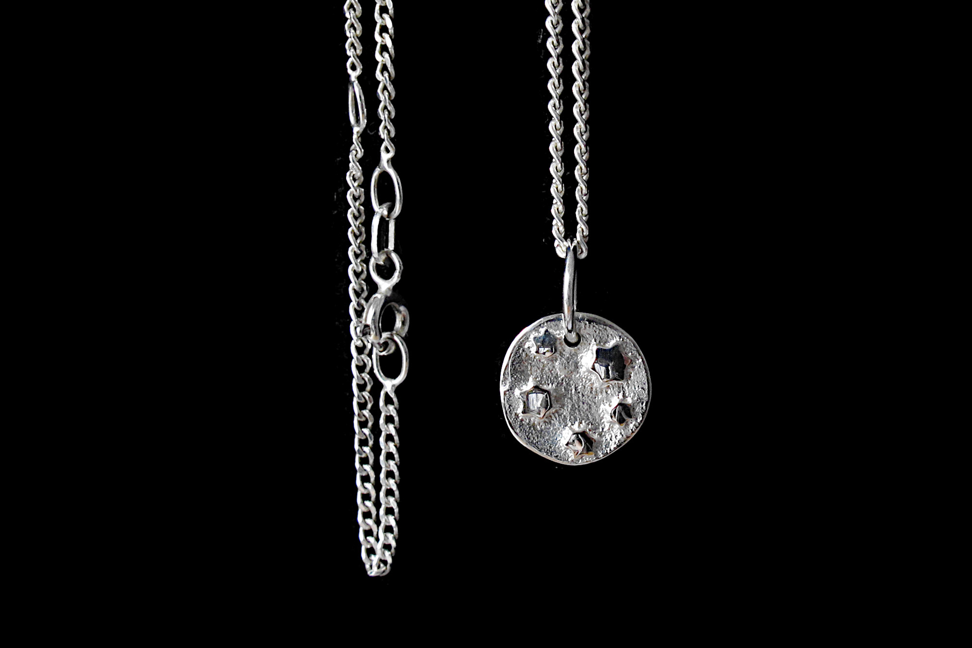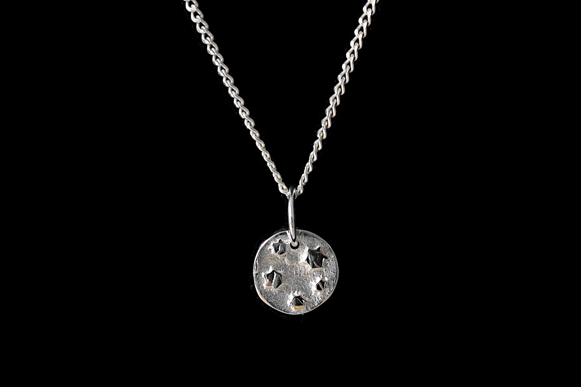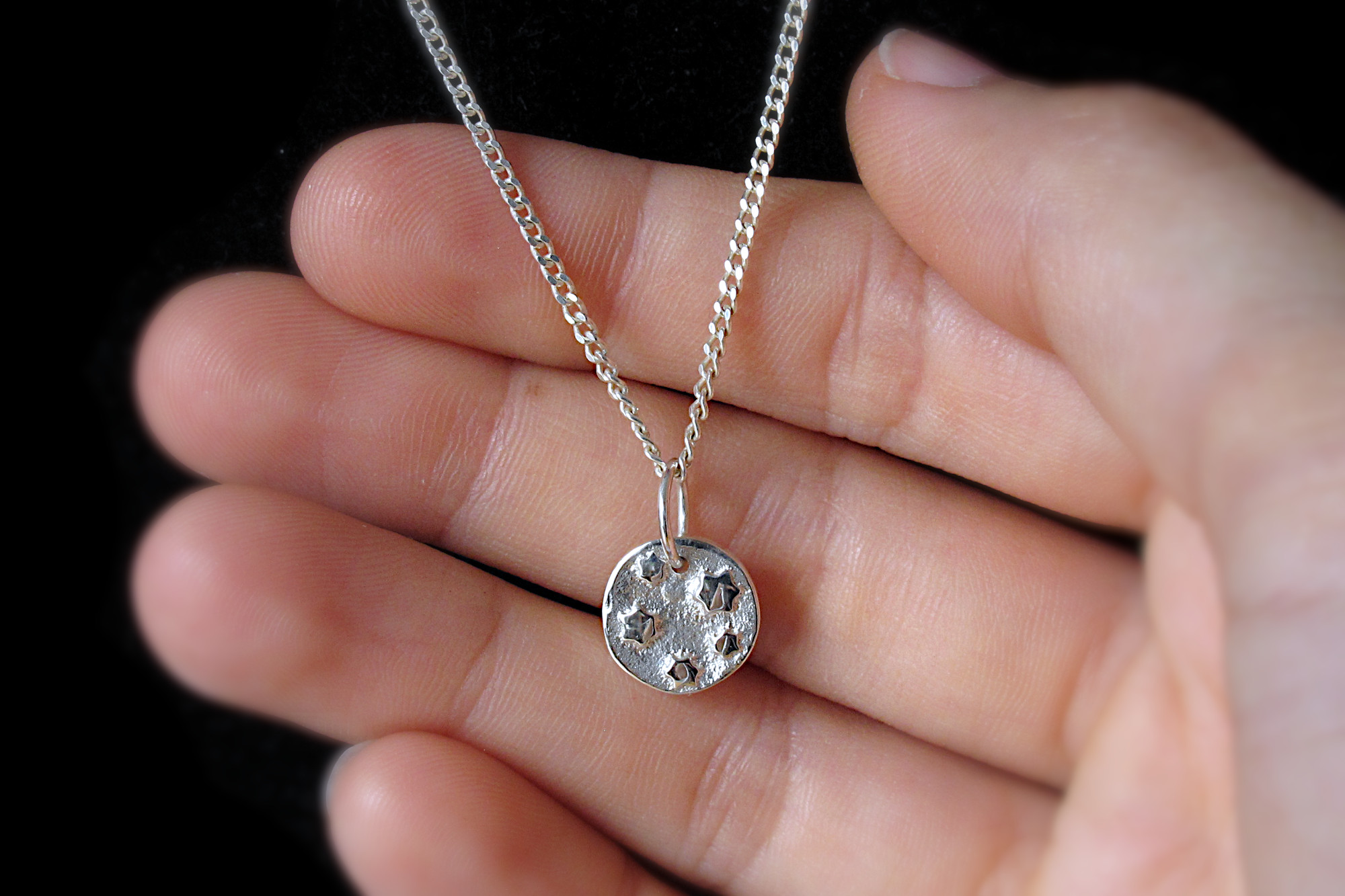 This is a textured Sterling silver disc with raised and polished stars. It hangs on an adjustable silver chain and is makes for a beautiful and life long gift.