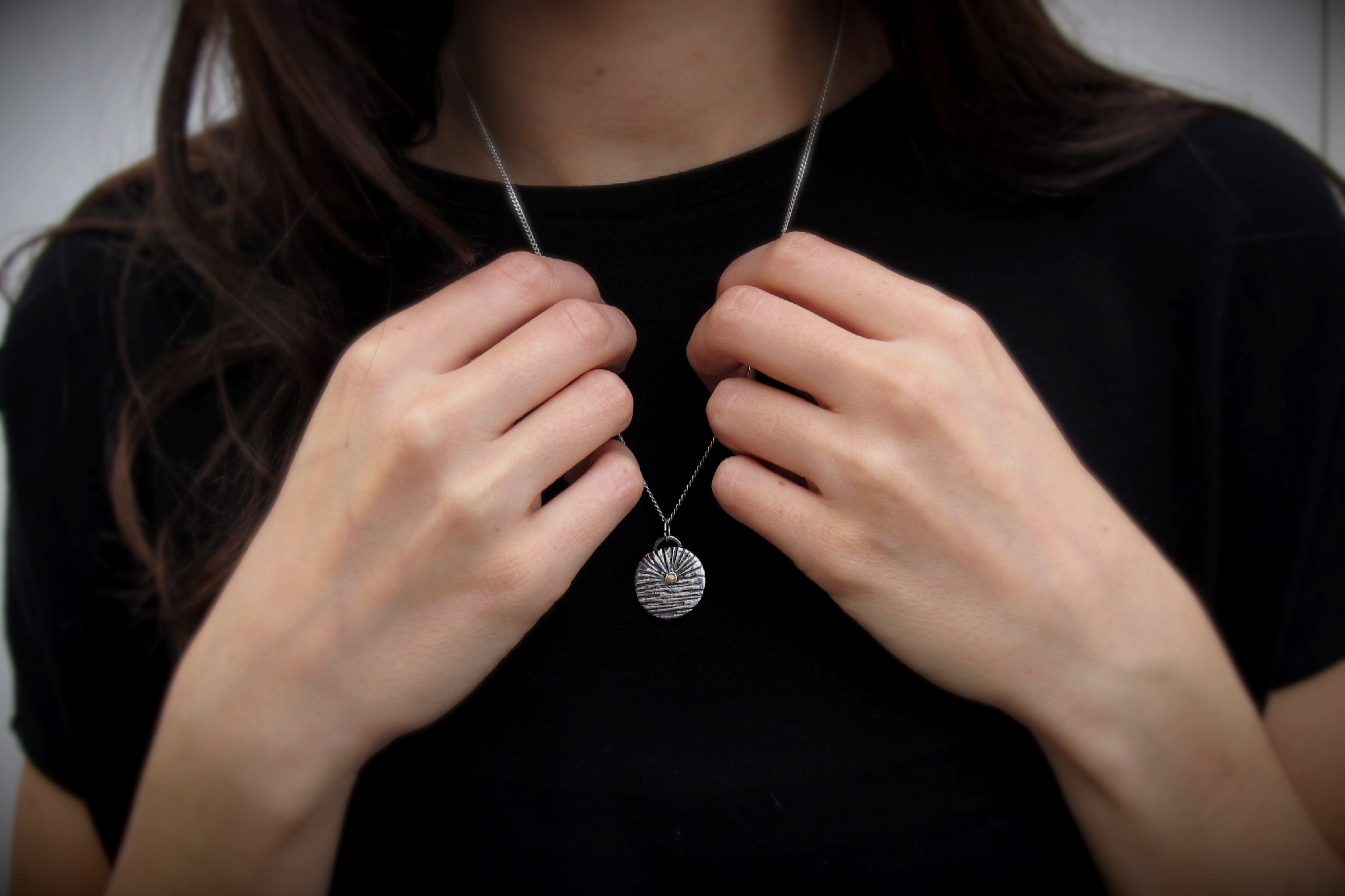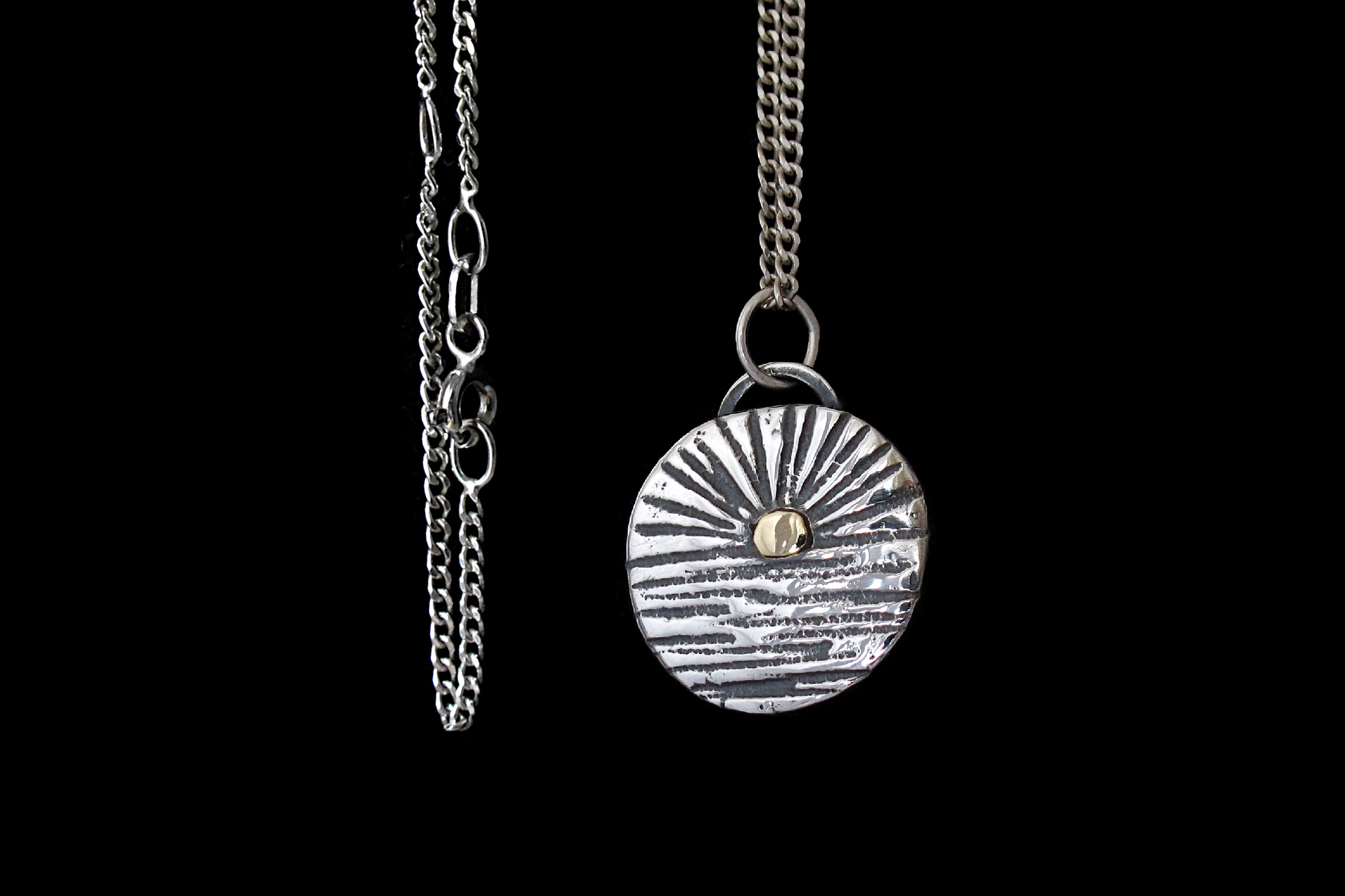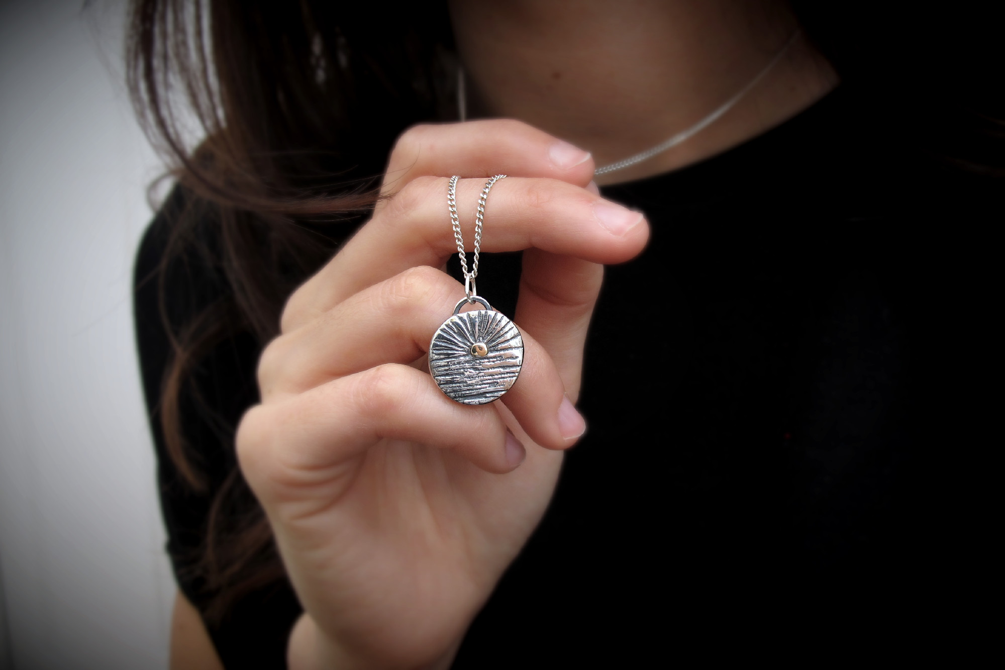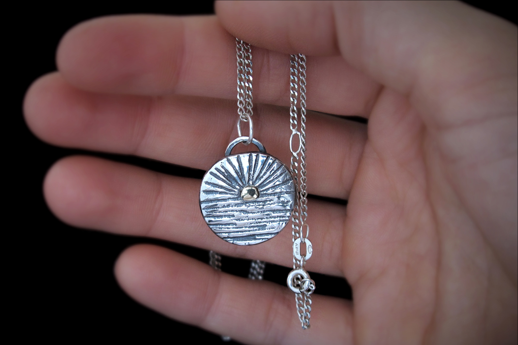 This is a Sterling silver charm with an extendable 45-50cm diamond cut curb chain. The charm is hand carved and then cast in sand, which gives it the distinctive textured finish. Yellow gold represents the sun setting behind the sea, and patina is added for contrast between metals and textures.