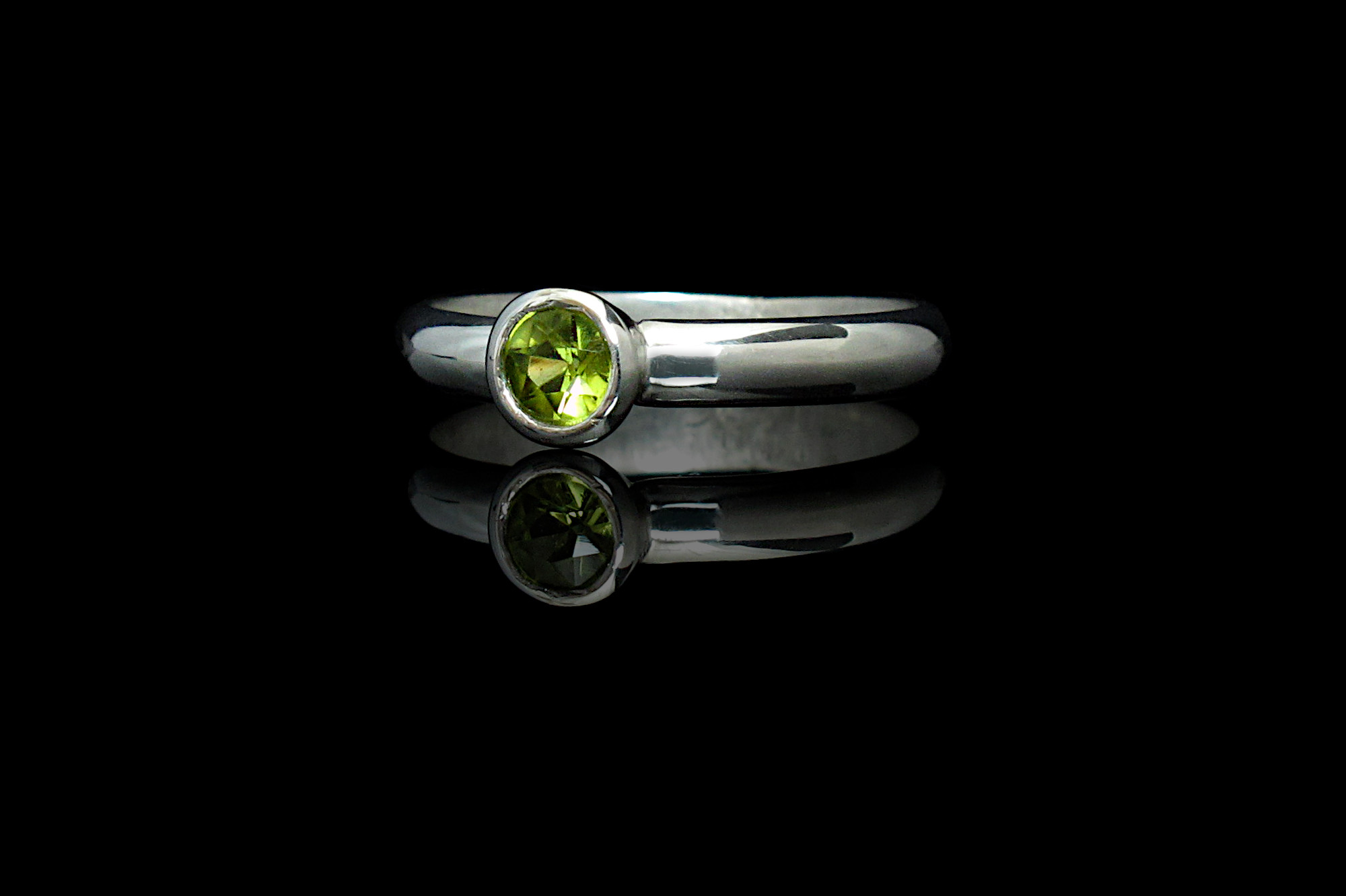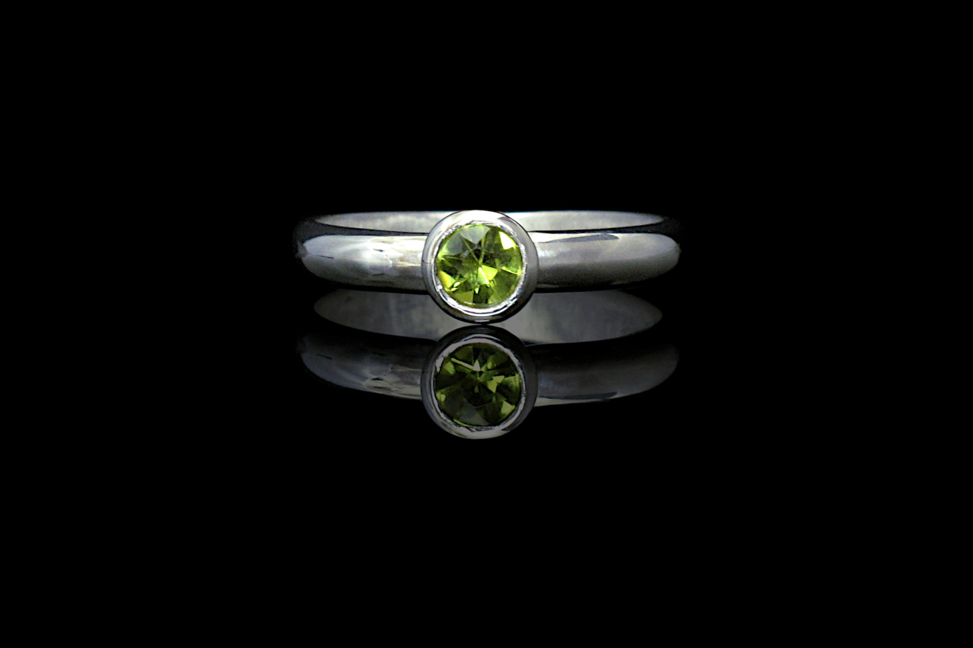 Handmade Sterling silver ring with high polish and a genuine diamond-cut Peridot in a bezel setting.
