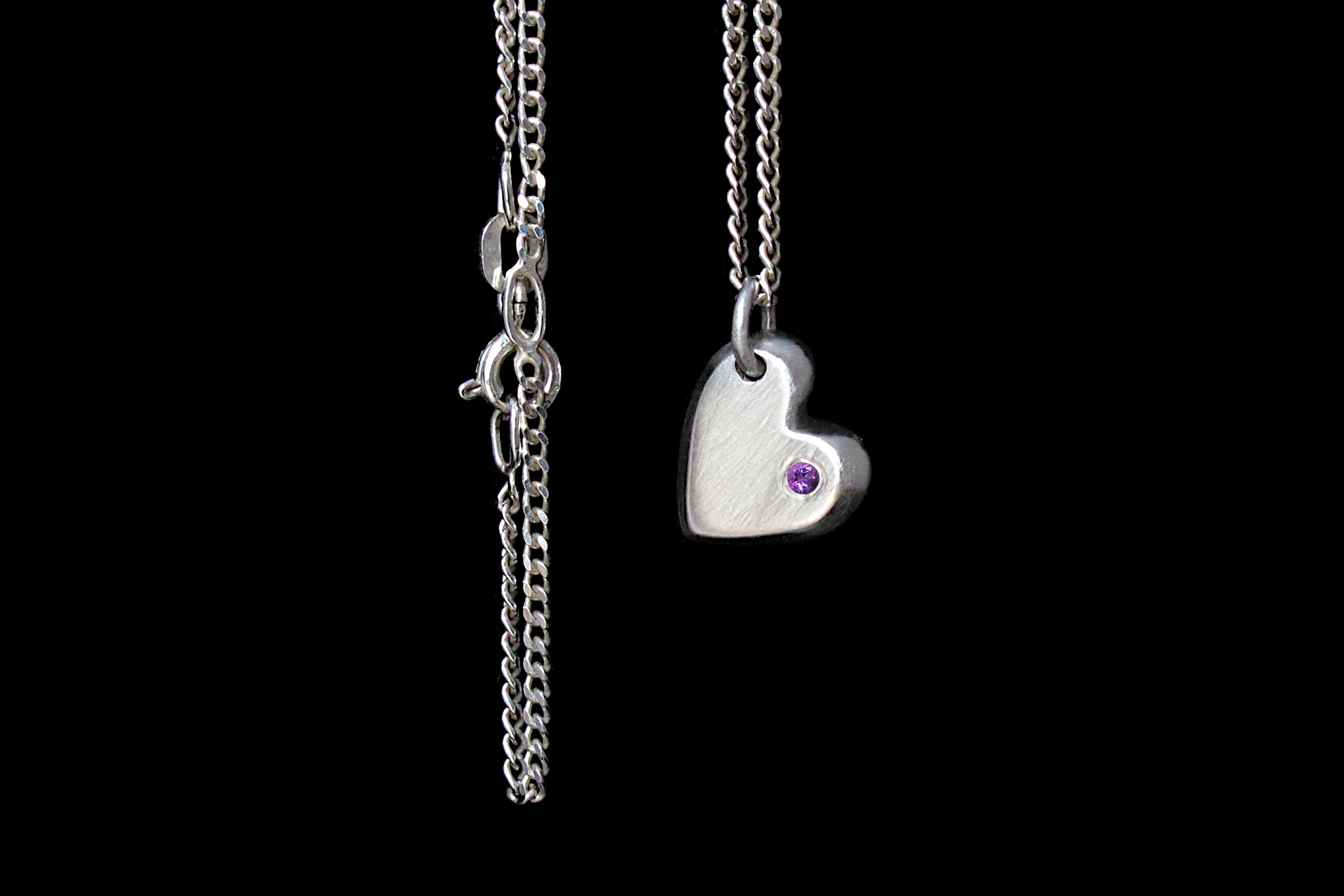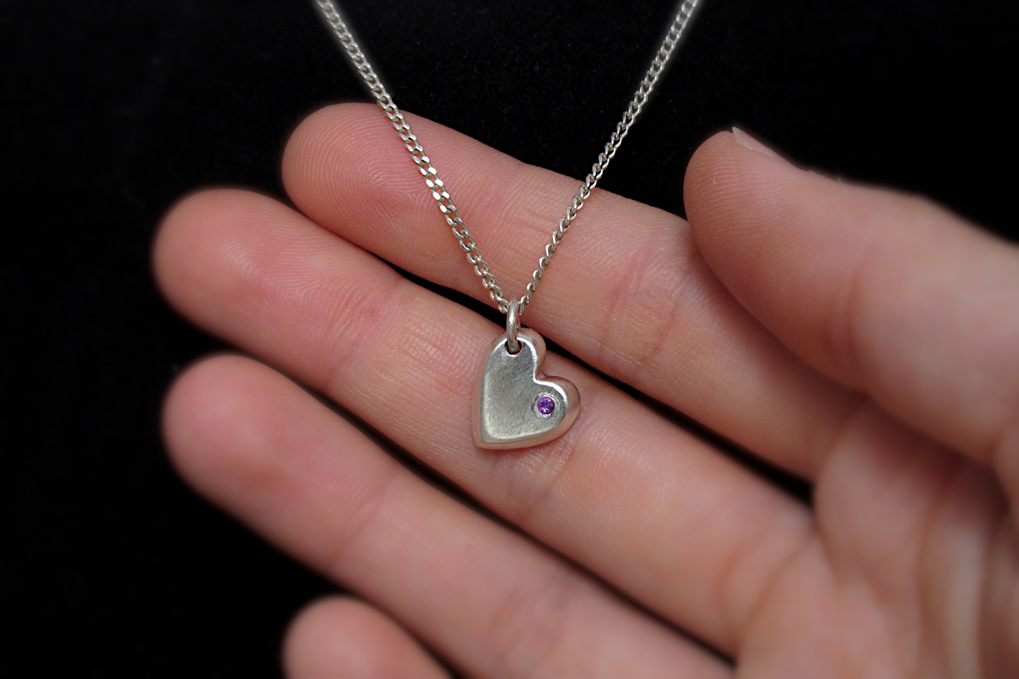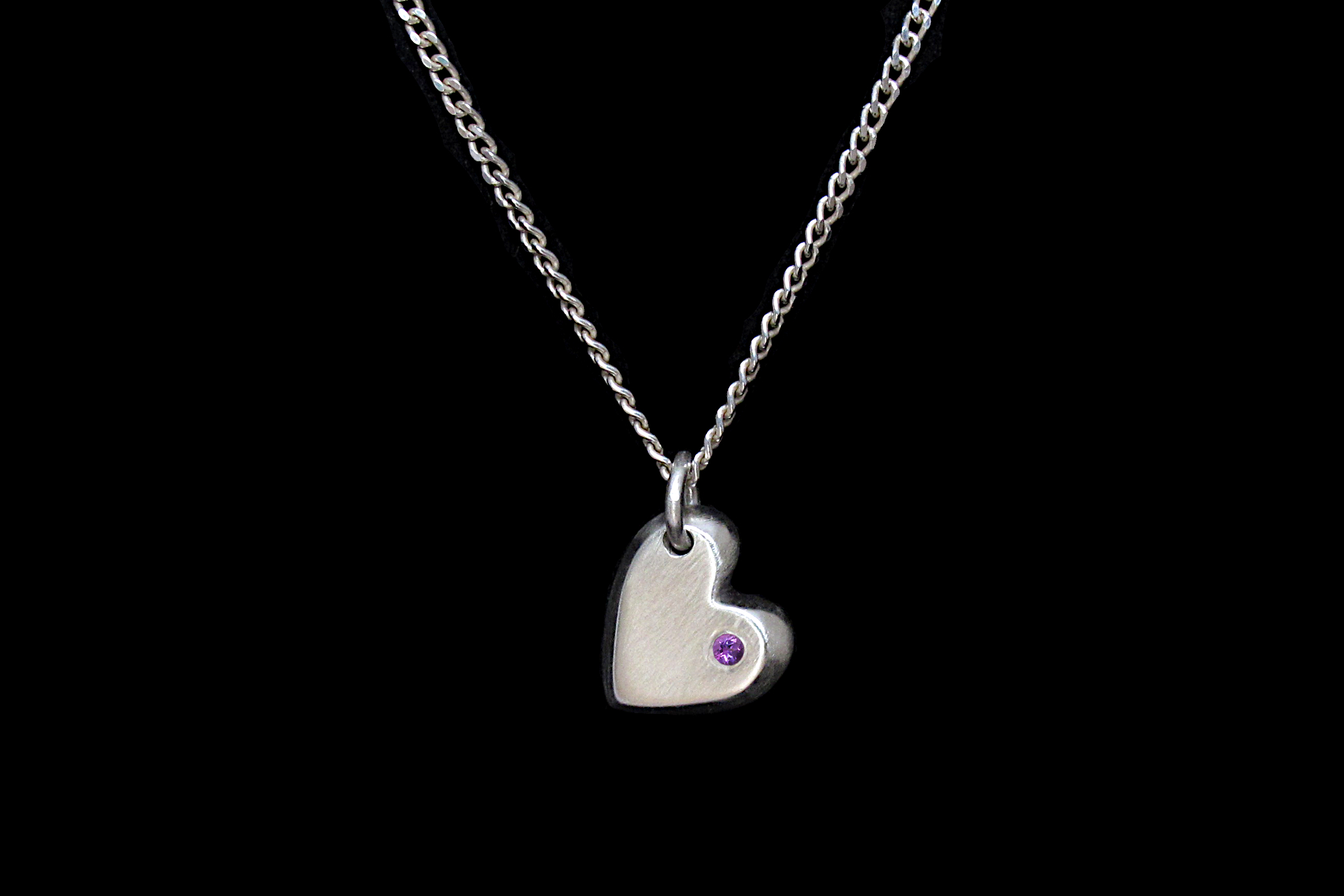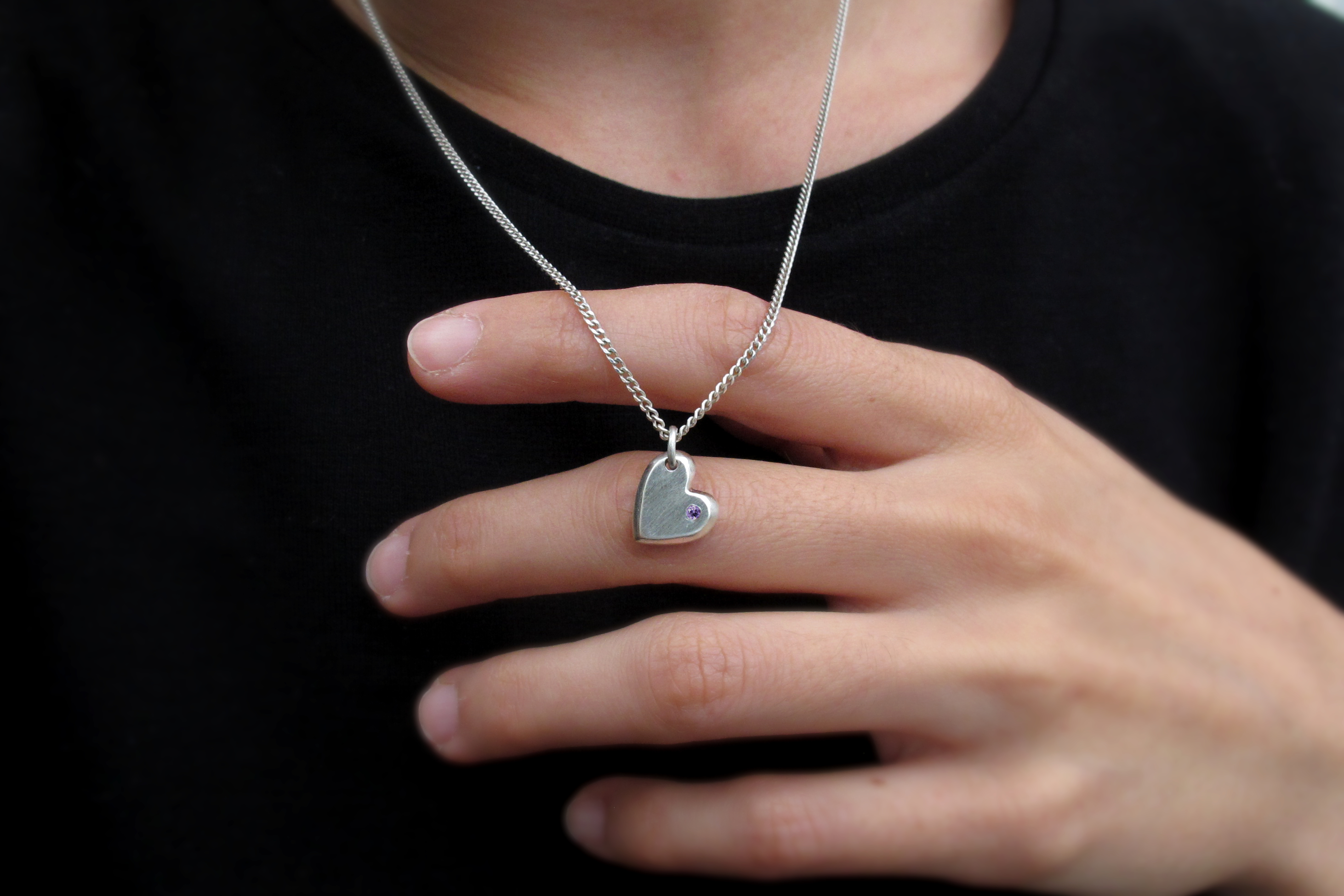 This is a Sterling silver heart shaped charm with a small flush-set Amethyst. We cast each heart in sand for a solid and textured charm, which comes with an adjustable Sterling silver chain.