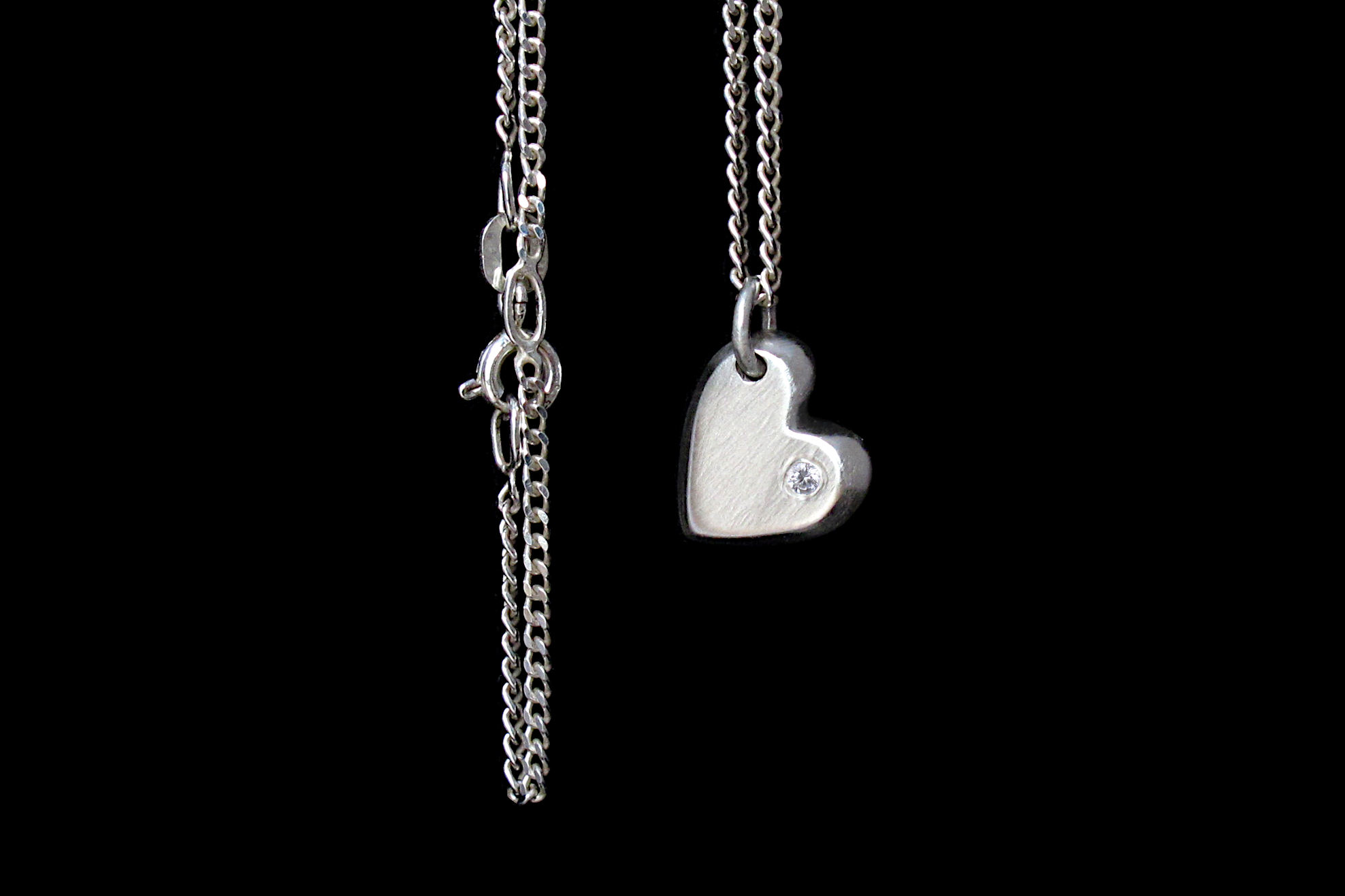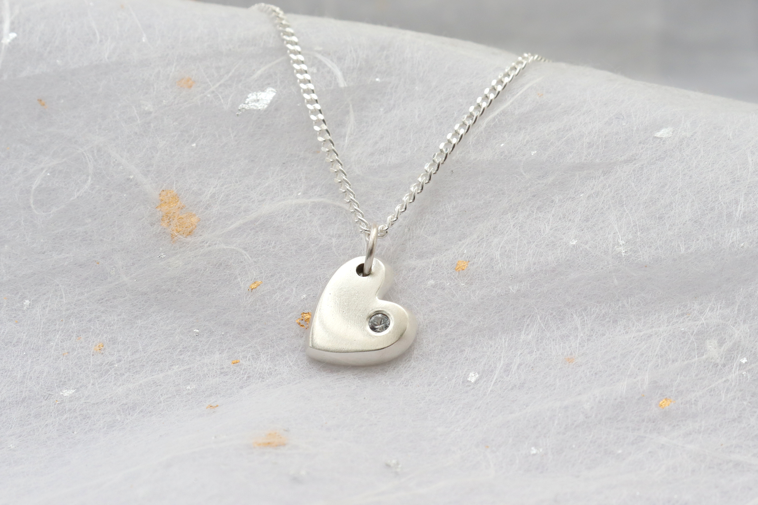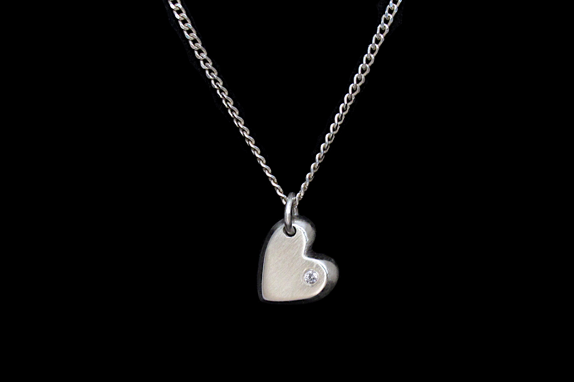 This is a Sterling silver heart shaped charm with a small flush-set White Sapphire. We cast each heart in sand for a solid and textured charm, which comes with an adjustable Sterling silver chain.