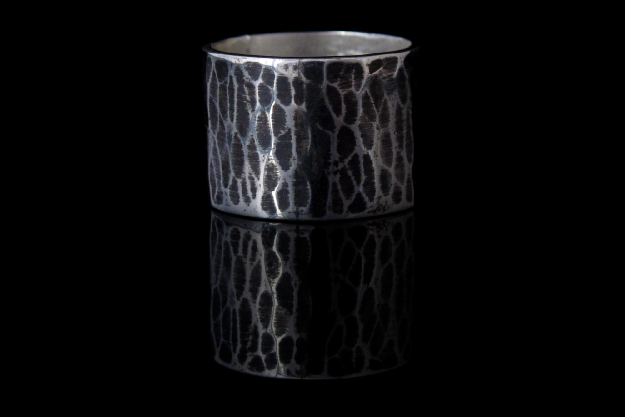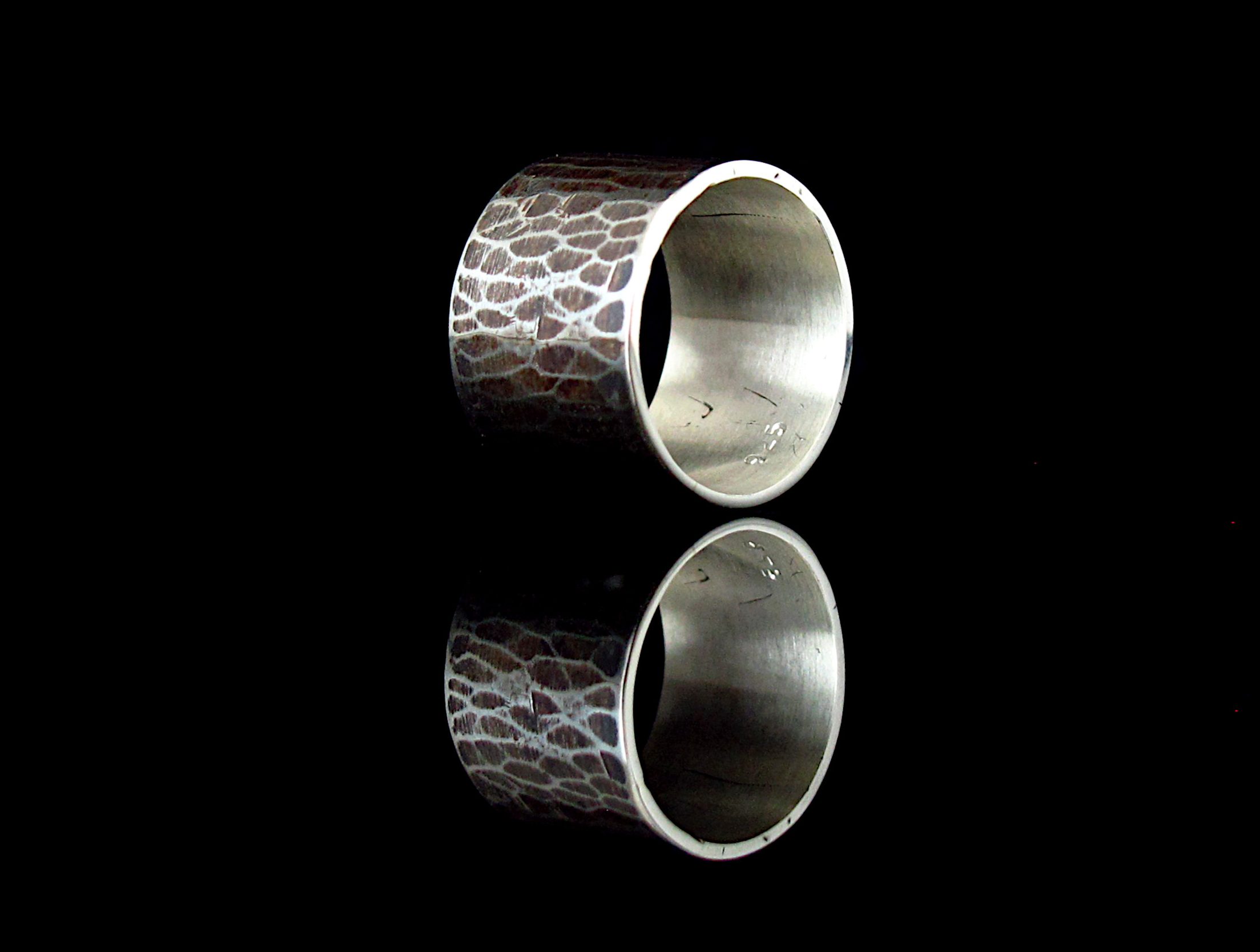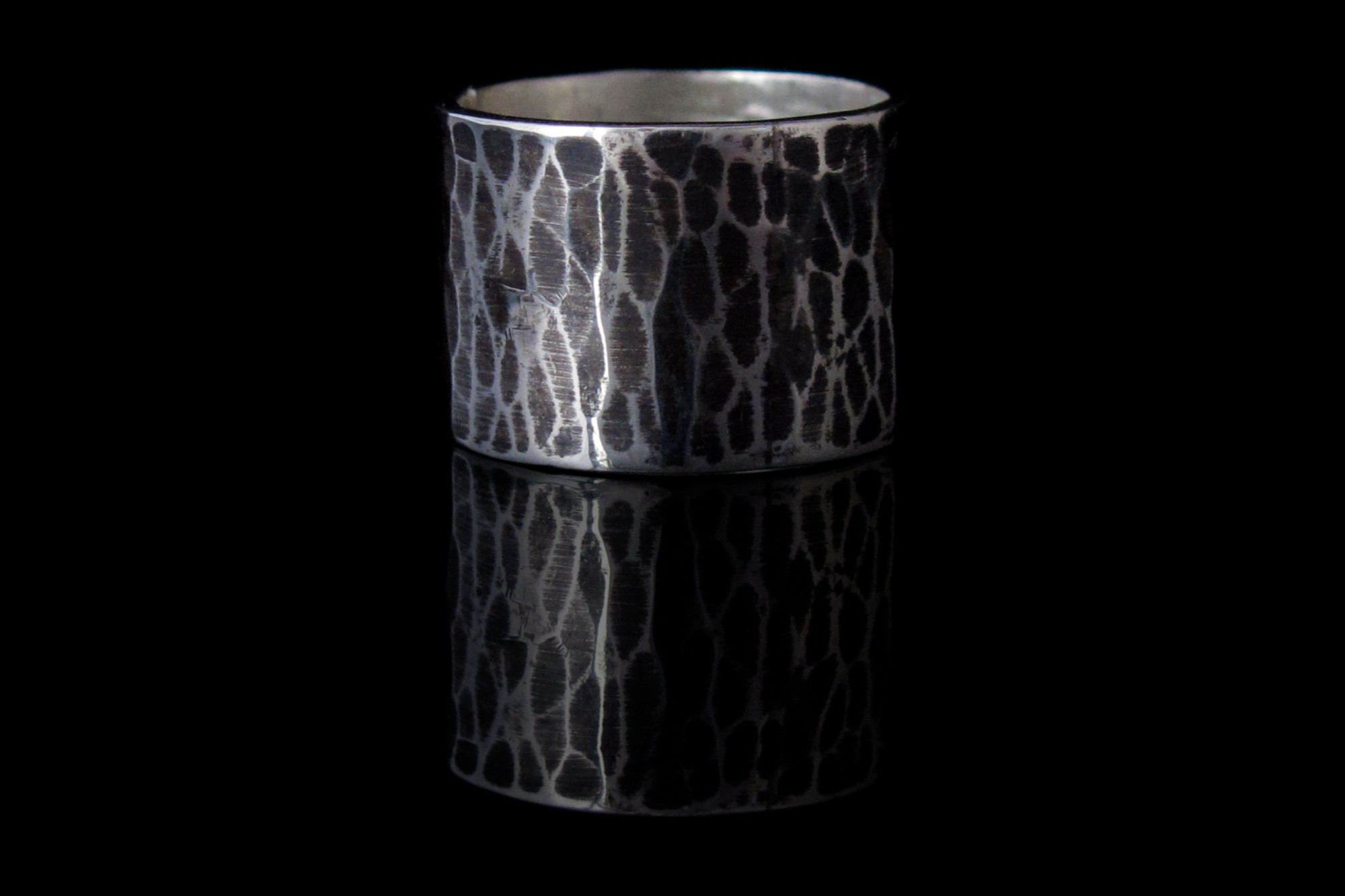Handmade wide Sterling silver ring with an oxidised snake-skin effect for men and women.