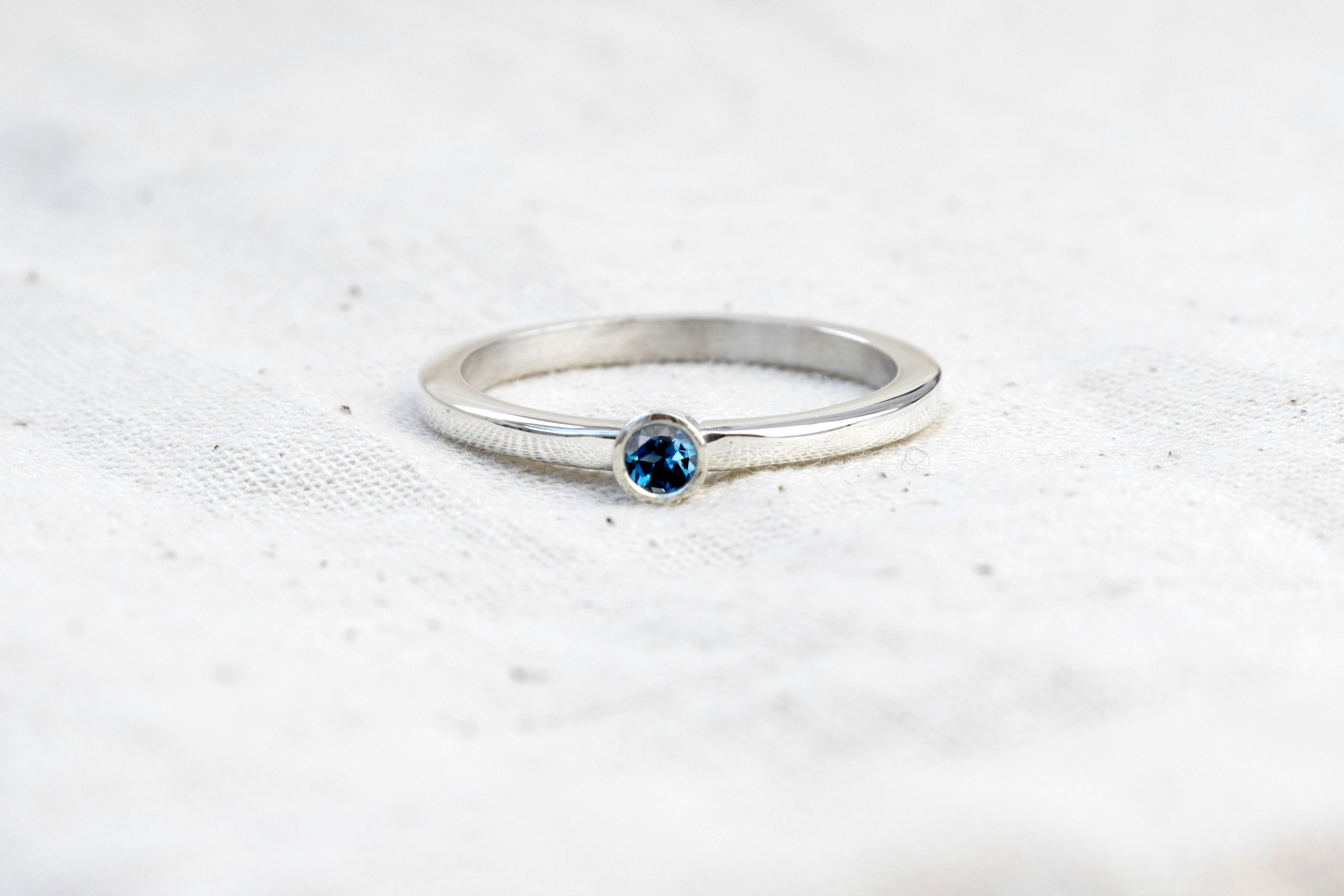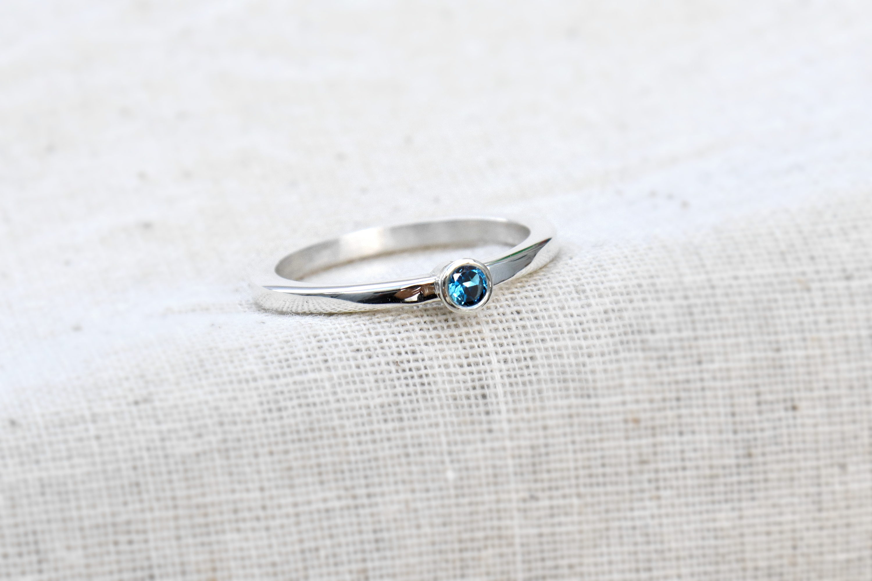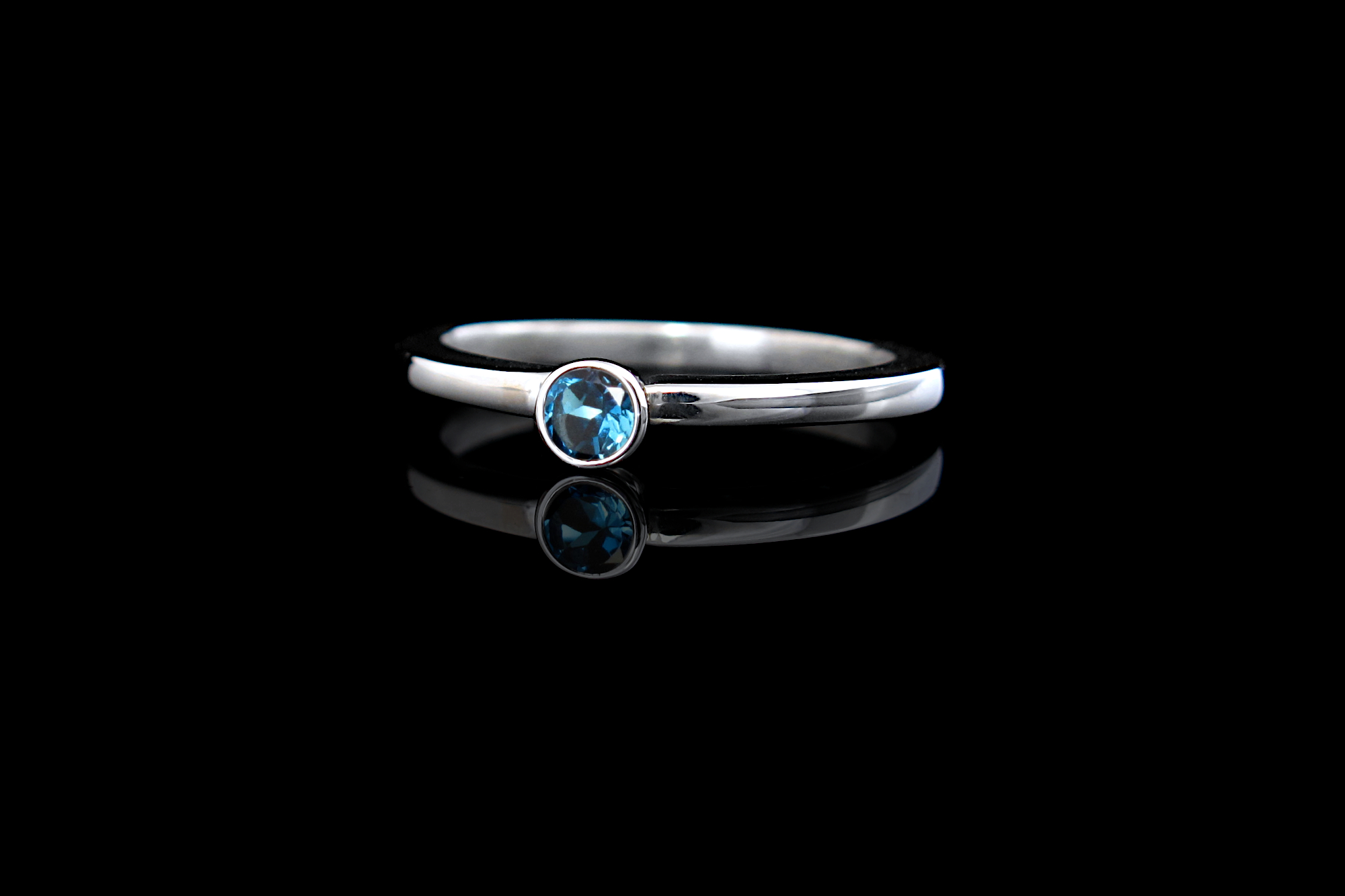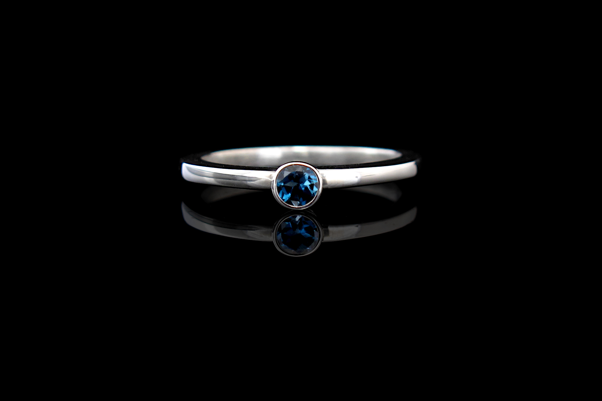 This is a Sterling silver and London Blue Topaz ring. The silver band has a square profile, making it the same width and thickness which has a modern and minimalist look. This ring makes for a great stacking ring, as well as an alternative promise/engagement ring.