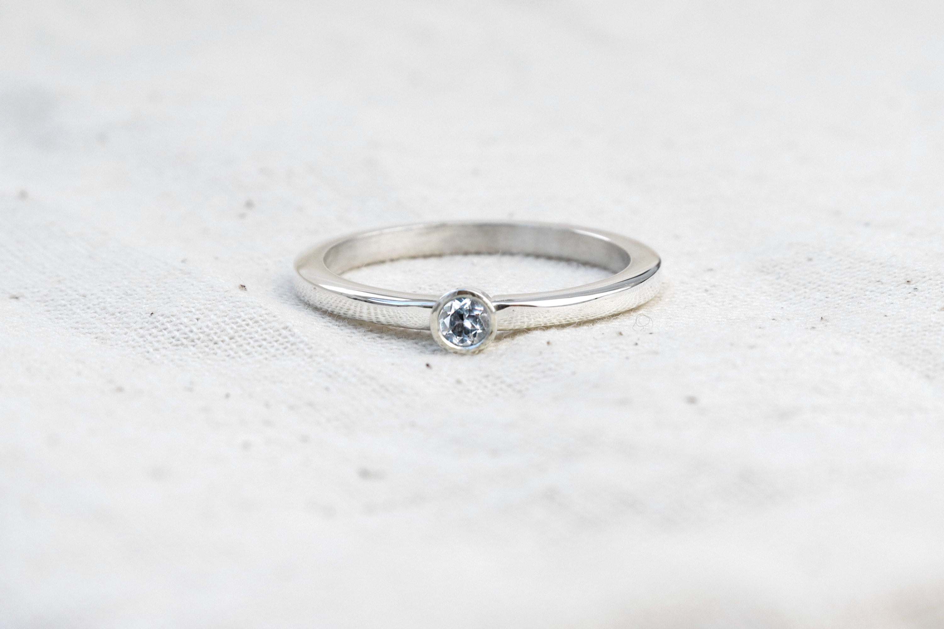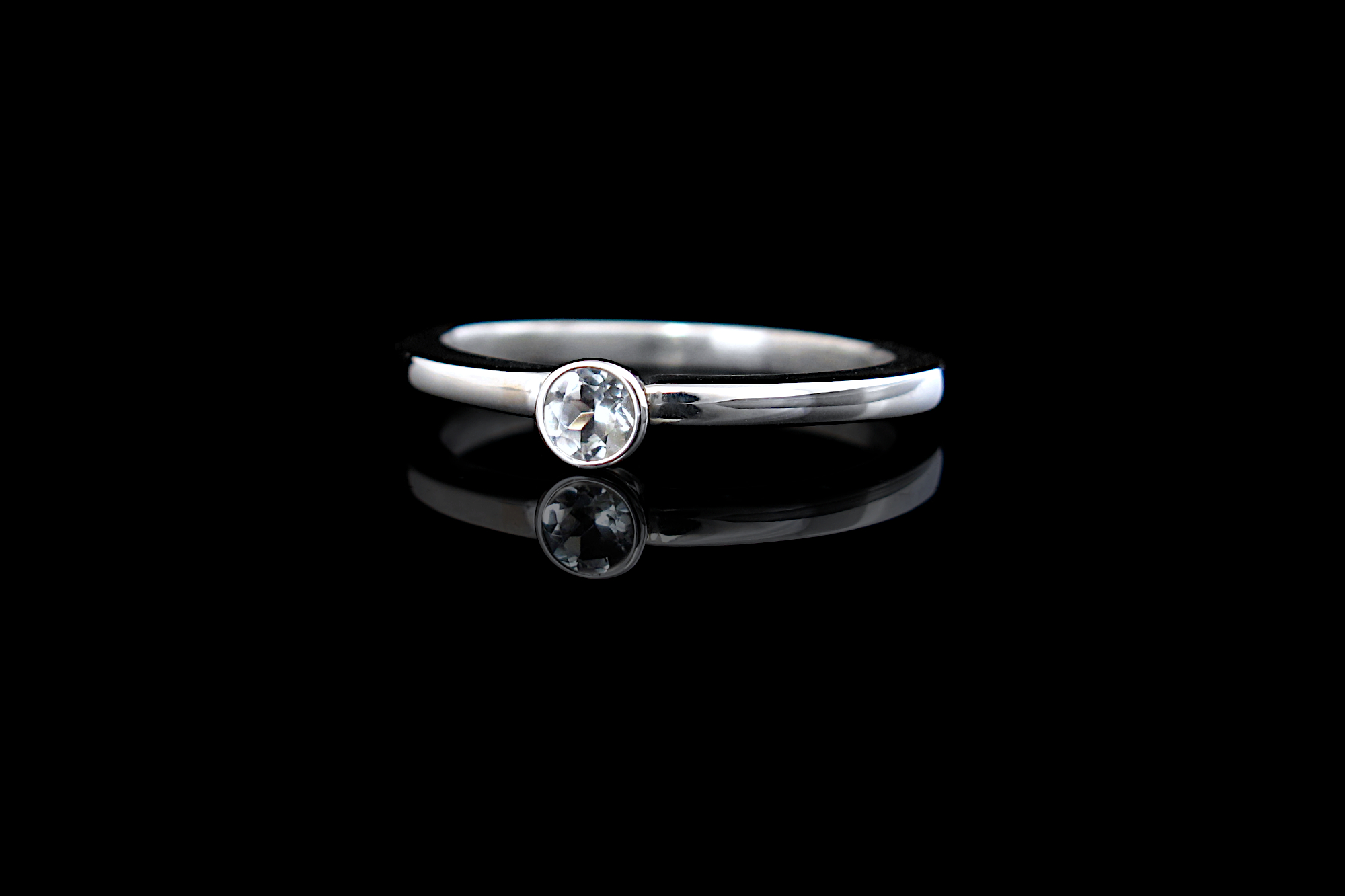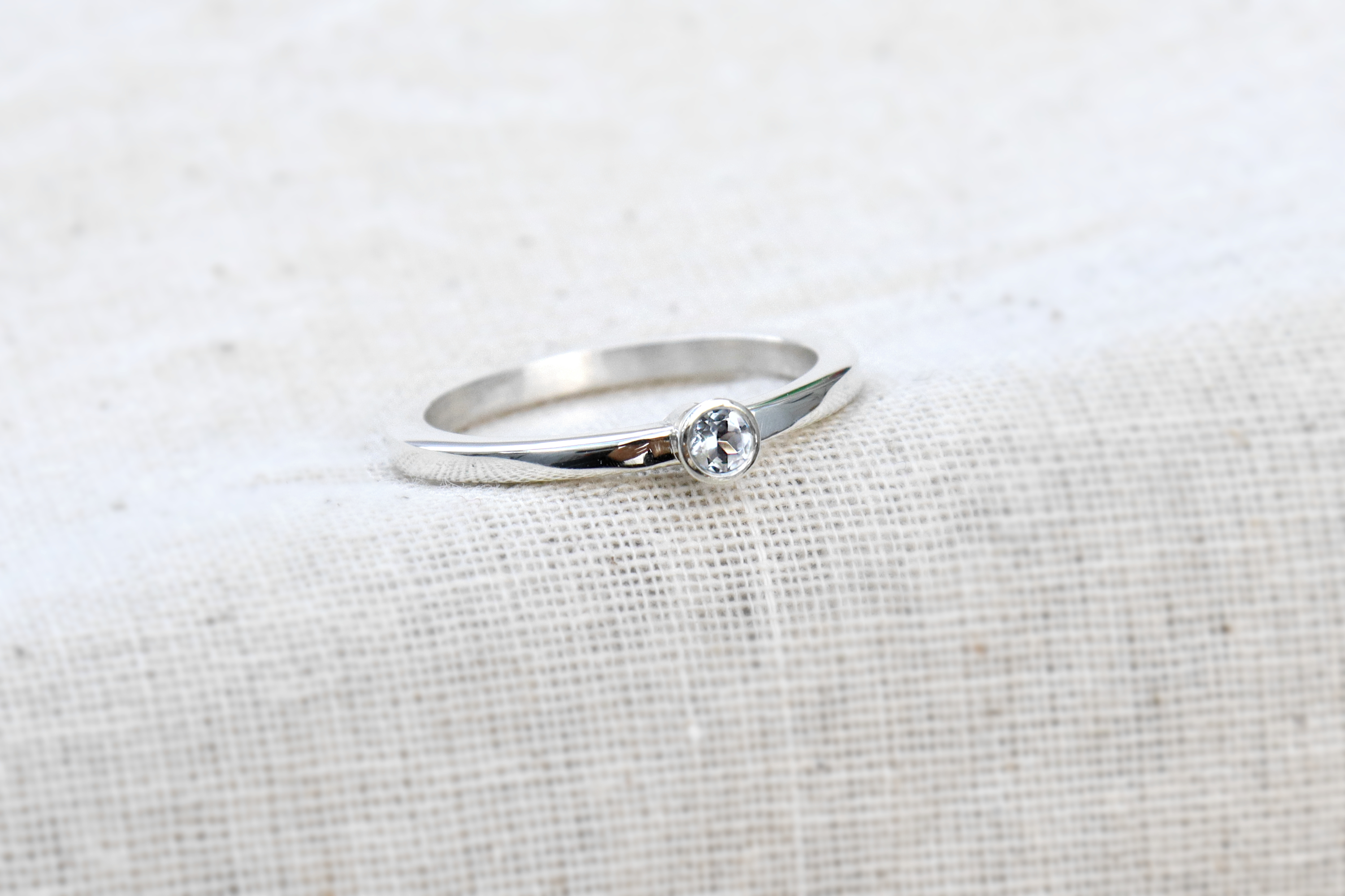 This is a Sterling silver and White Topaz ring. The silver band has a square profile, making it the same width and thickness which has a modern and minimalist look. This ring makes for a great stacking ring, as well as an alternative promise/engagement ring.
