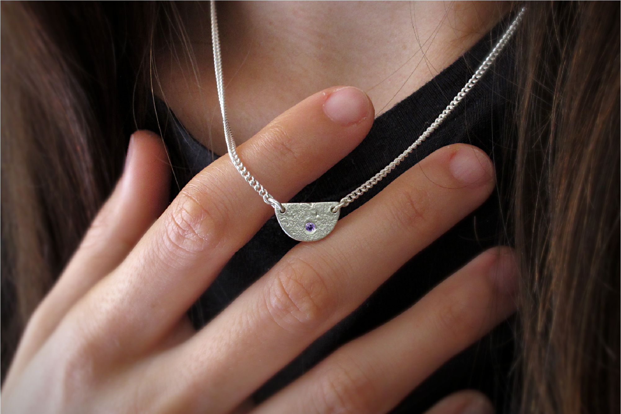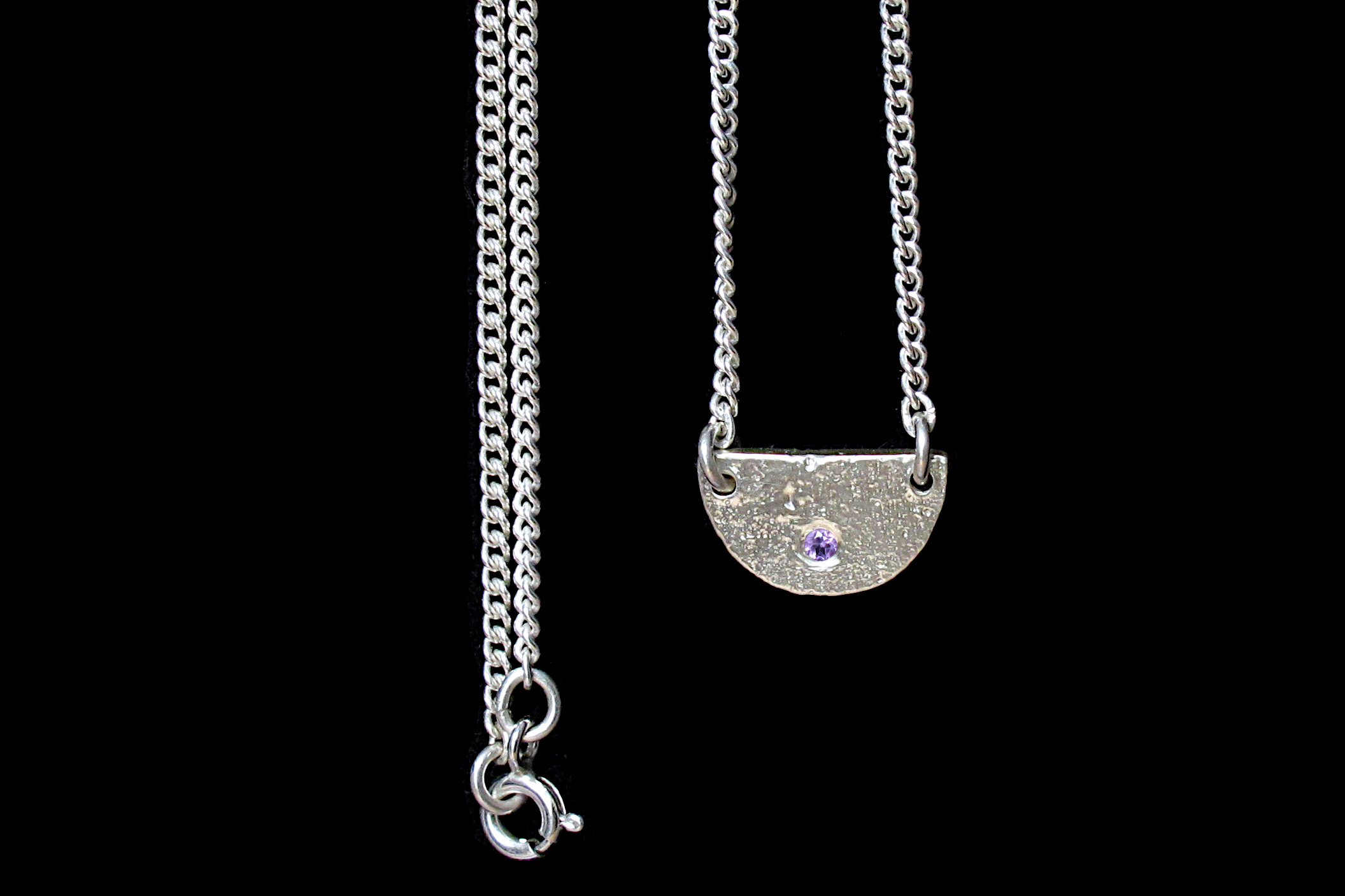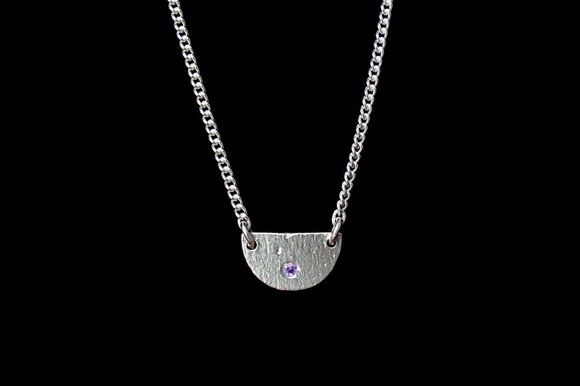 This is a sand cast Sterling silver charm with a flush set Amethyst. The casting process gives the charm its rustic texture. We then attach the chain on either side of the charm to create this beautiful necklet.