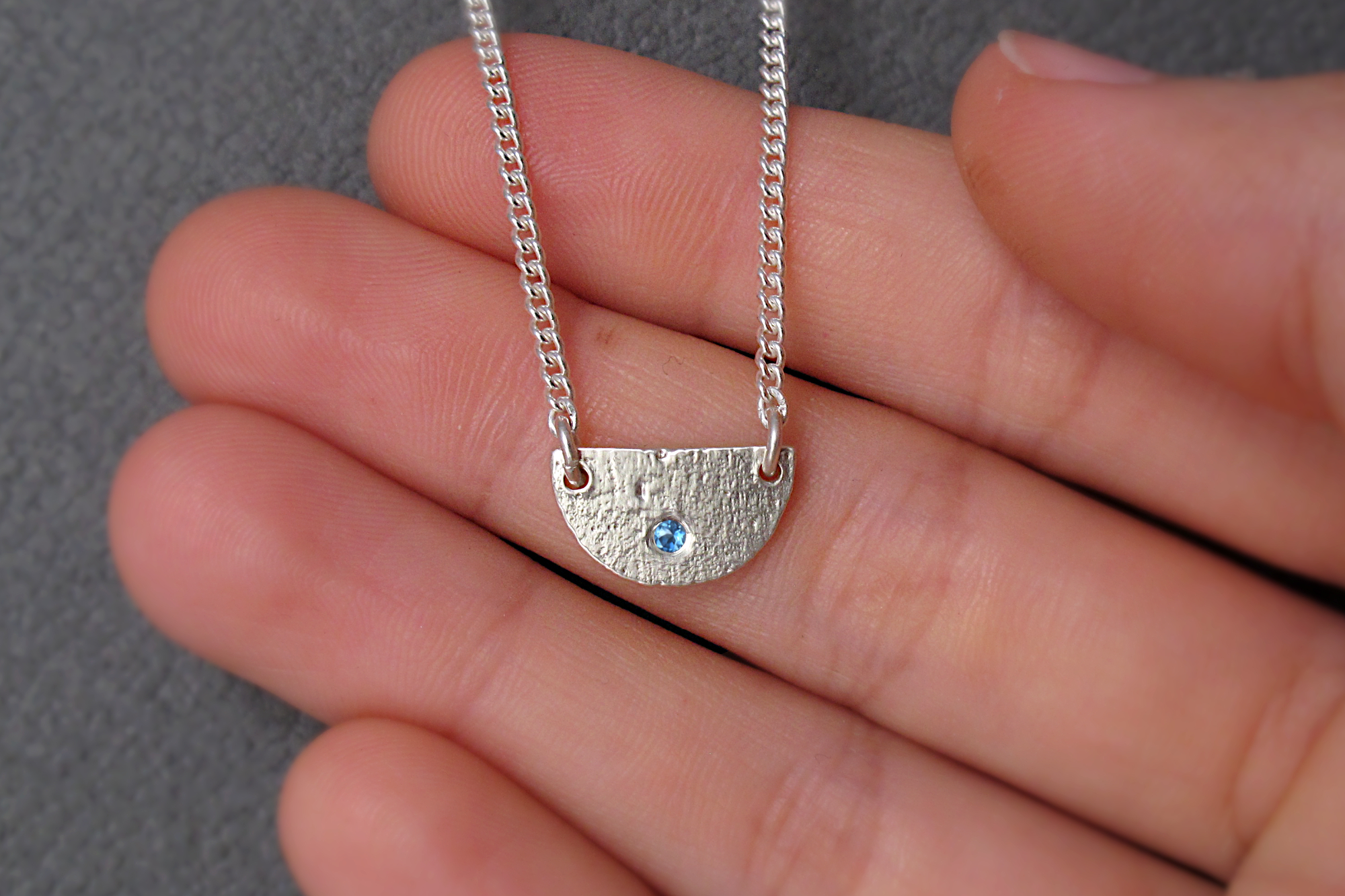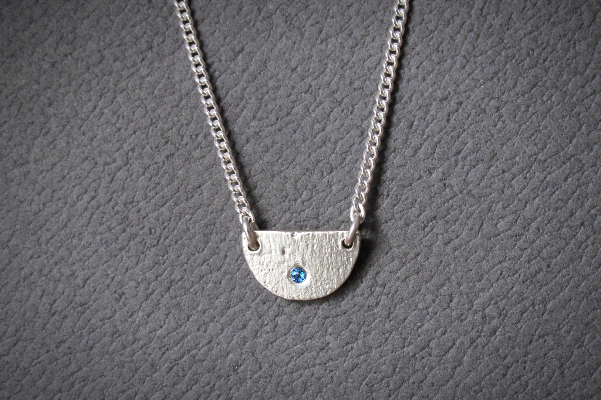 This is a sand cast Sterling silver charm with a flush set Aquamarine. The casting process gives the charm its rustic texture. We then attach the chain on either side of the charm to create this beautiful necklet.