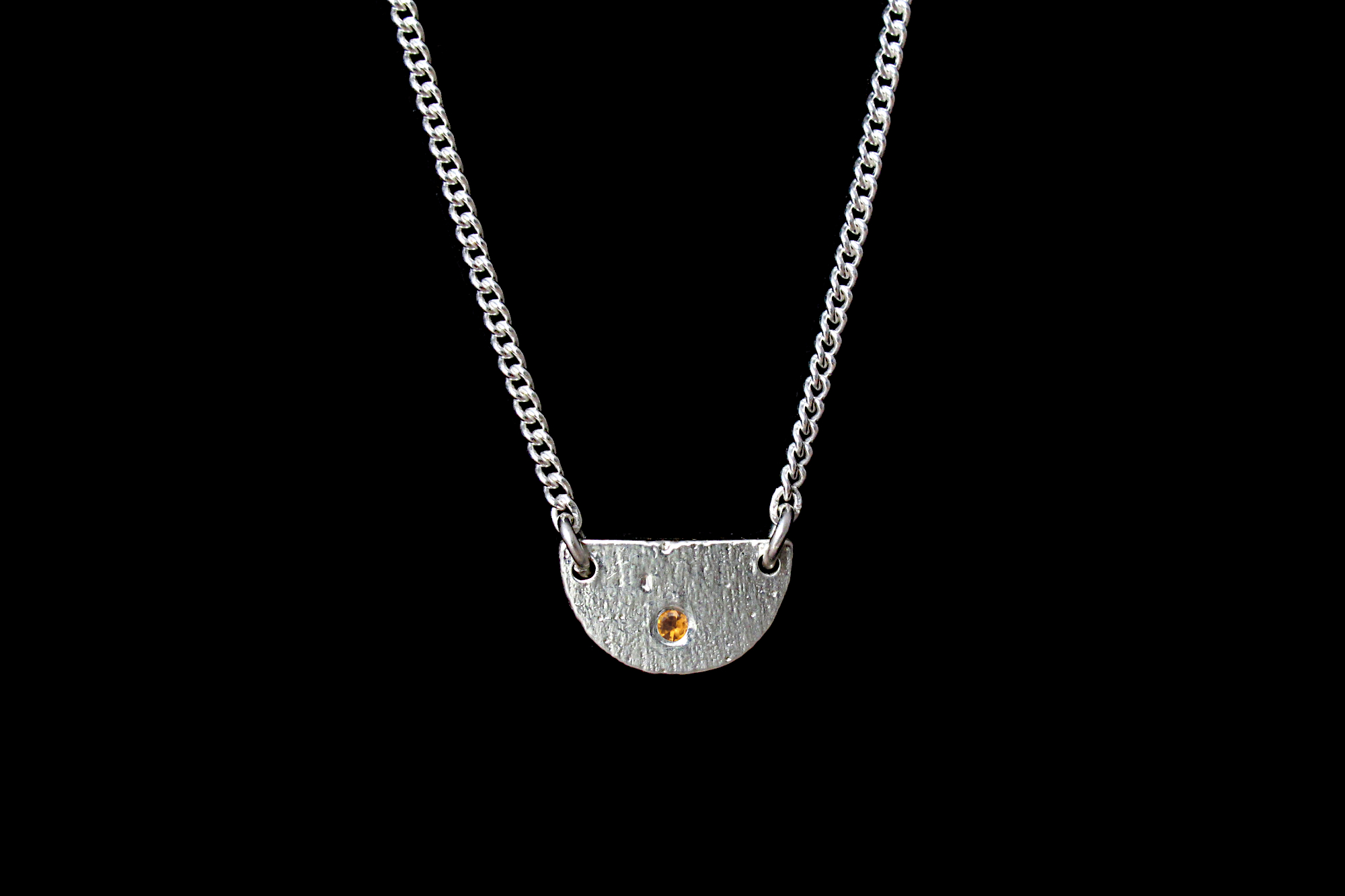 This is a sand cast Sterling silver charm with a flush set Orange Sapphire. The casting process gives the charm its rustic texture. We then attach the chain on either side of the charm to create this beautiful necklet.