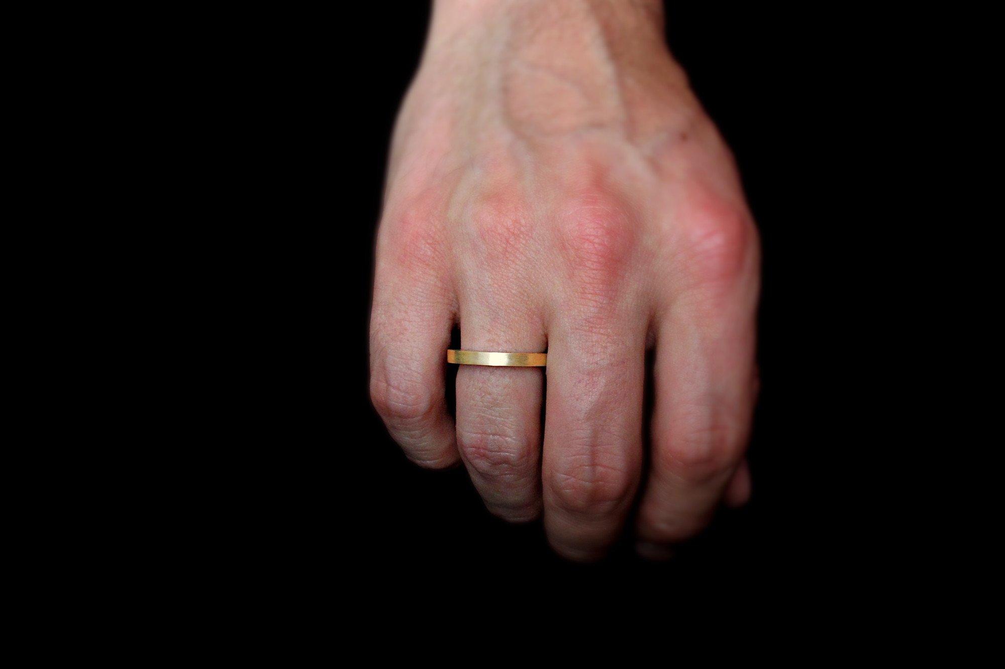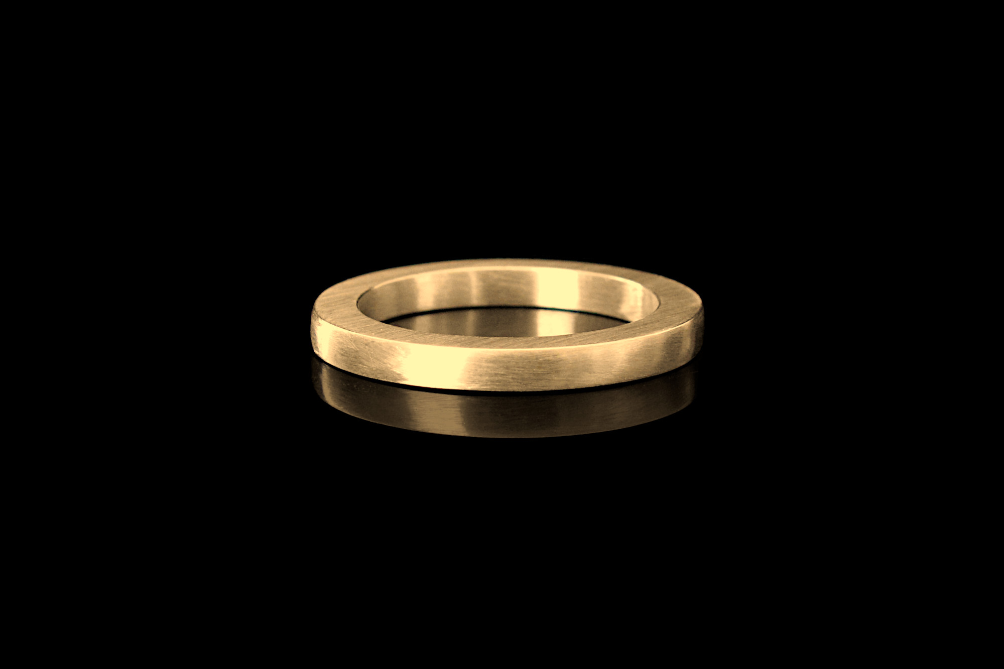 Handmade yellow gold band with square profile in 9 or 18 karat gold. This is a 3mm thick band that can be worn as a wedding band by men or as a simple gold ring.
