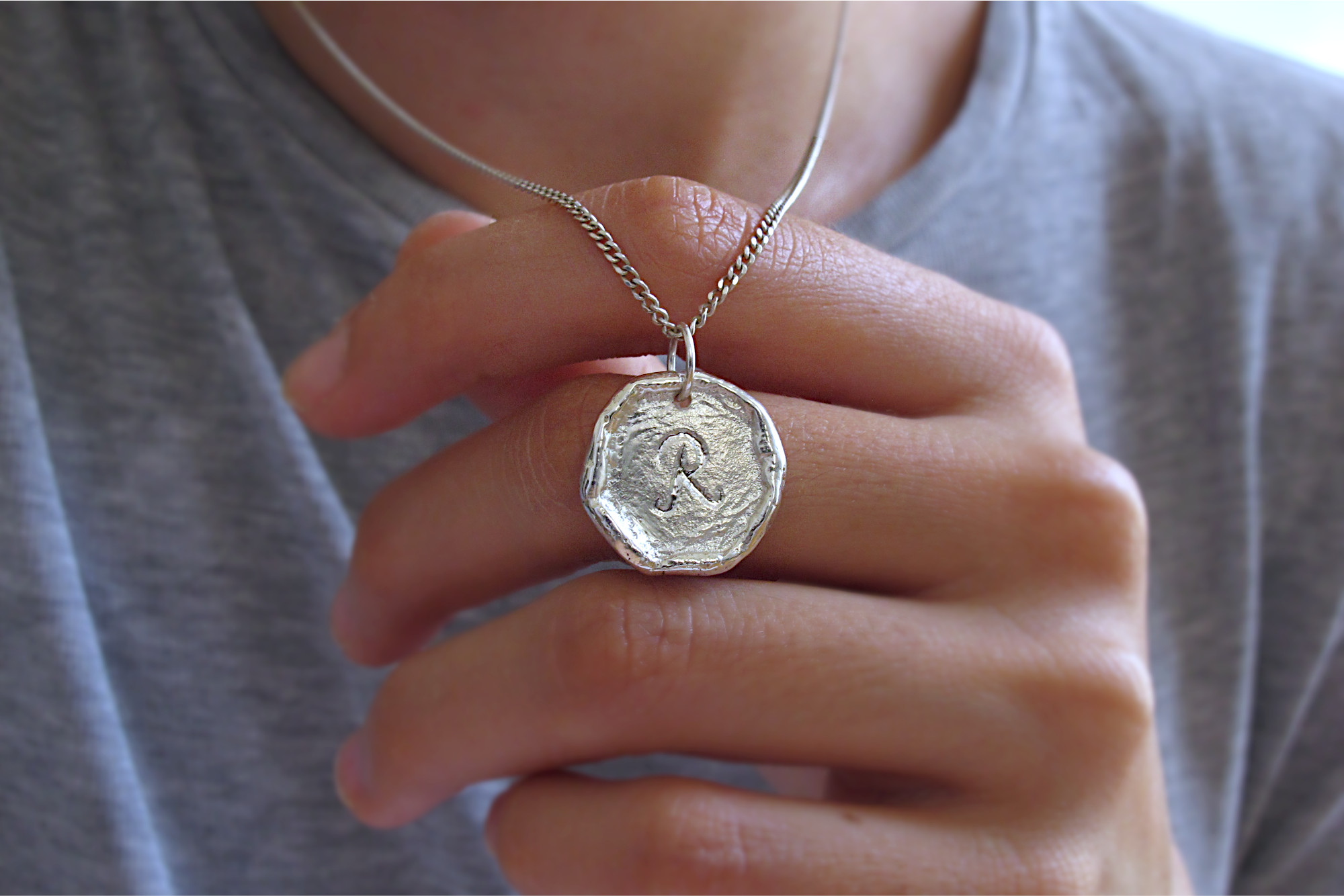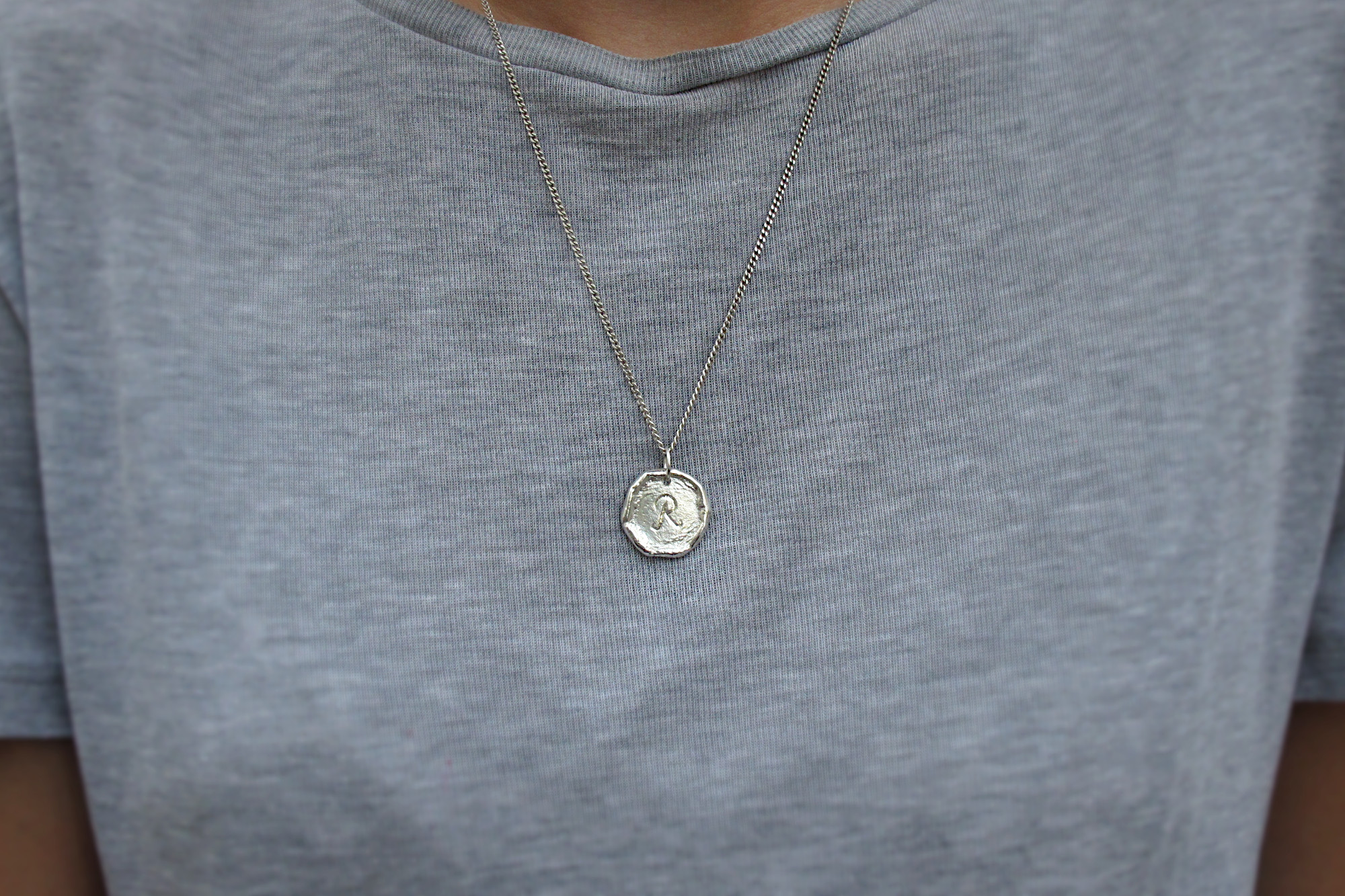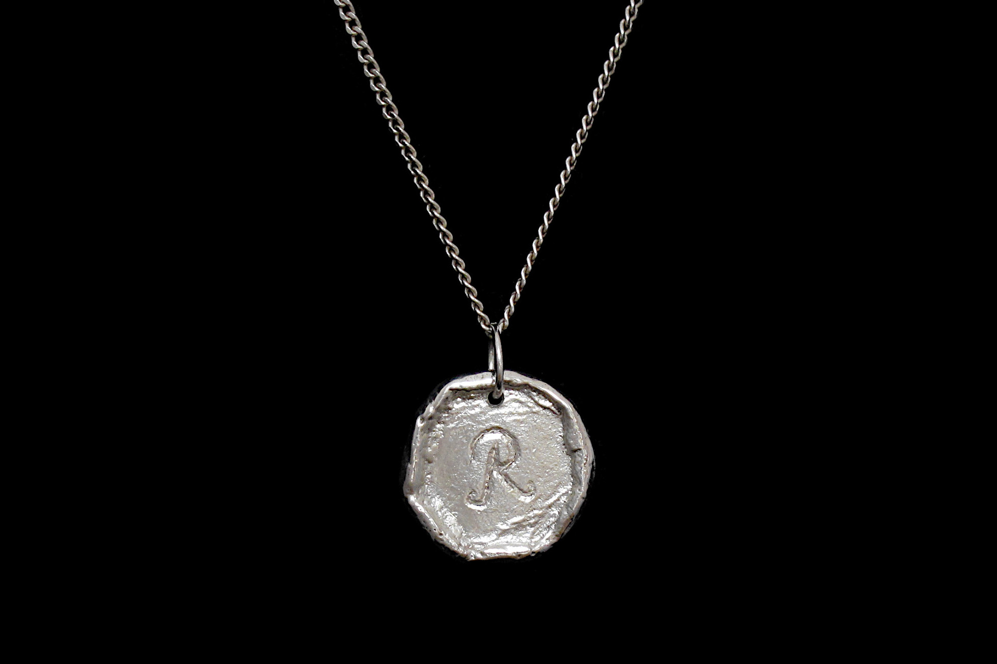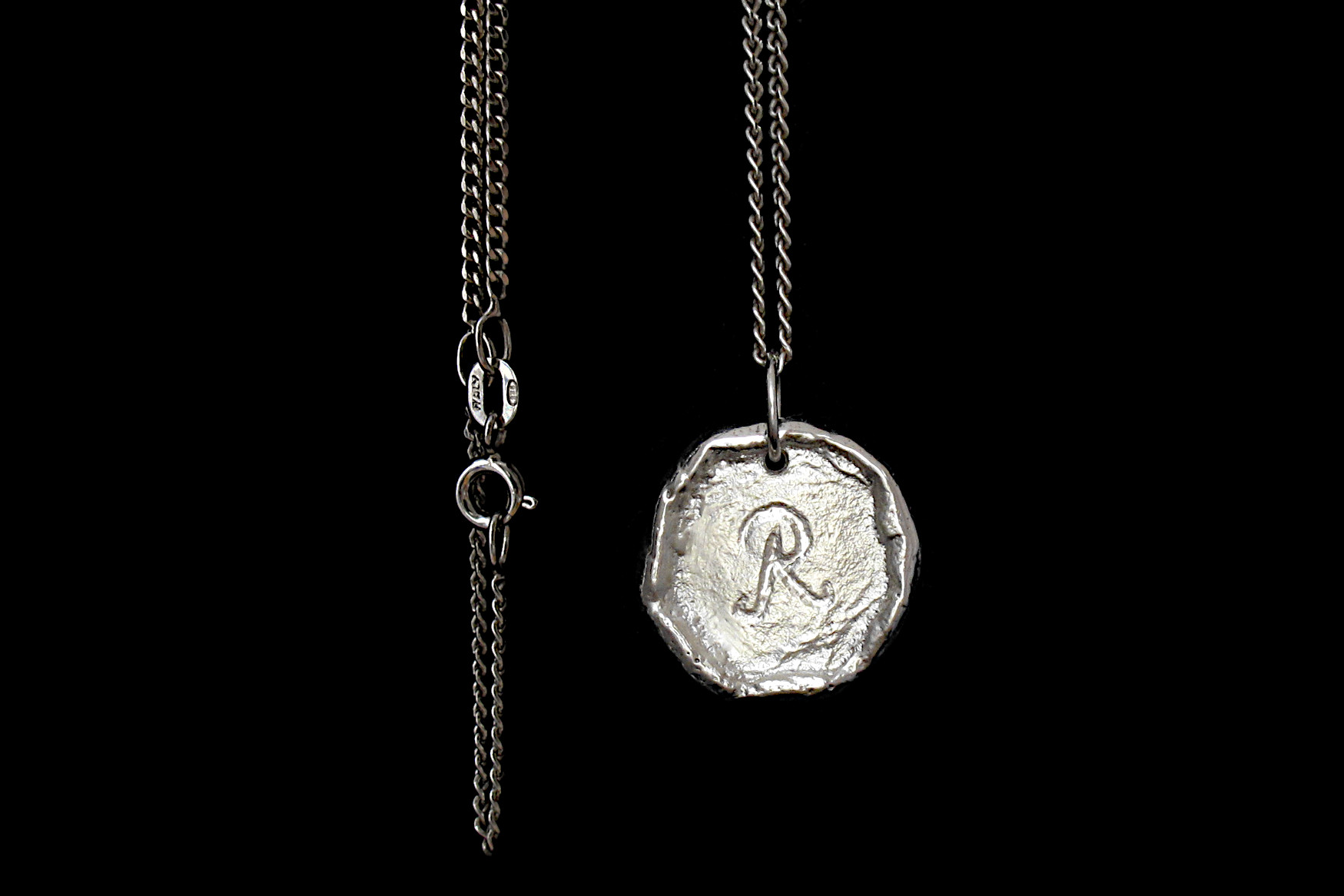 This is a Sterling silver charm with an extendable 45-50cm diamond cut curb chain. The charm is hand carved with an initial of your choice with a polished finish that resembles a melted wax stamp. We can also leave the charm blank if you prefer, simply choose ‘NONE’ when selecting the initial.