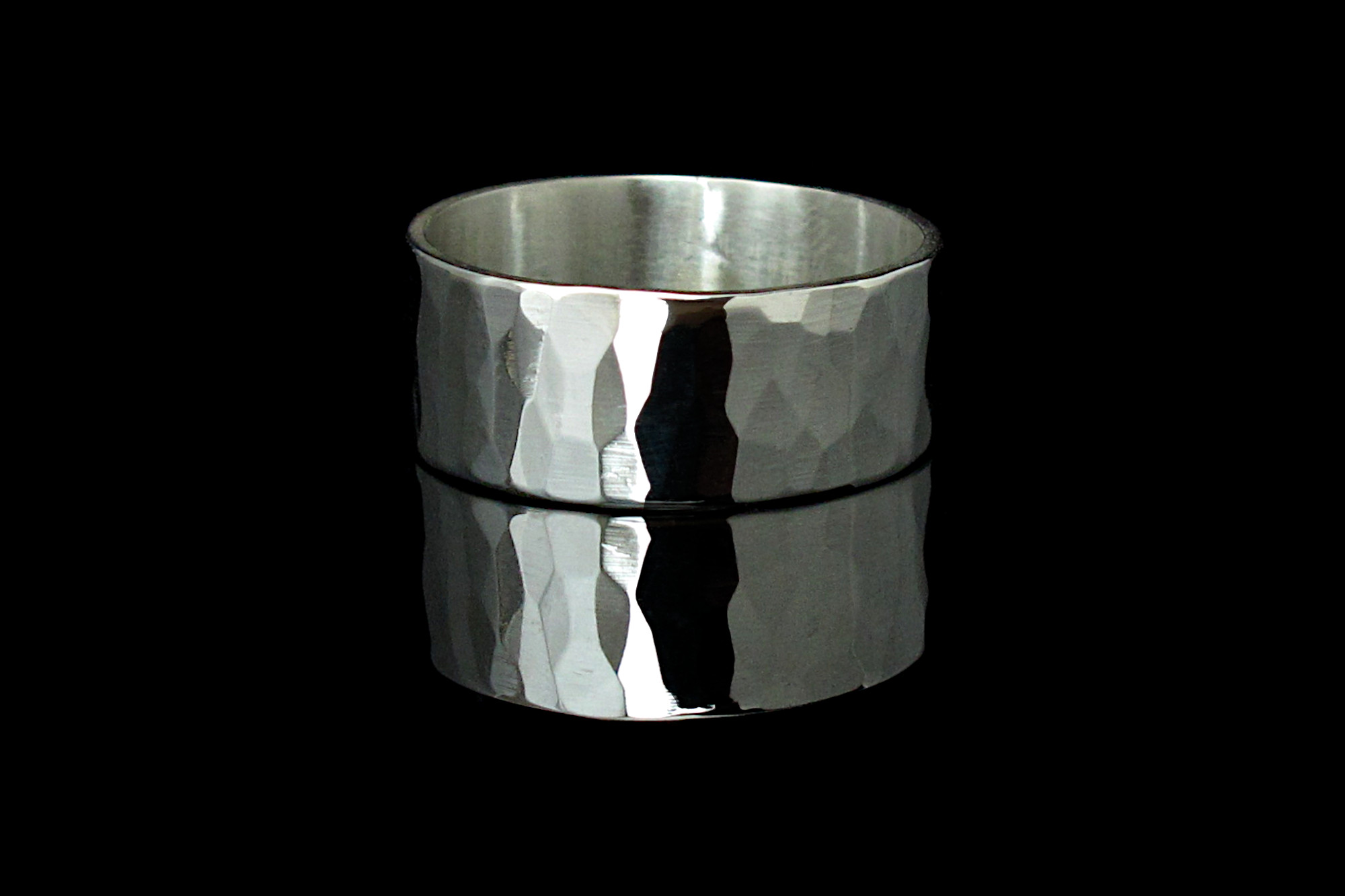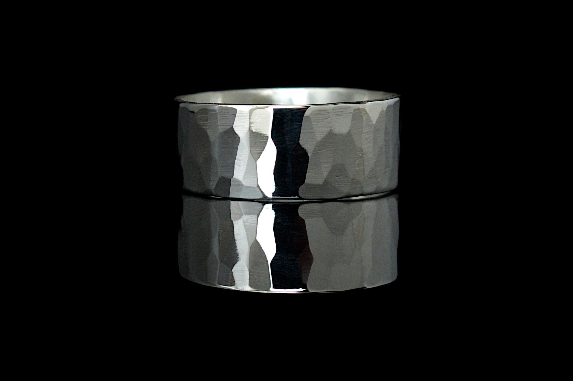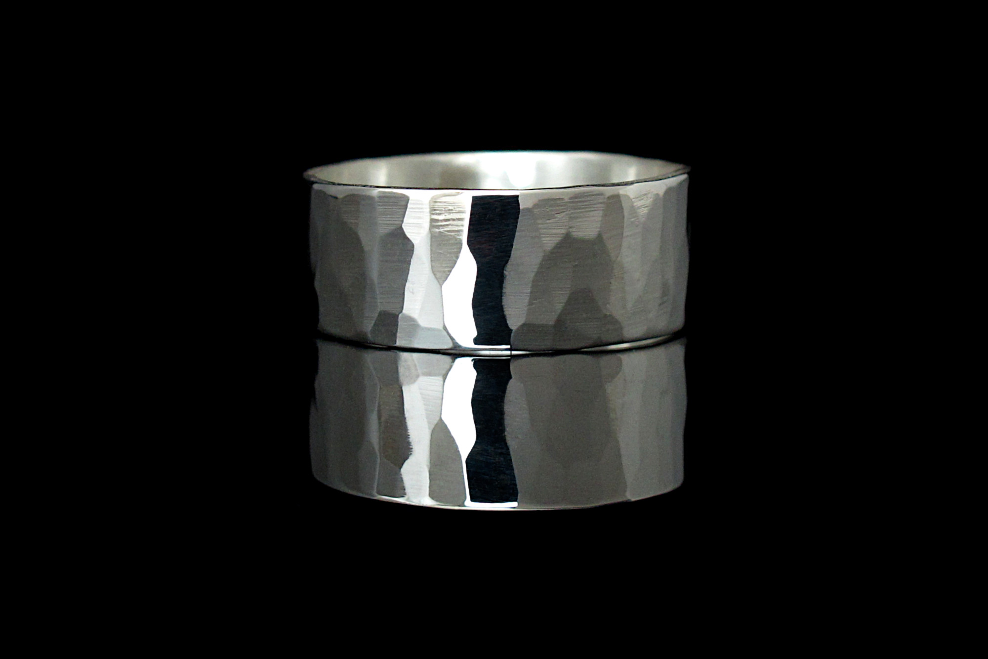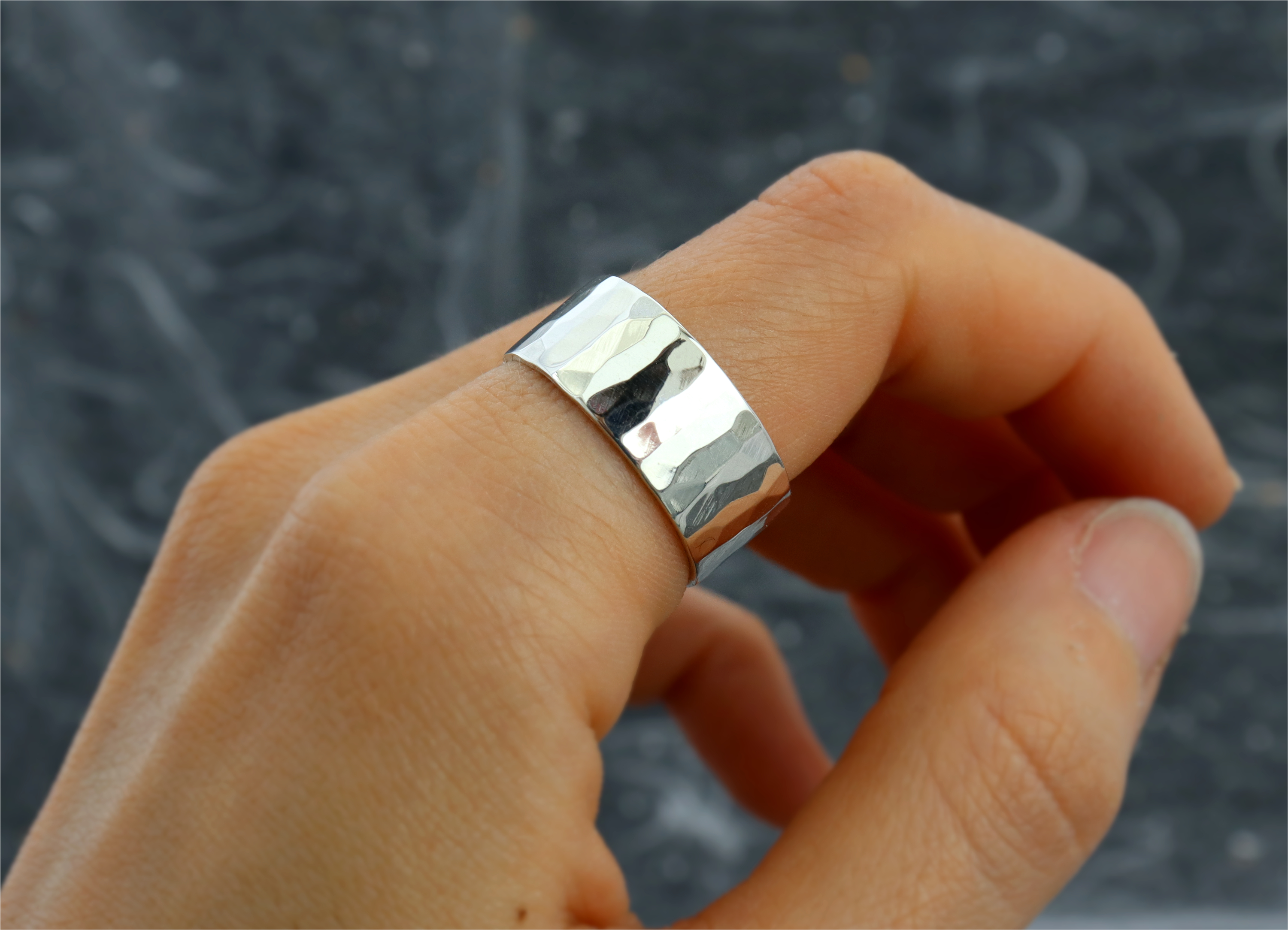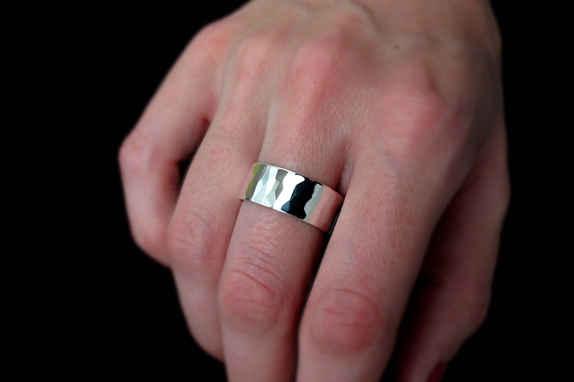 Wide Sterling silver ring with hammered texture for men and women. This ring has a mirror-finish that reflects beautifully on every face of the hammered surface.