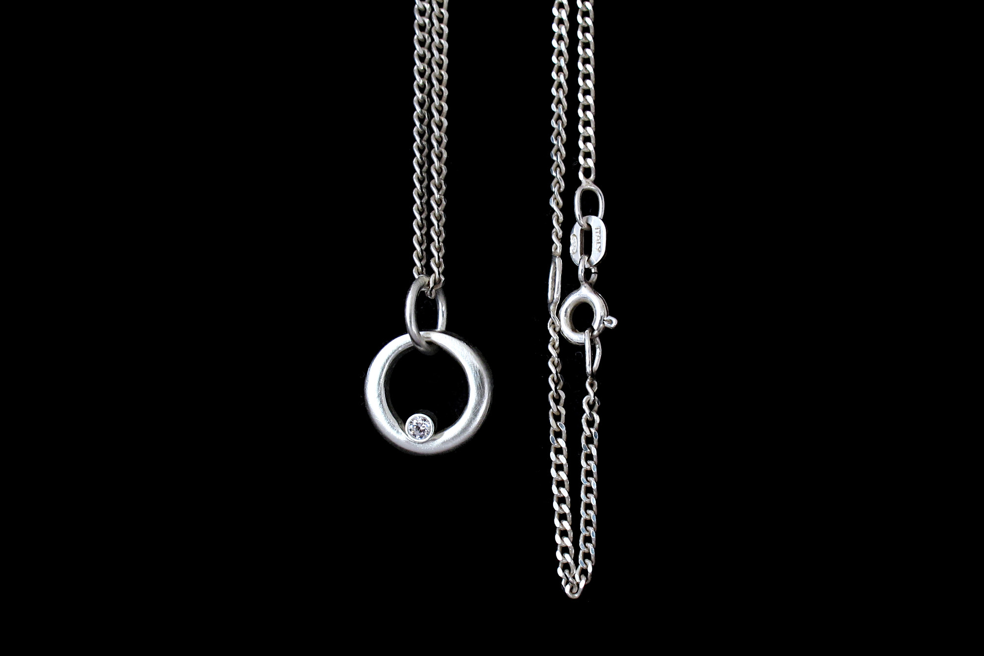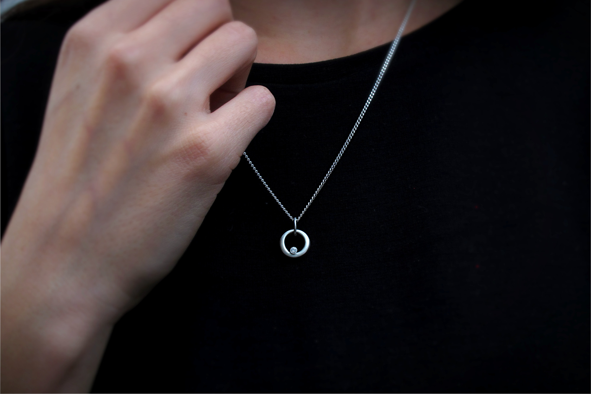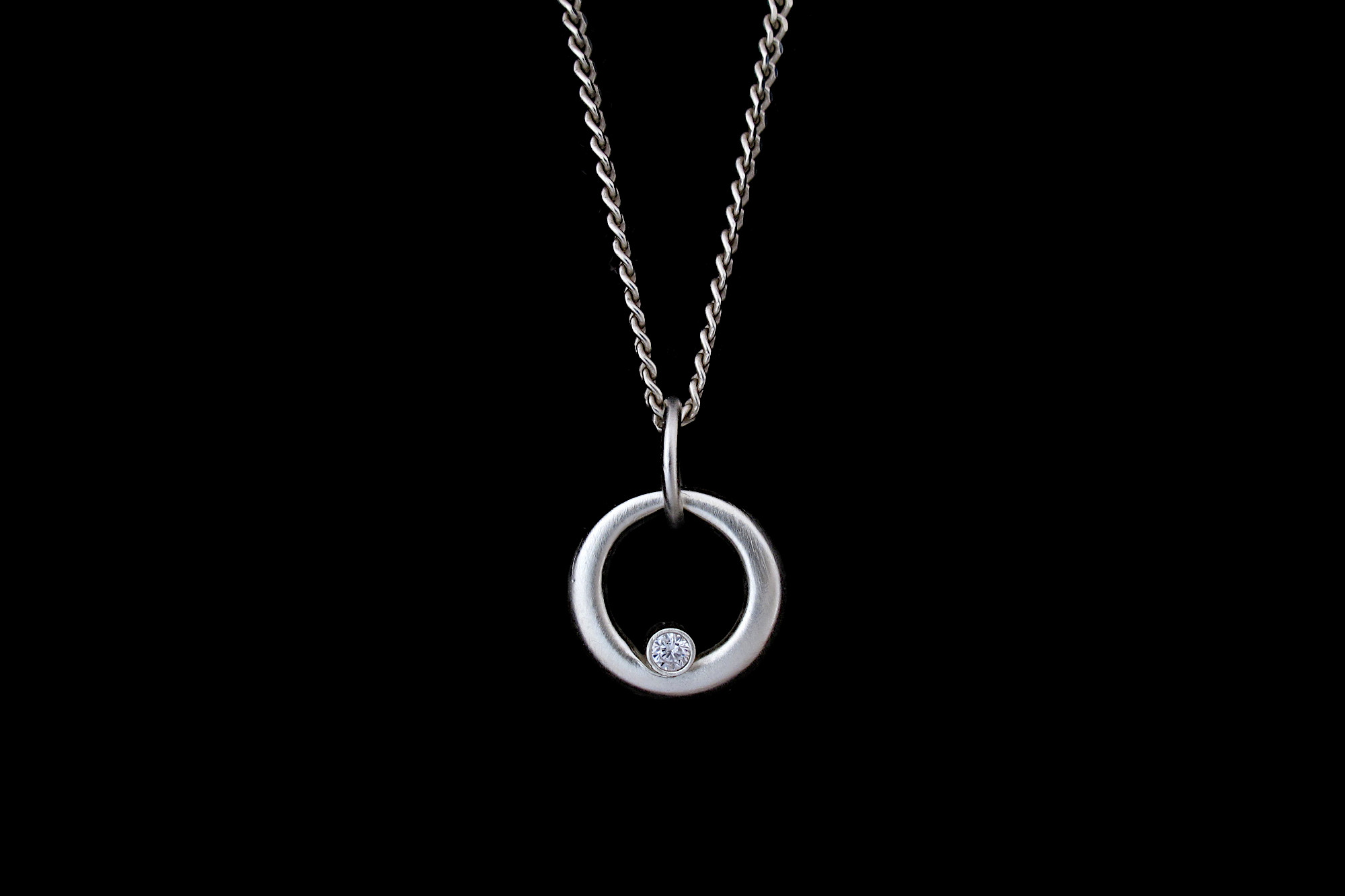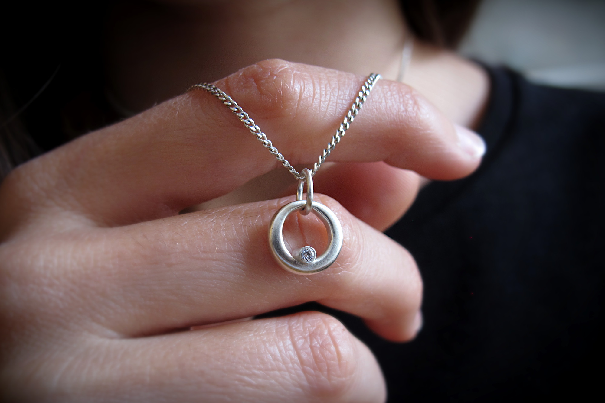 This is a Sterling silver charm with a bezel set Cubic Zirconia. The charm has a nice thickness to it, making it a weighty pendant that stays in place. To keep the minimal look of the necklace, the charm is given a brushed/matte finish.